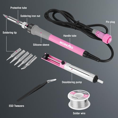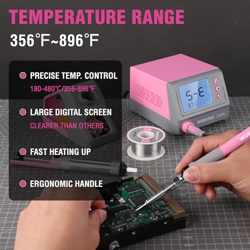 WORKPRO Soldering Station, 60W Soldering Iron Kit Digital Display, 5 Extra Iron Tips, Precision Temperature Control Solder Station for Electronic Repair, DIY Enthusiasts, Jewelry Makers - Pink Ribbon