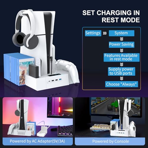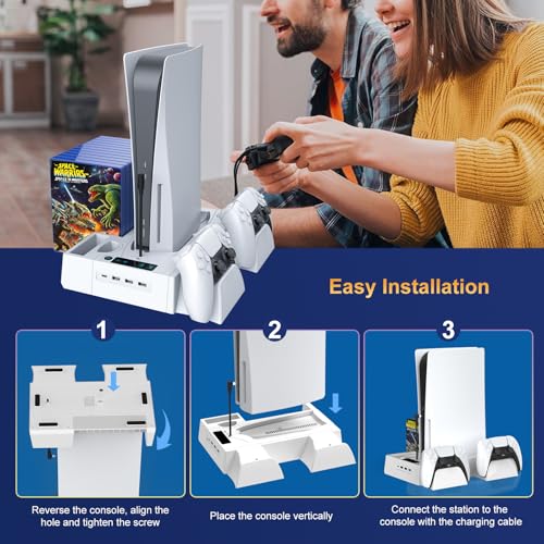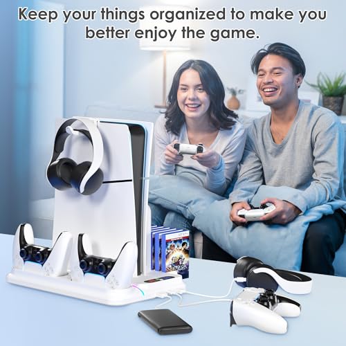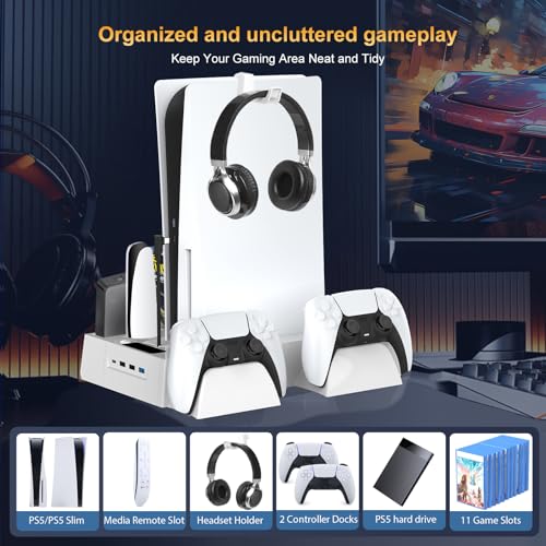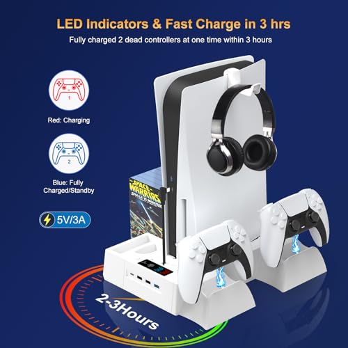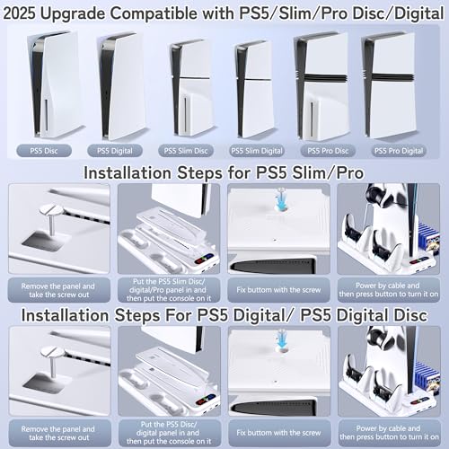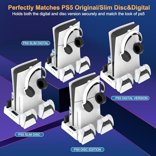PS5/Slim Cooling Station for PS5 Disc&Digital, PS5 Cooling Stand with Dual Controller Charging for PlayStation 5 Console, Multi-Function PlayStation 5 Accessories Controller Charger with Storage Slot