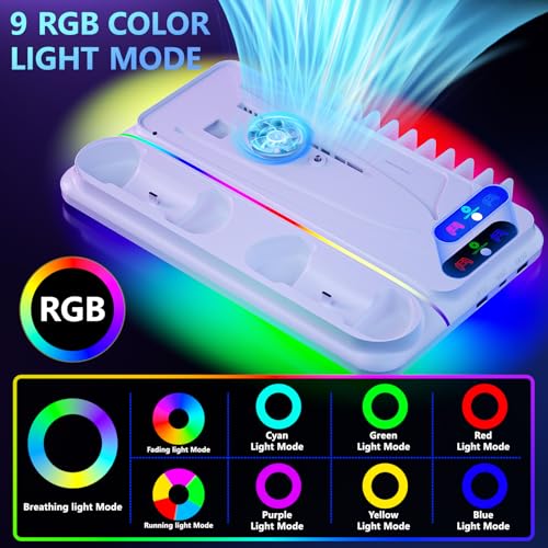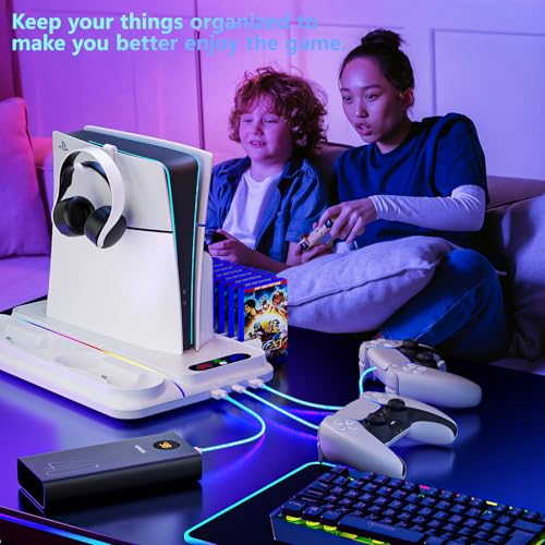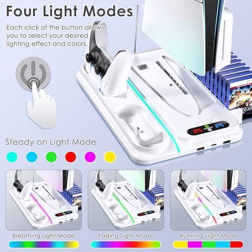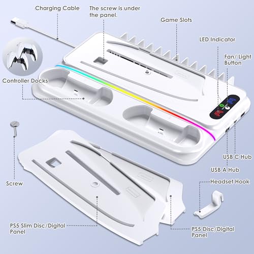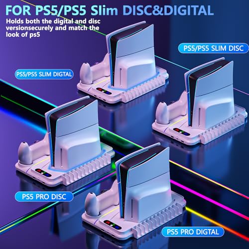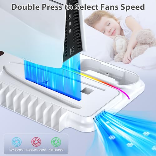 PS5 Cooling Station for PS5/Slim/Pro Disc Digital Console,PS5 Fan Cooling Fan with Dual PS 5 Controller Charger,3 Level Fan, RGB Light,12 Slot, PS5/Slim/Pro Stand for PlayStation 5 Console Accessories
