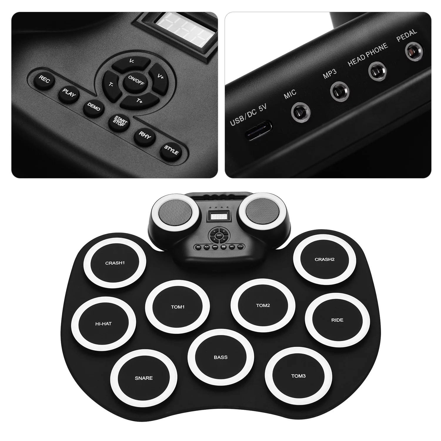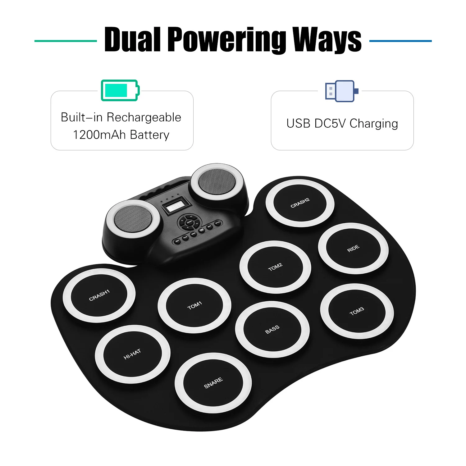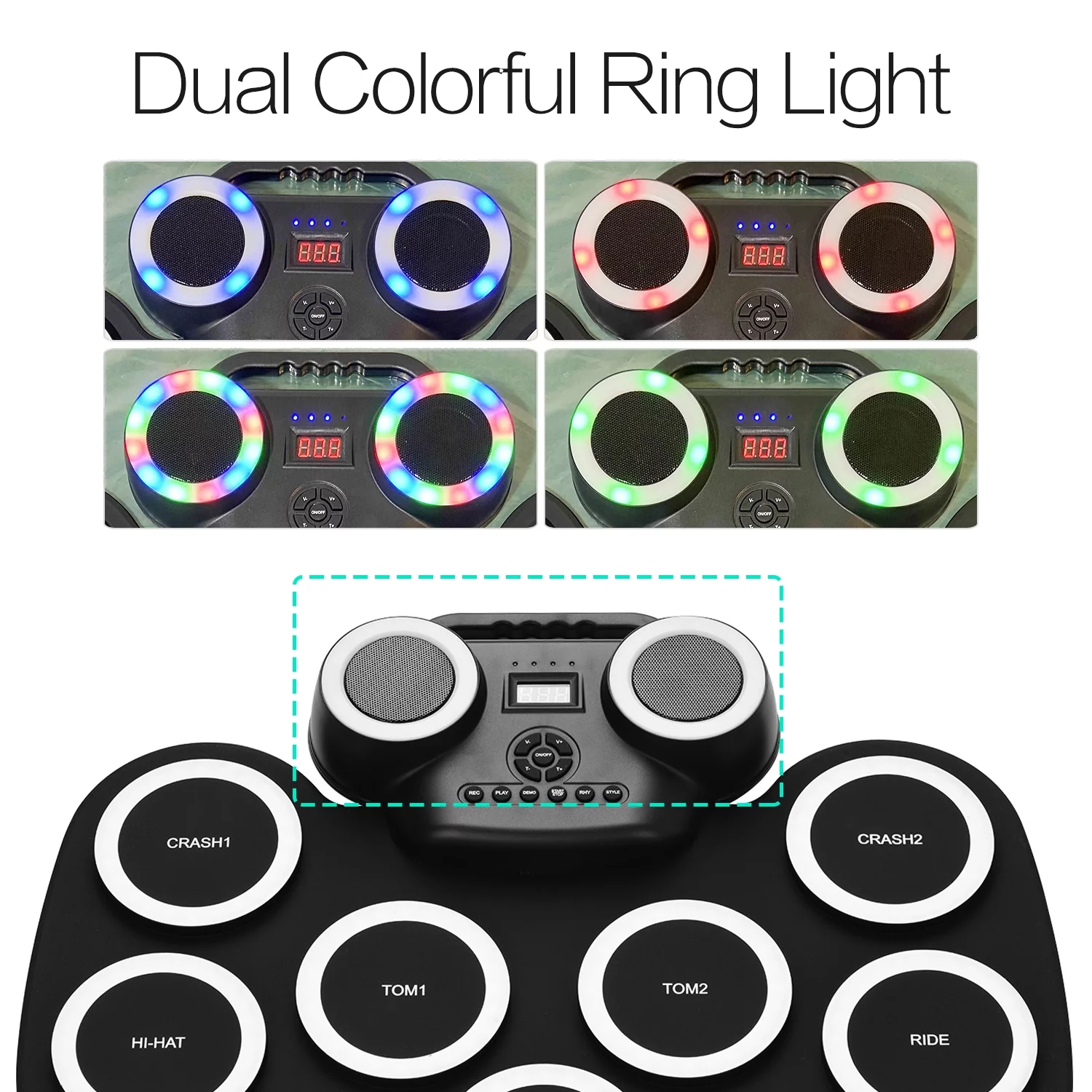 Meterk Portable Roll-up Electronic Drum Pad Silicon Digital Drum with Built-in Speakers Foot Pedals Headphone Monitoring Colorful Light Built-in Battery