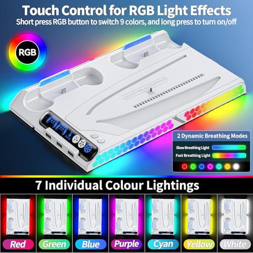 KDD PS5/Slim/Pro Cooling Station with Dual Charger Station for All PlayStation 5 Disc & Digital, PS5 Stand Base with Auto Cooling Fan by Temp Control & 9 LED Lights,PS5 Accessories Docking Station