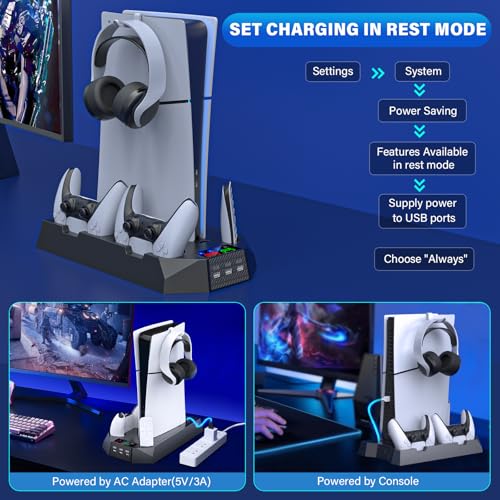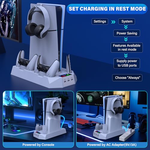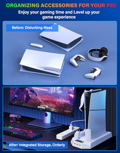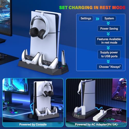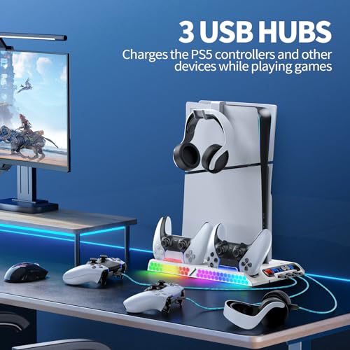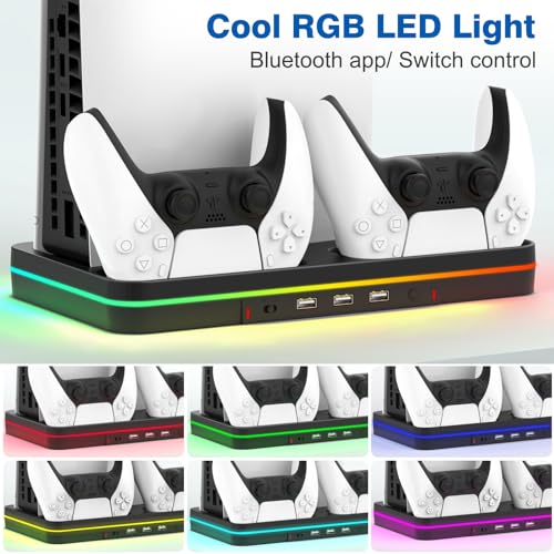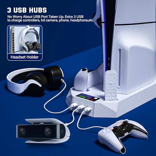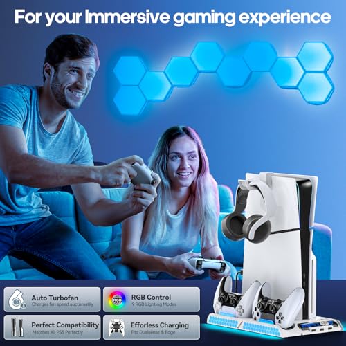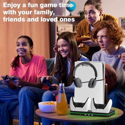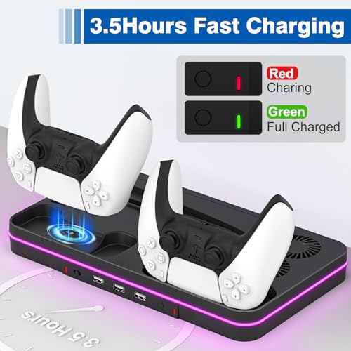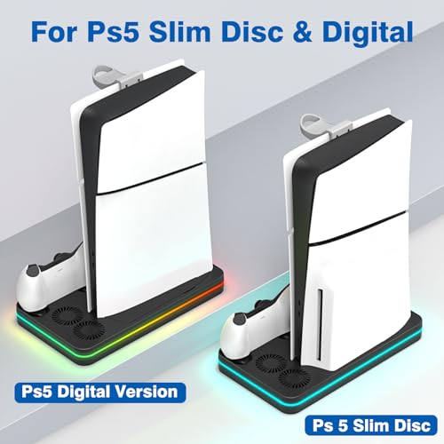 Ps5 Slim Console Cooling Station,Ps5 Slim(Disc & Digital Editions) Stand Accessories with 2 Cooling Fan&2 Controller Charging Station,PlayStation 5 Cooling Stand with RGB Light,Headset Holder,3 USB