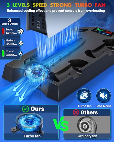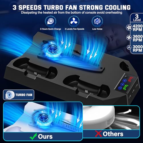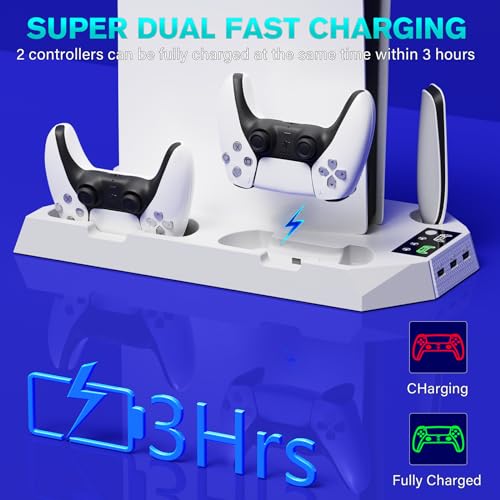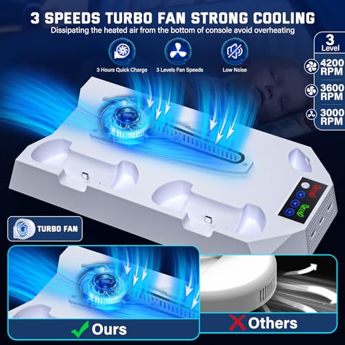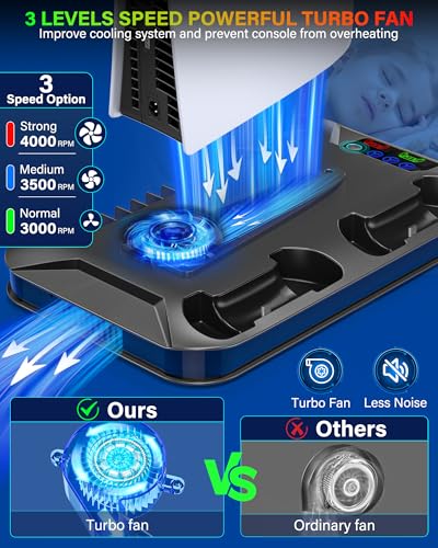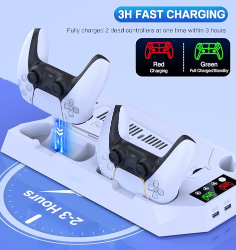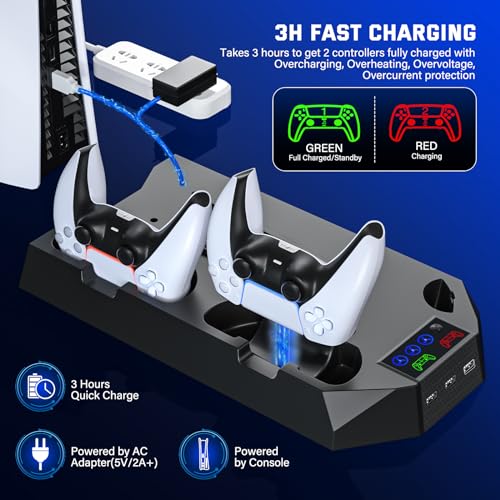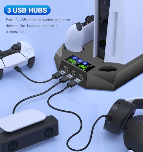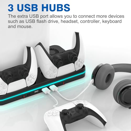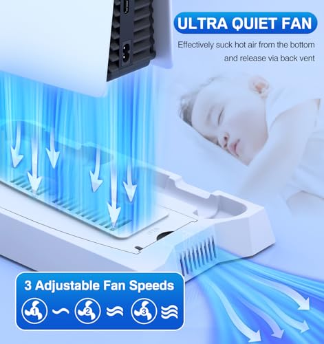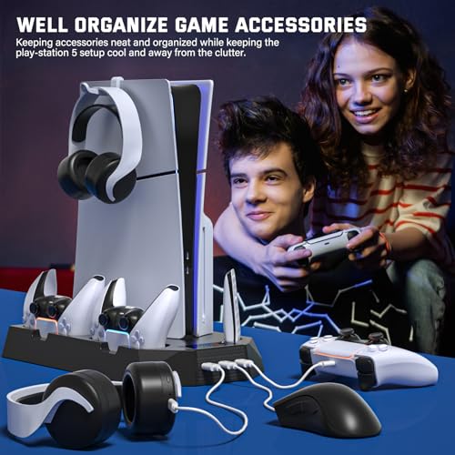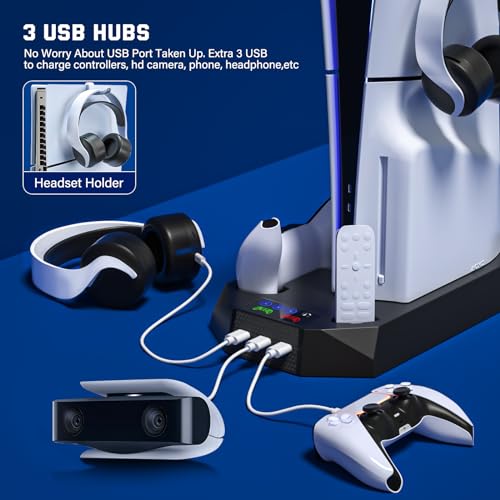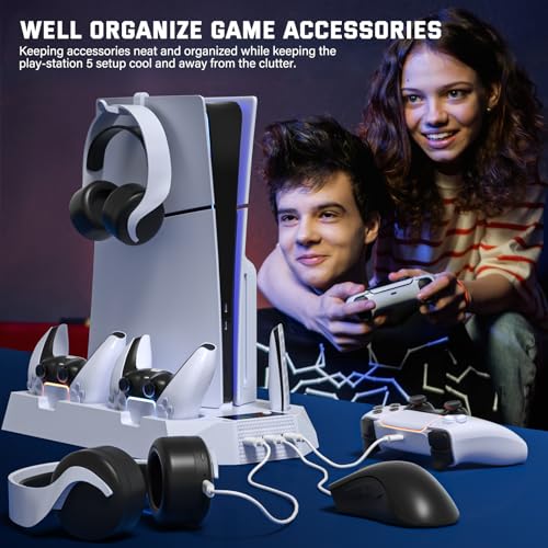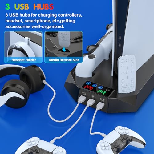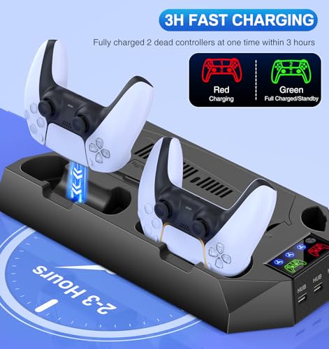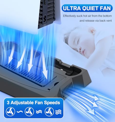 Cooling Station for PS5 & PS5 Slim Console Disc/Digital Edition, Stand Compatible with PlayStation 5, Charging Station with Dual Controller Charger, 3 Levels Cooling Fan, 3 USB Hubs & Headset Holder