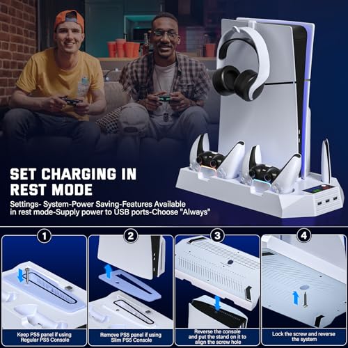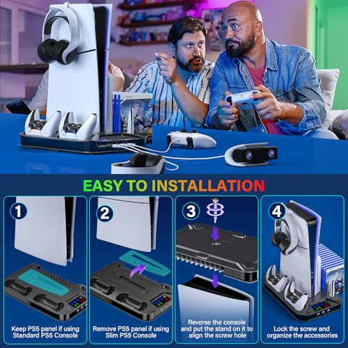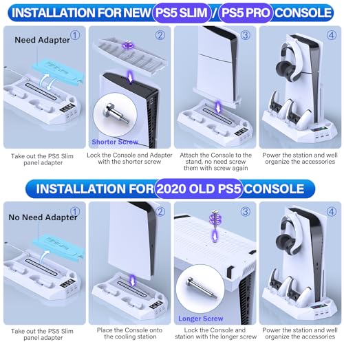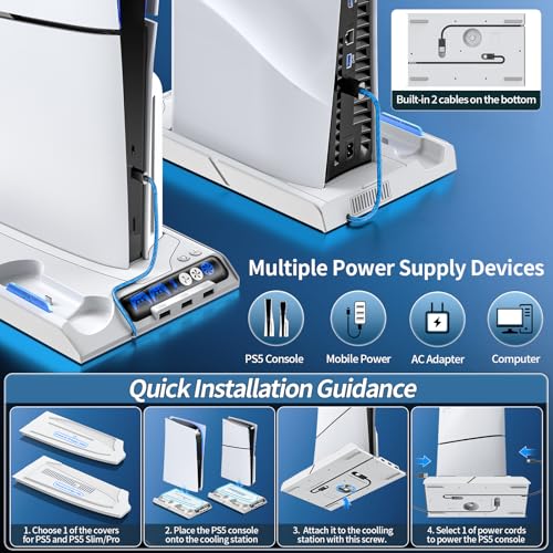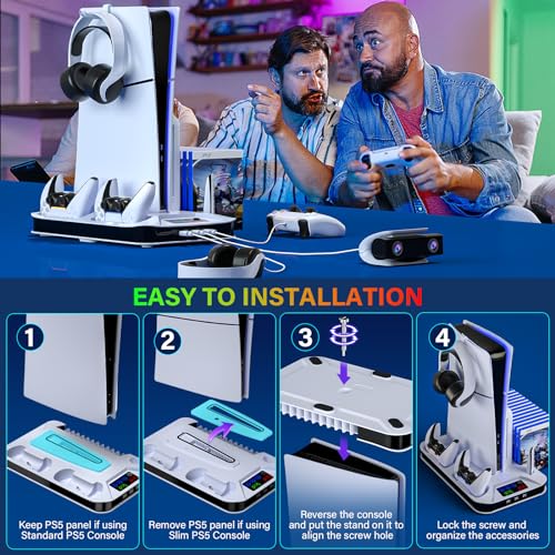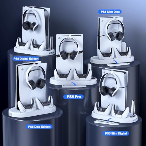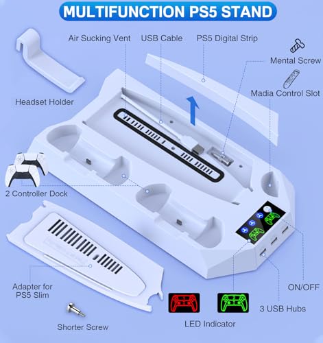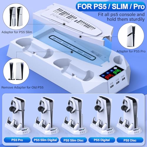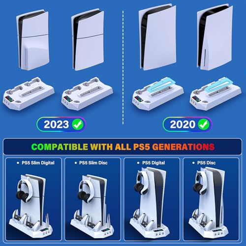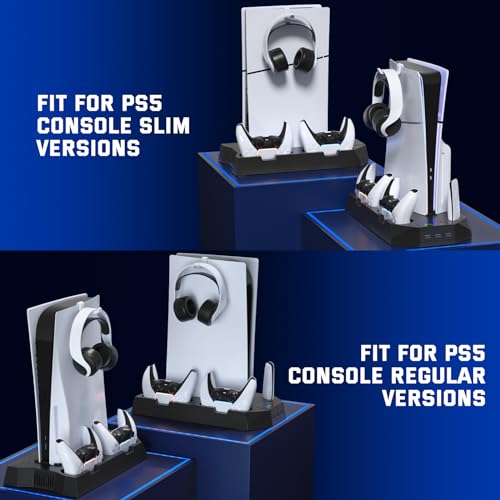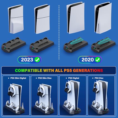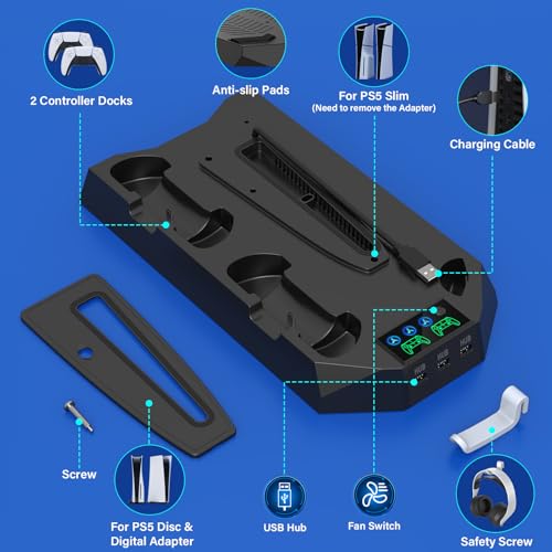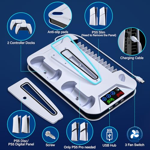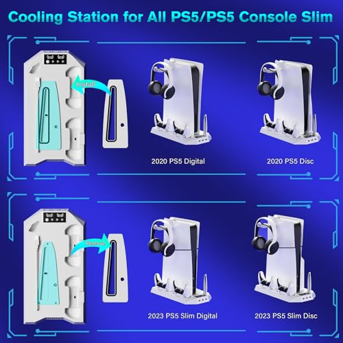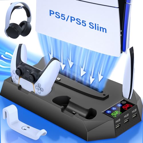PS5/PS5 Slim Cooling Station with Controller Charging Station for Playstation 5 Slim&Standard Disc/Digital Console, PS5 Slim Stand Cooler Accessories Incl Cooling Fan/3 USB Hubs/Headset Holder/Screw