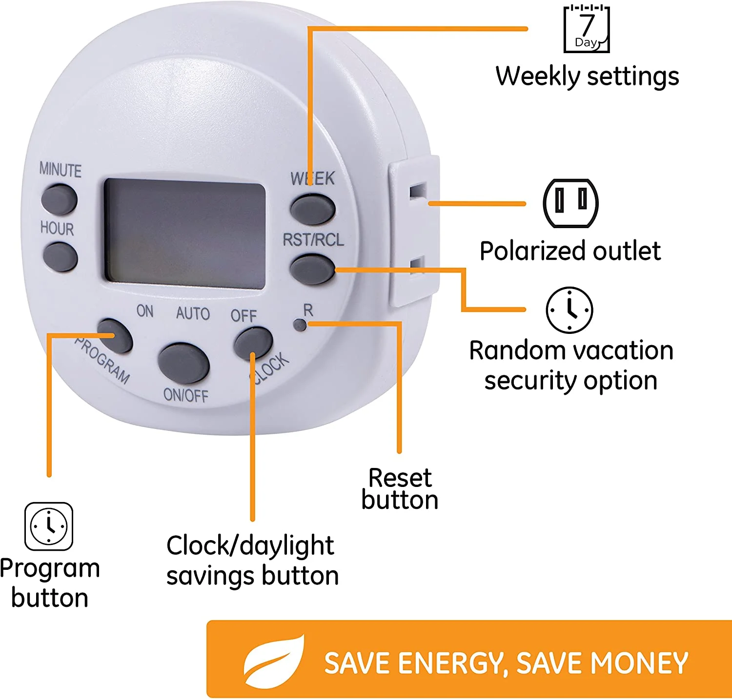 GE 7-Day Programmable Digital Timer, 1 Outlet Polarized, Plug-In Indoor, LED, CFL, Incandescent, Ideal for Lamps, Portable Fans, Seasonal Lighting, Small Appliances, 15154