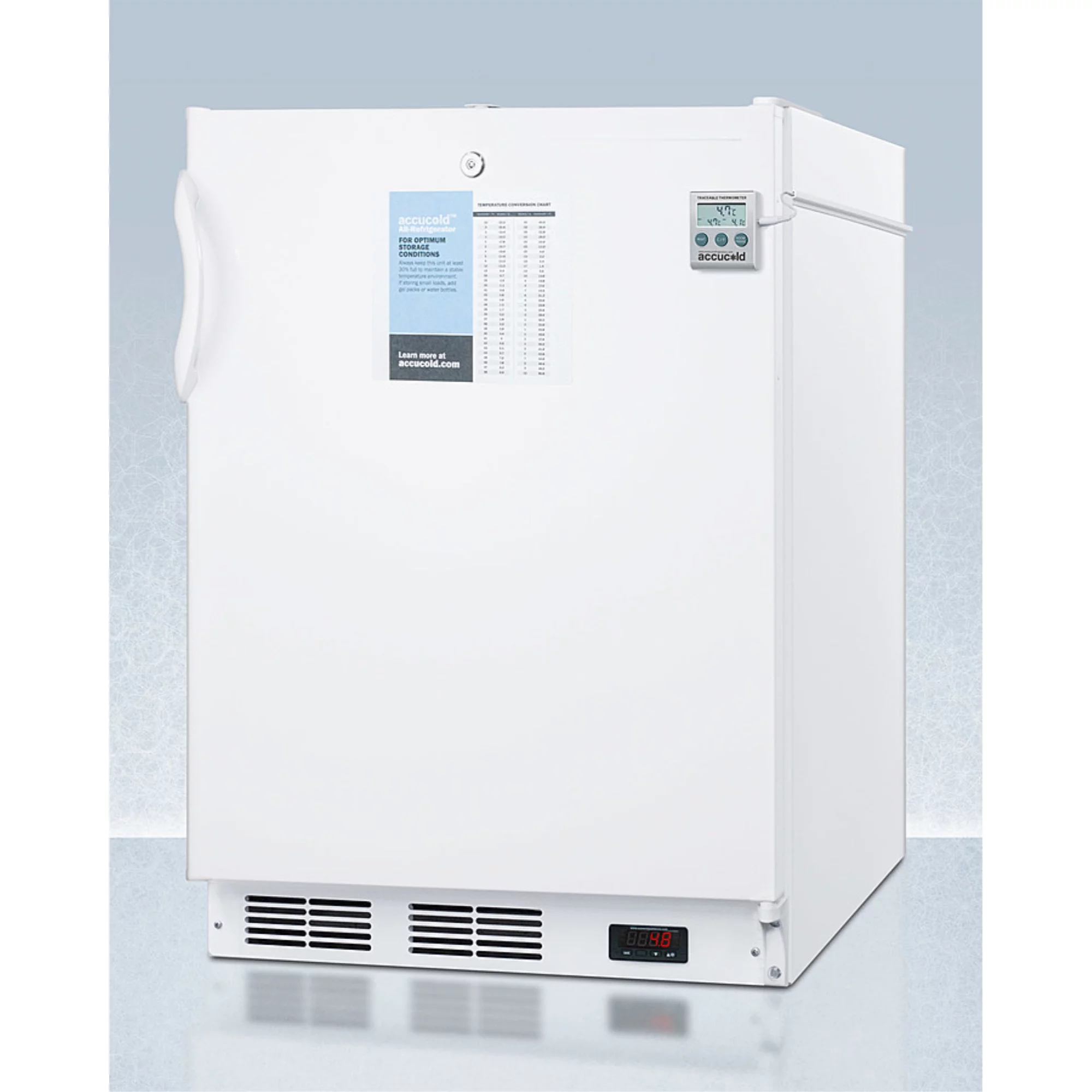 ADA compliant 24" wide freestanding all-refrigerator in white, auto defrost with a lock, NIST calibrated thermometer, digital thermostat, and internal fan