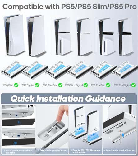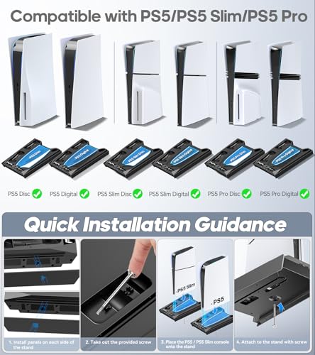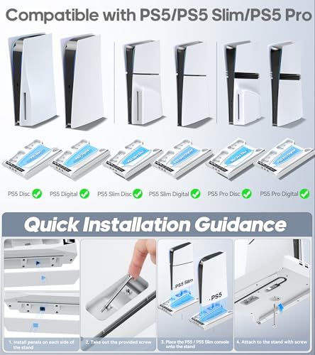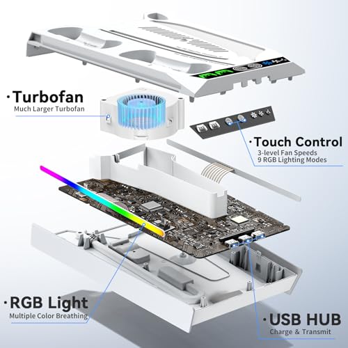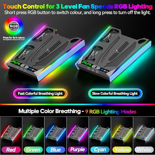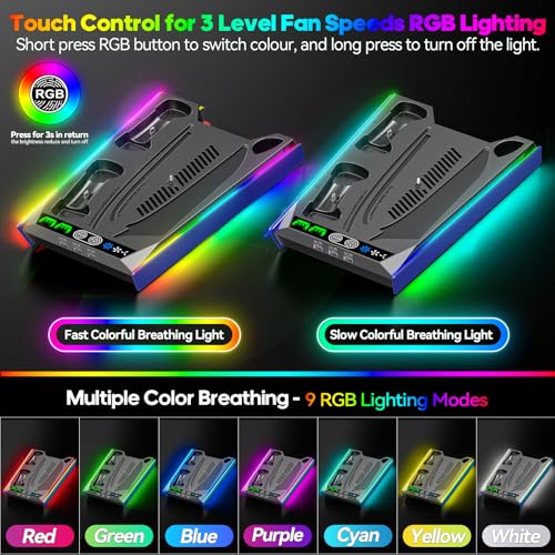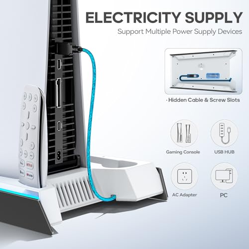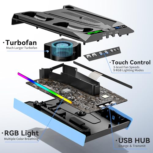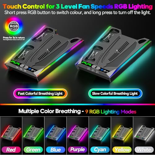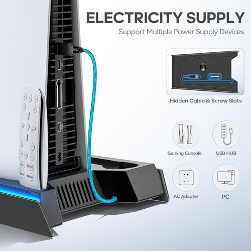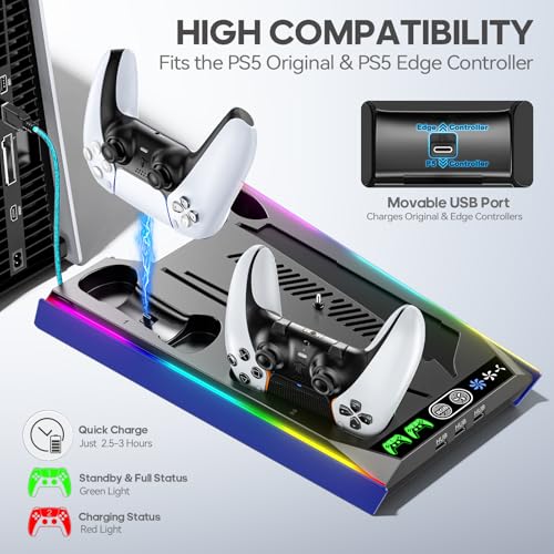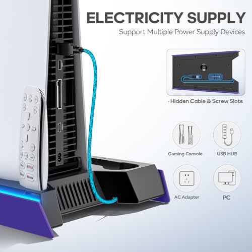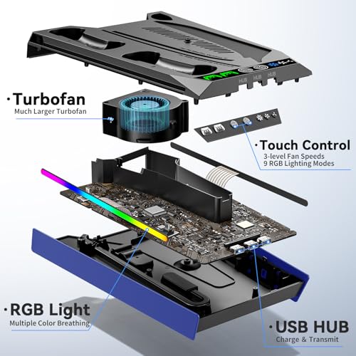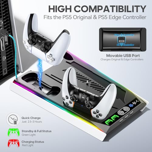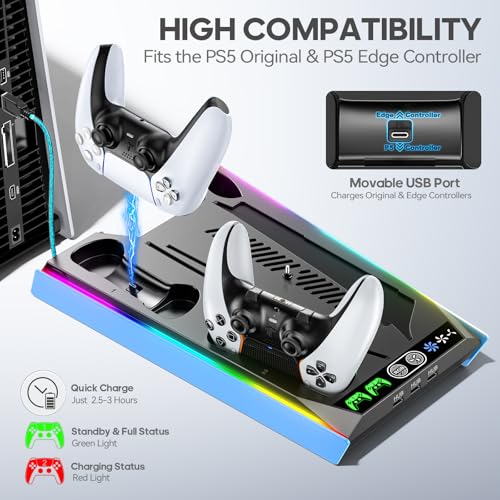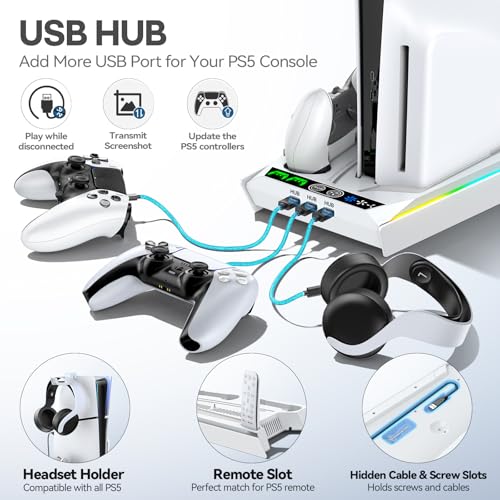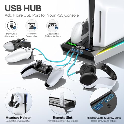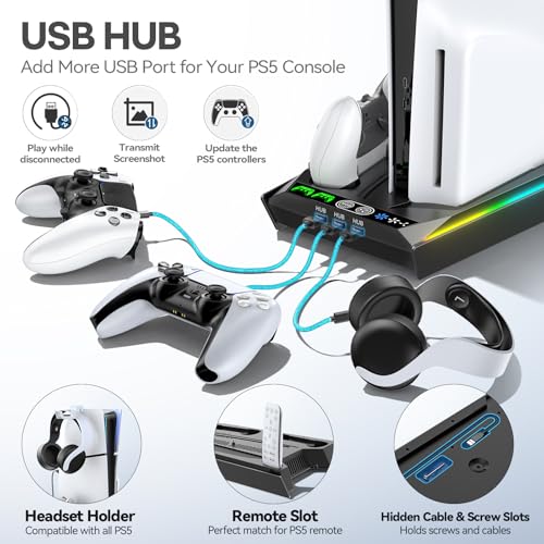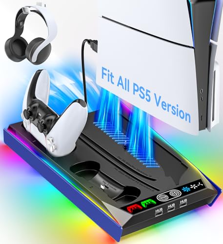 PS5/Slim/Pro Stand for Disc & Digital Console, PS5 Cooling & Charging Station with RGB Ambient Lighting, PS5 Controller Charger Built-in 3 Level Fan, PS5/Slim/Pro Accessories Comes 3 USB Ports
