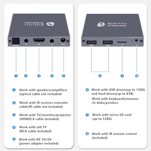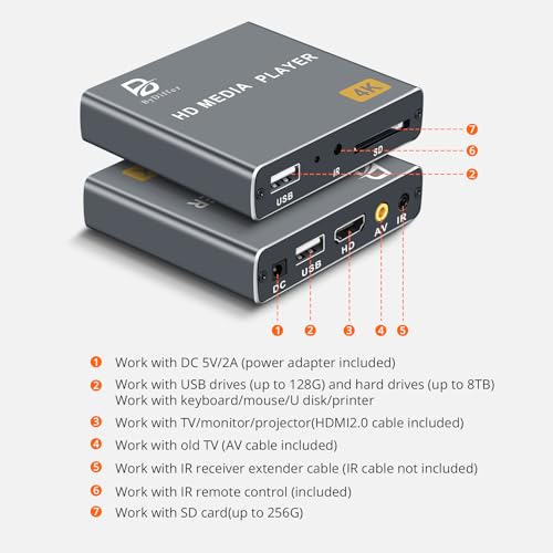 ByDiffer 4K Digital Media Player, TV MP4 Video Player for USB Drives and SD Cards, Ultra HD, H.265/HEVC, Digital Signage, Looping and Auto Playback, HDMI and AV Output (Grey)