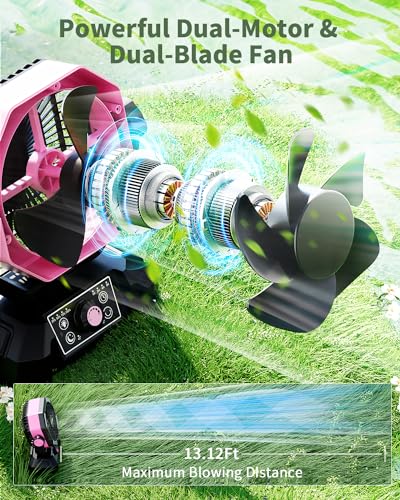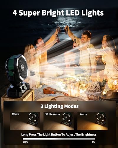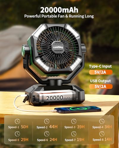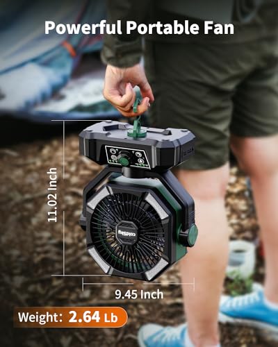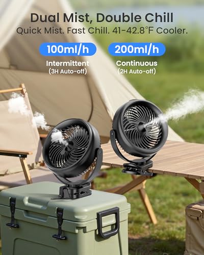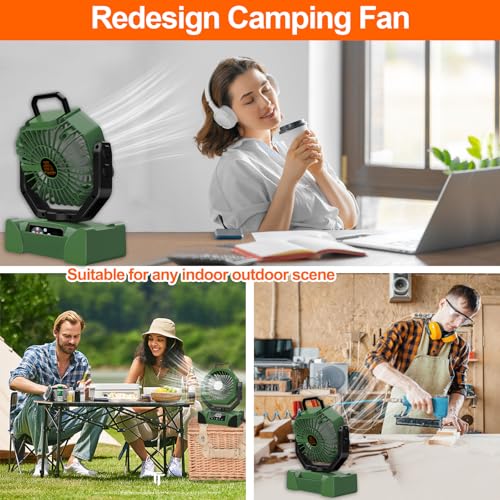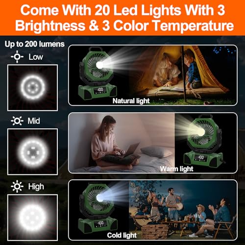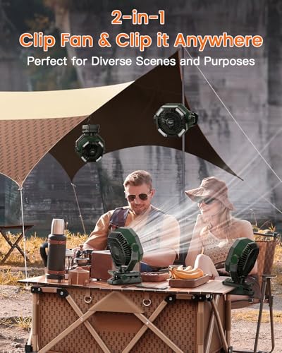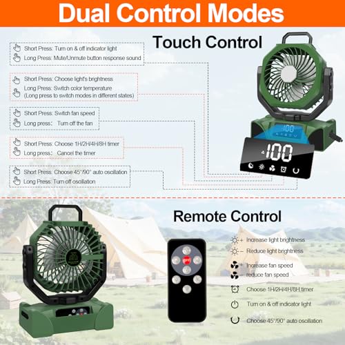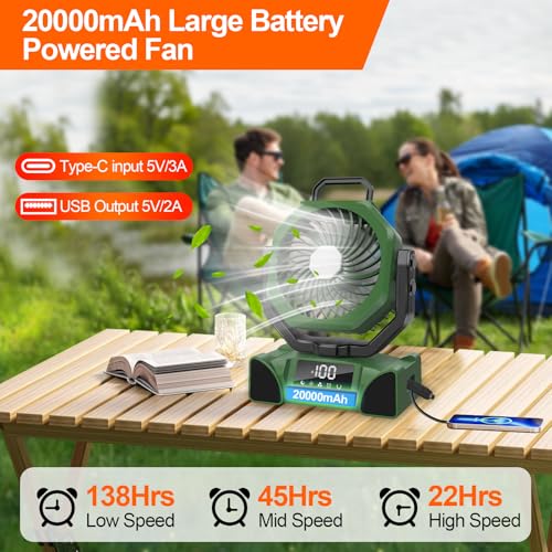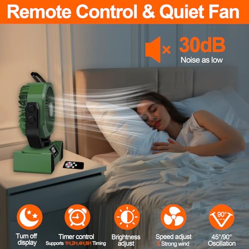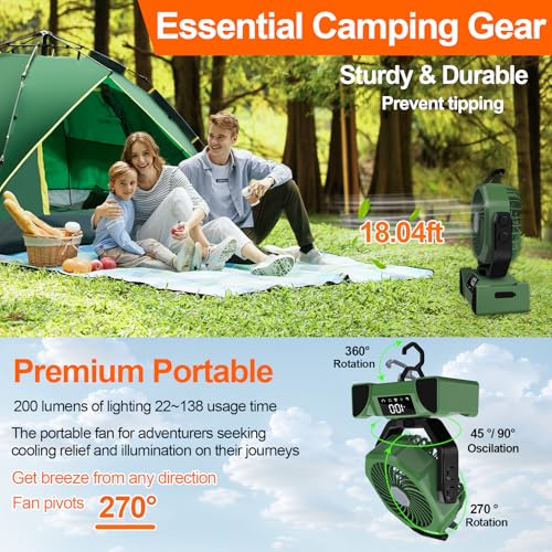 Camping Fan with Dual Motor, 20000mAh Clip On with Digital Display, 9-Inch Portable Battery Operated with LED Lantern, Tent Fan for Camping with Remote, 5 Speeds, 4 Timing, Outdoor Green