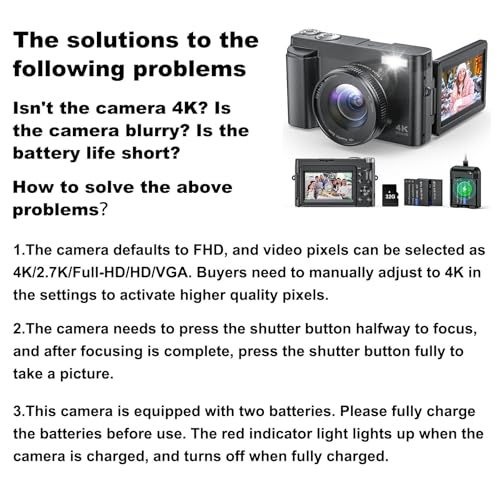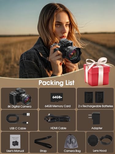 8K Digital Camera, 88MP Cameras for Photography with WiFi & Touch Screen, 16X Zoom Vlogging Camera for YouTube Video, Autofocus & Anti-Shake, Dual Camera, 2 Batteries, 64GB Card, Flash, Lens Hood