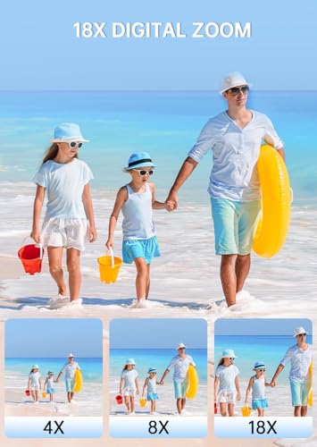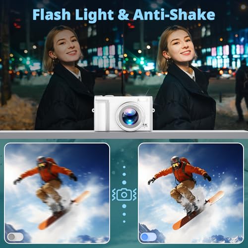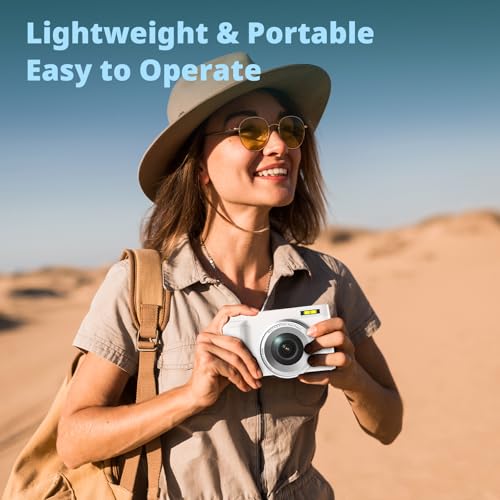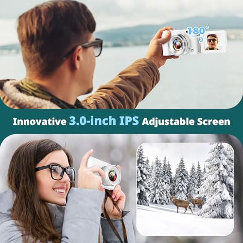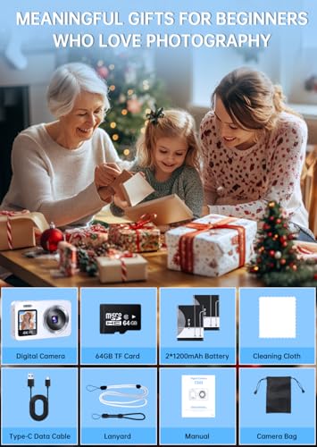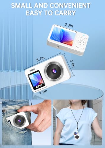 Digital Camera, 4K 64MP UHD Dual Screens Camera, 18X Zoom, Portable Small Point and Shoot Digital Cameras with 64GB TF Card, 2 Rechargeable Batteries for Kids, Teens, Adult, Selfies, Gifts- White