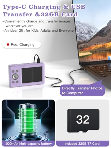 Upgrade Digital Camera, 56MP FHD 1080P for Kids with 16x Zoom Anti Shake, 32GB TF Card, Two Batteries, Lanyard, Compact Small for Boys Girls (Black)