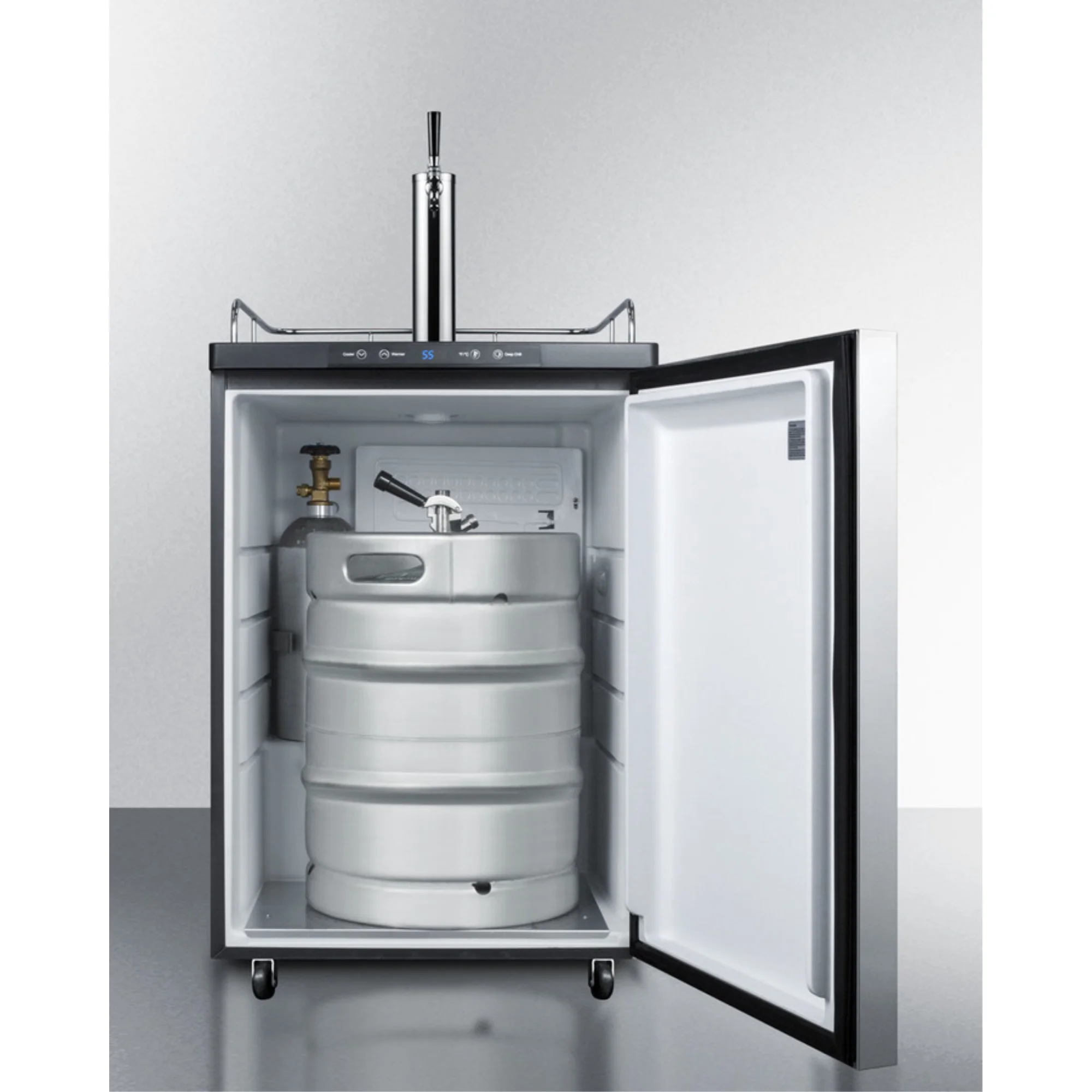 Built-in residential beer dispenser, auto defrost with digital thermostat, stainless steel door, horizontal handle, and black cabinet