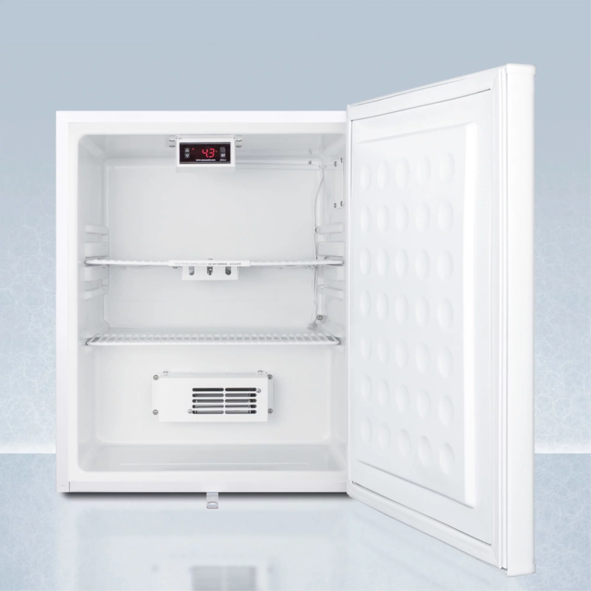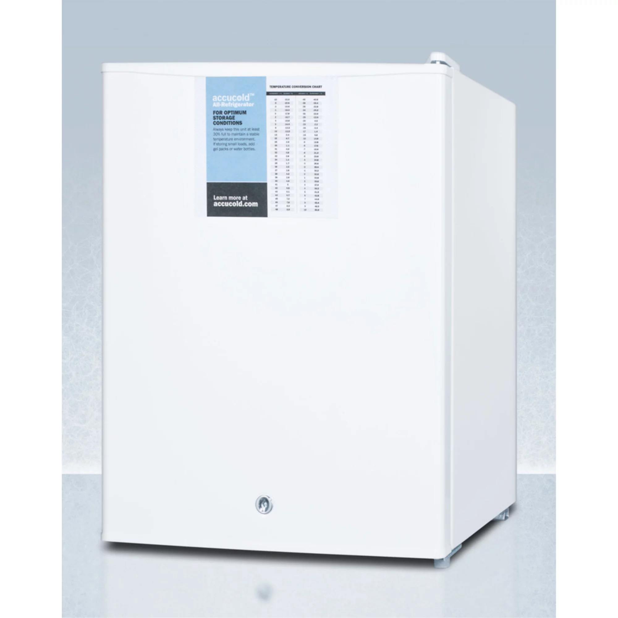 Compact auto defrost all-refrigerator with digital thermostat, internal fan, front lock, and probe hole for user-installed monitoring equipment
