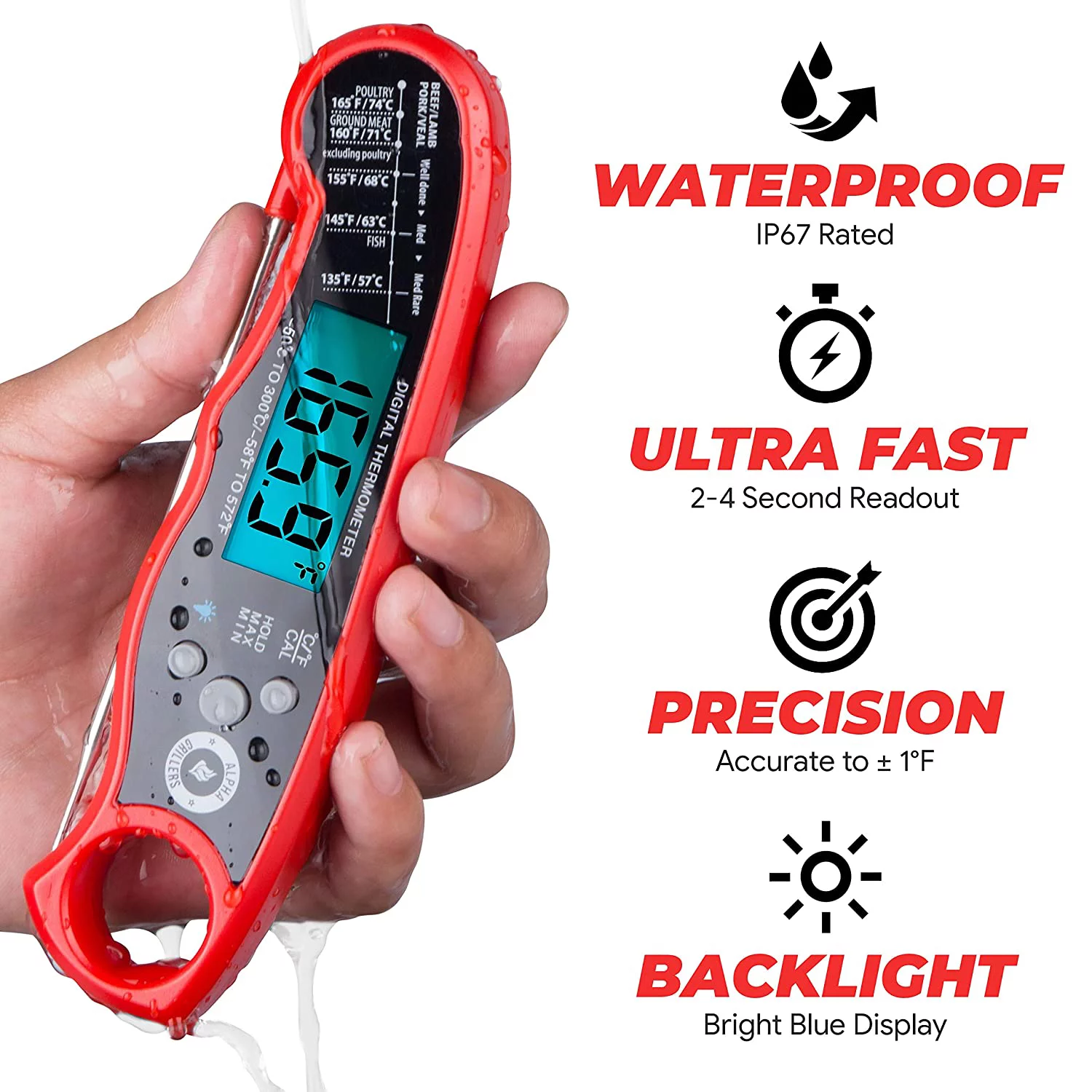 Alpha Grillers Instant Read Meat Thermometer for Grill and Cooking. Best Waterproof Ultra Fast Thermometer with Backlight & Calibration. Digital Food Probe for Kitchen, Outdoor Grilling and BBQ!