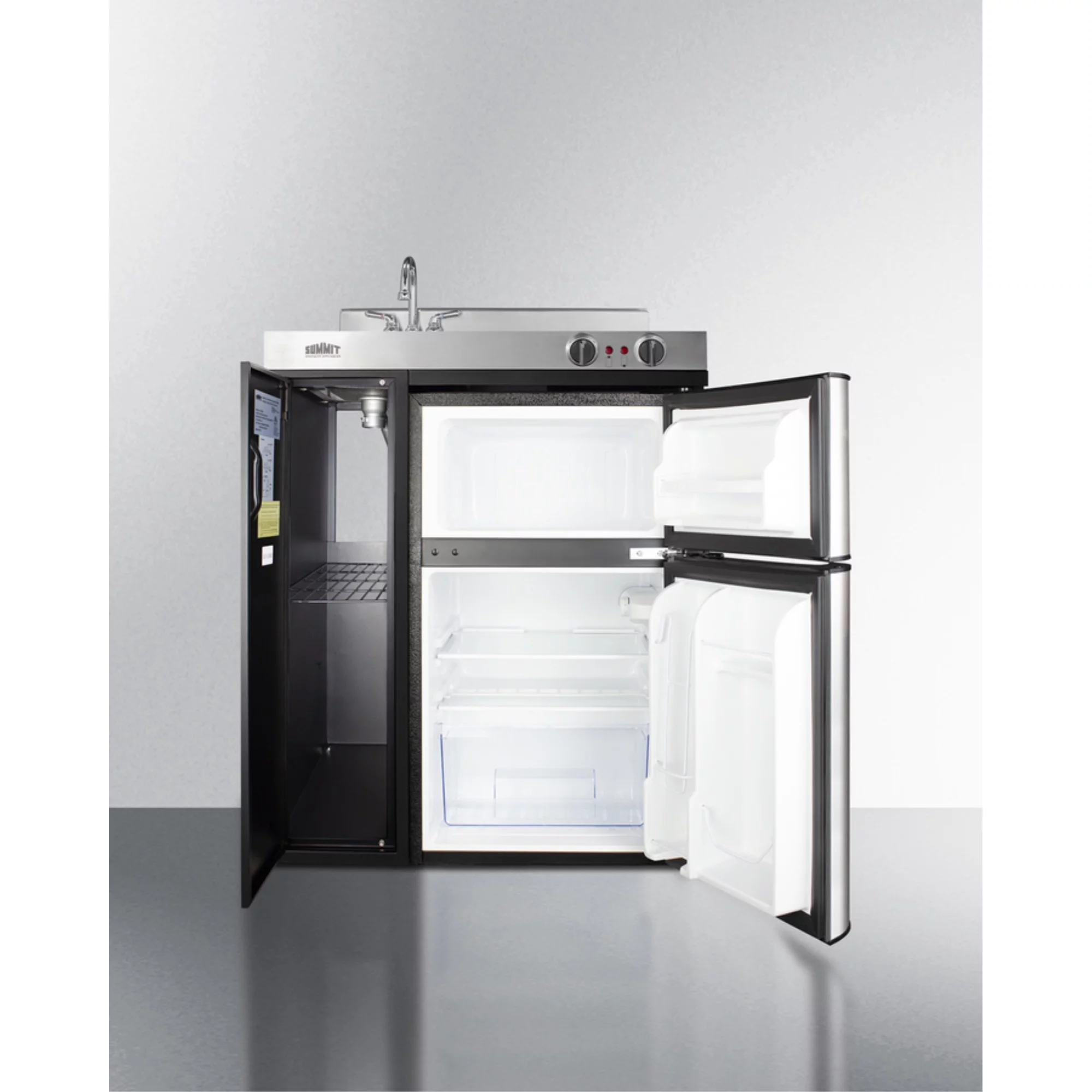 30" wide all-in-one kitchenette with 2-burner 115V coil cooktop, refrigerator-freezer, sink, and storage cabinet