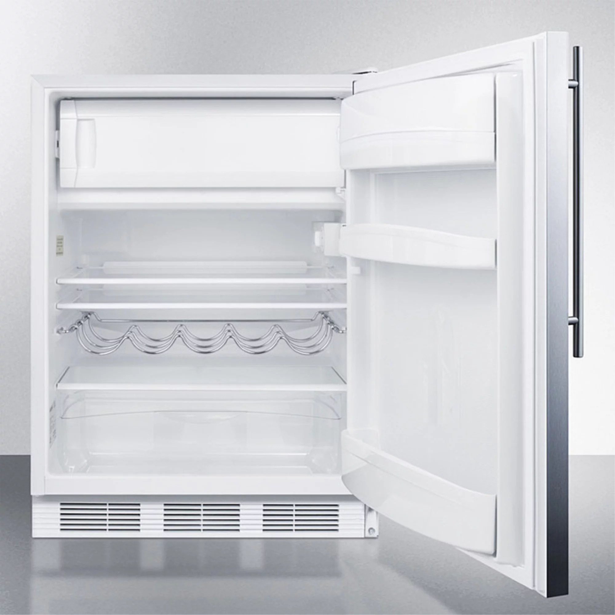 Built-in undercounter refrigerator-freezer for residential use, cycle defrost w/deluxe interior, stainless steel wrapped door, thin handle, and white cabinet