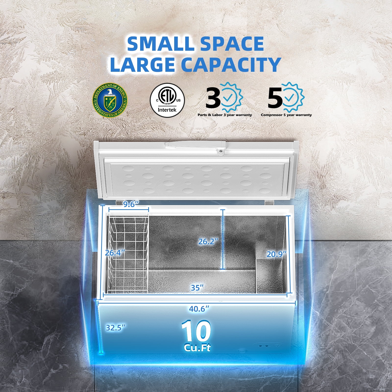 Hoccot Chest Freezer 10 Cu.Ft. 1 Removable Basket Deep Small Compact Freezer Top Door 7 Temperature Control from -13℉-14℉ Energy Saving White