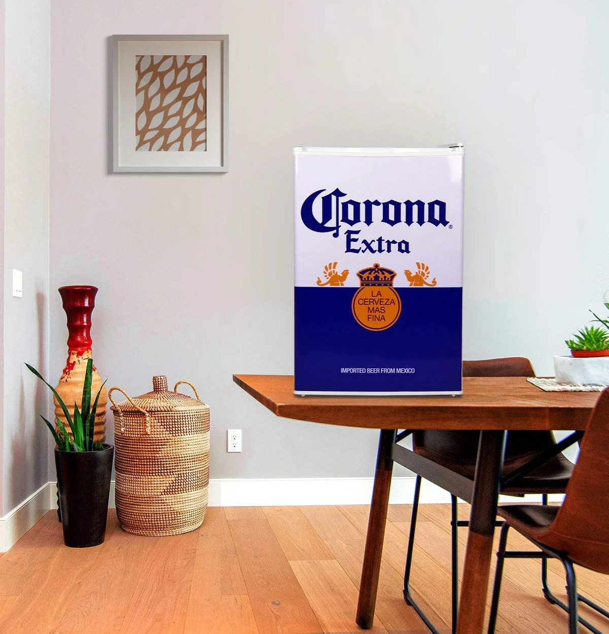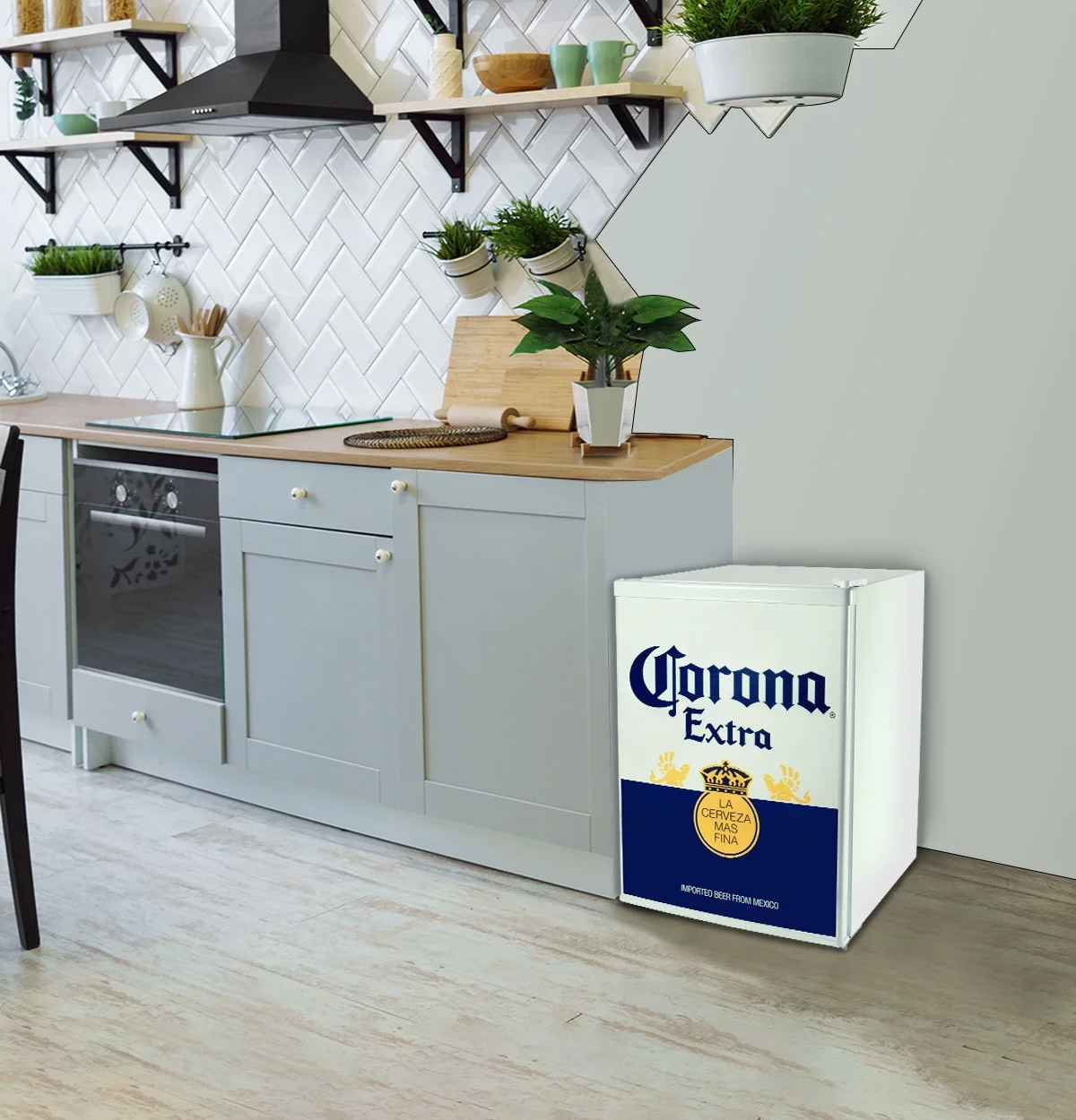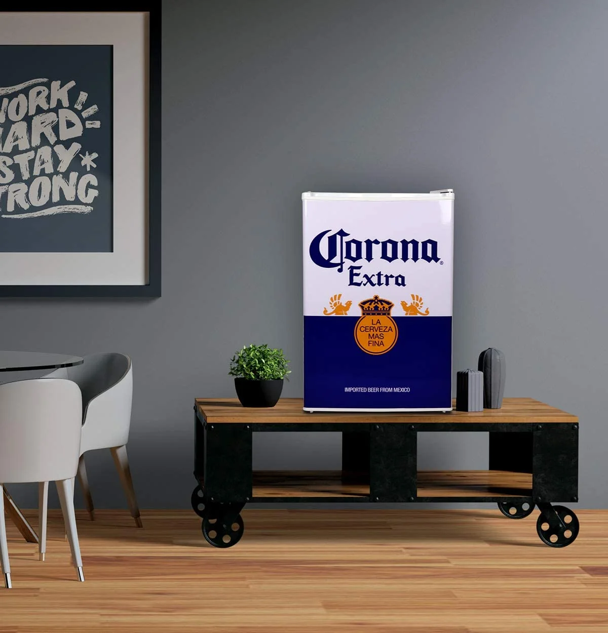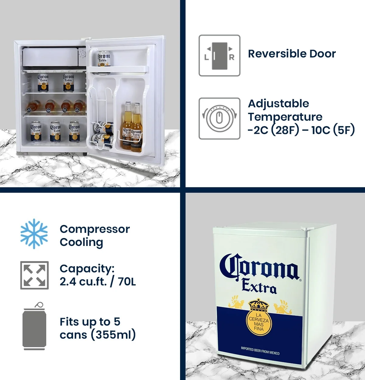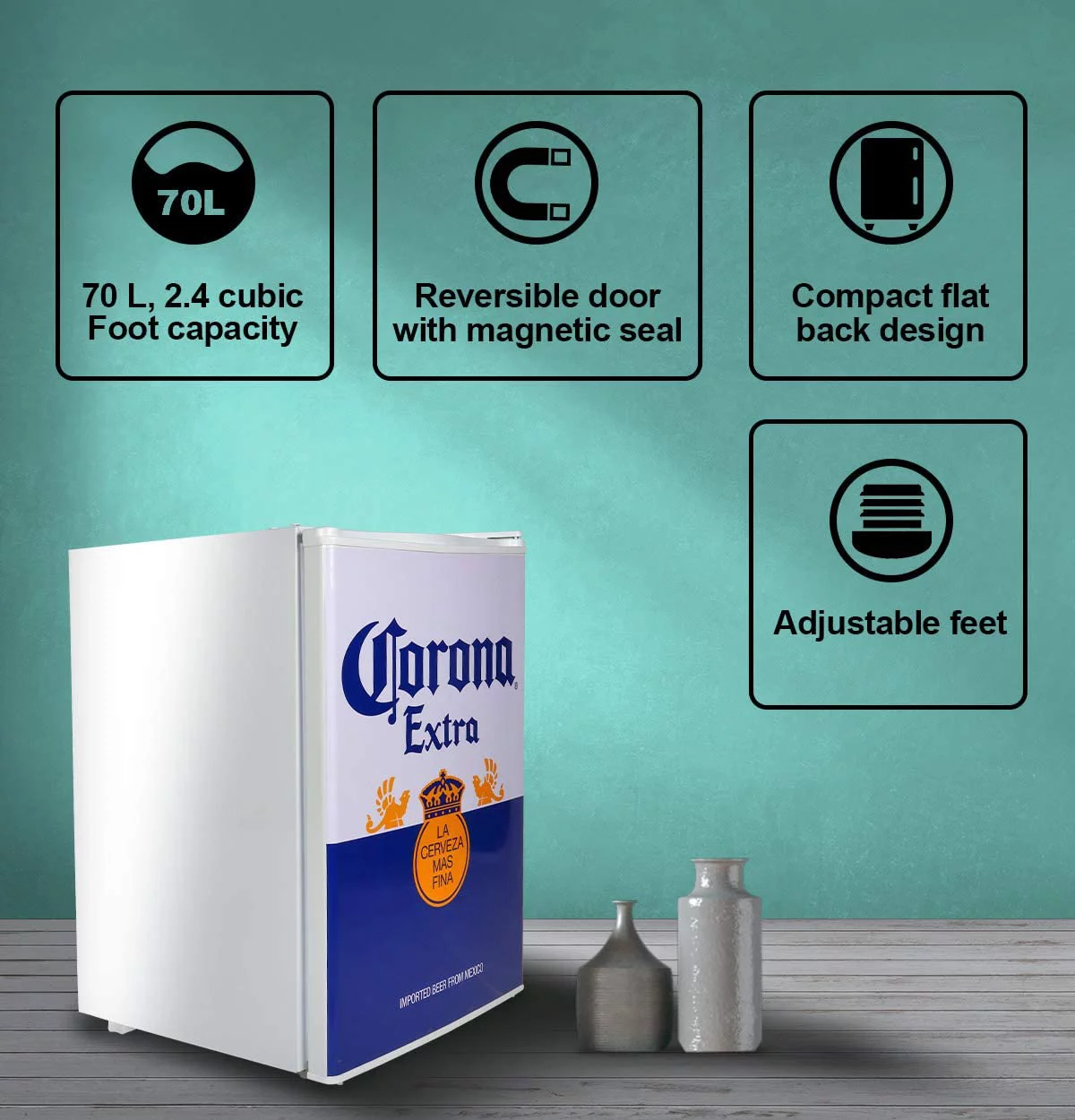 Corona Mini Beer Fridge with Freezer, 2.4 Cu. ft, 70 L for Frozen Meals, Beverages, White Blue