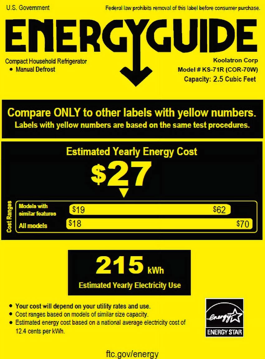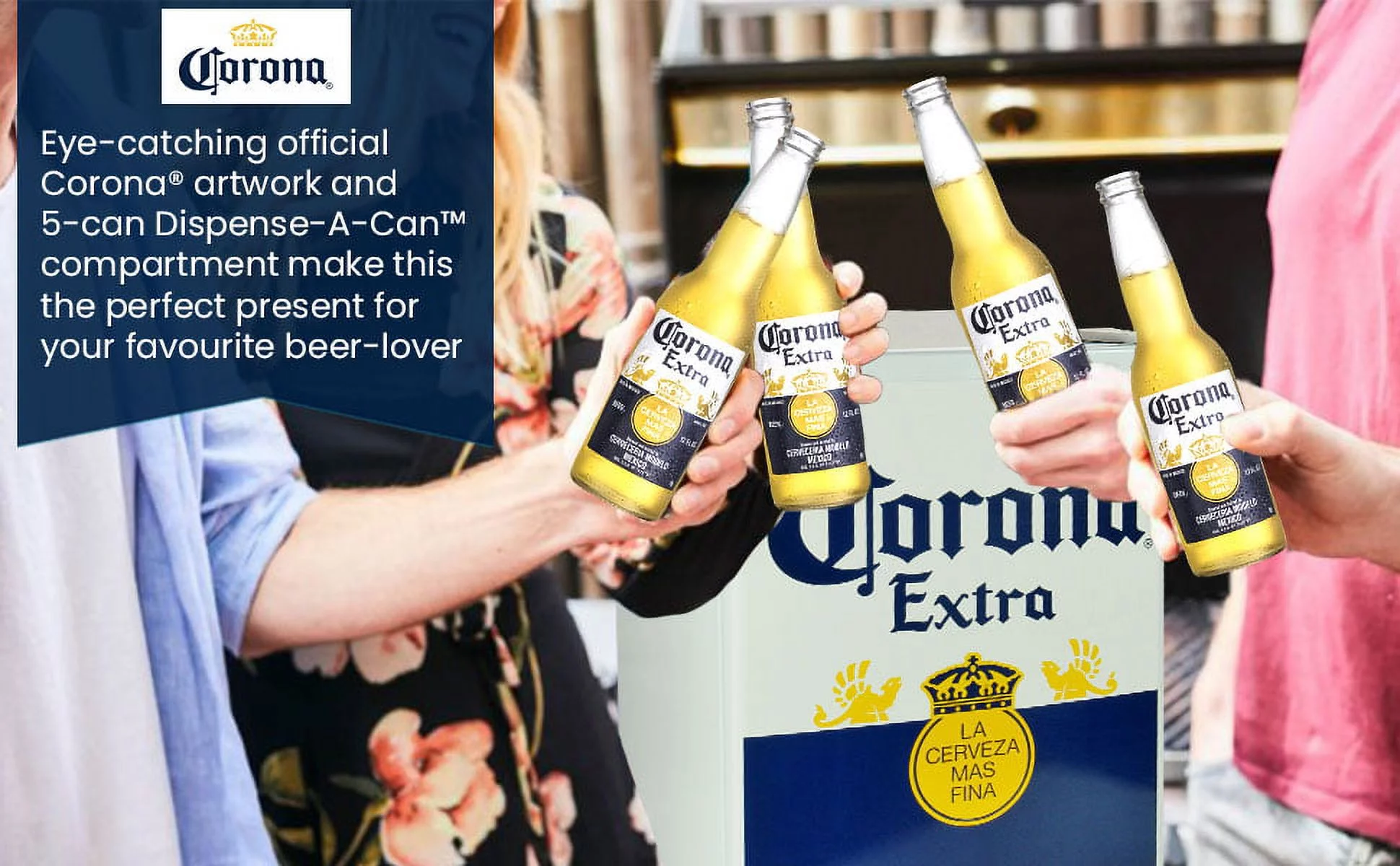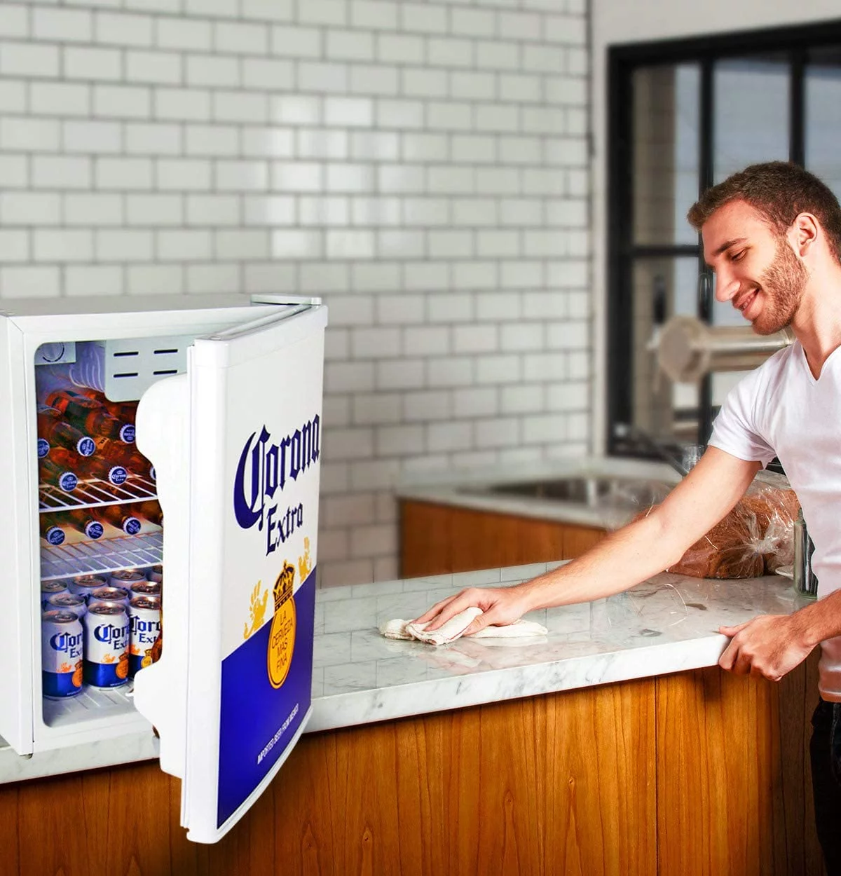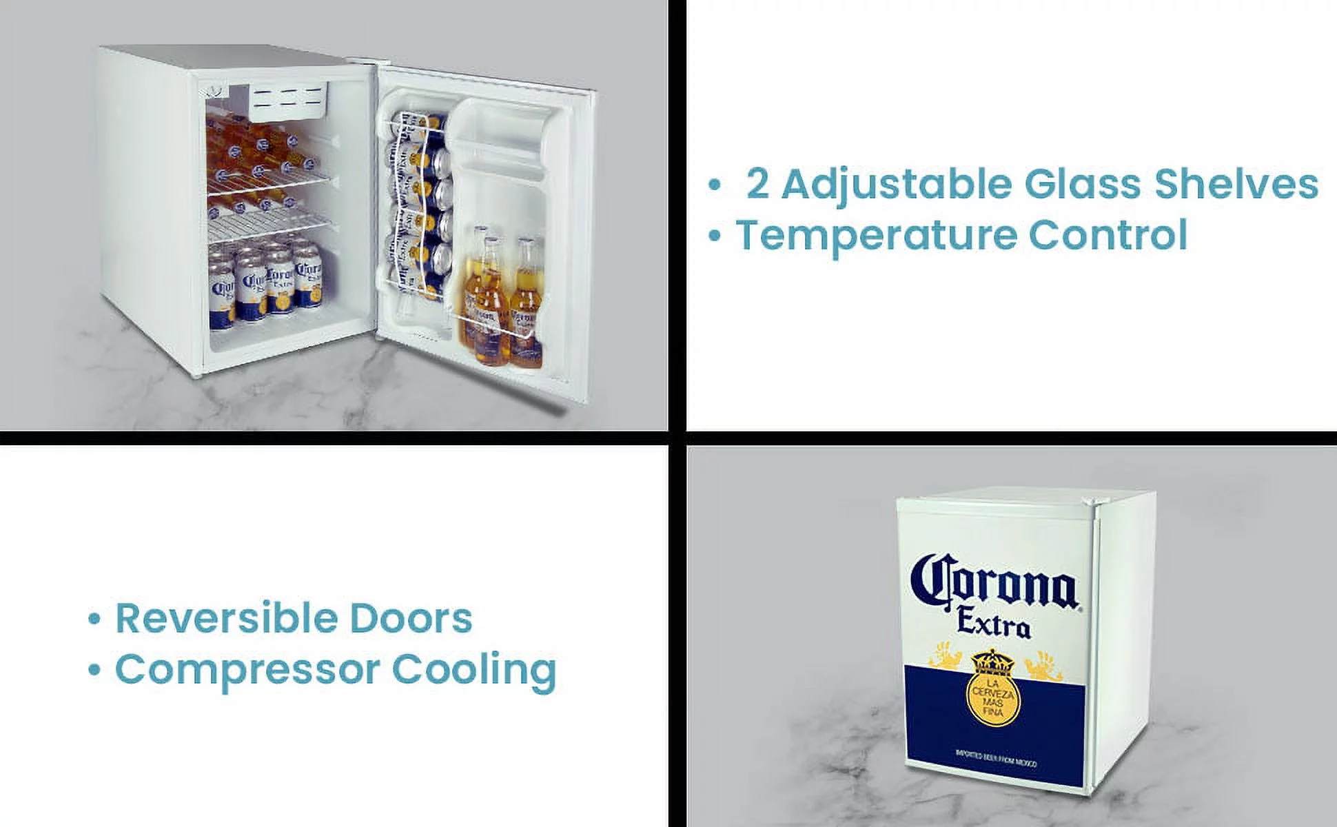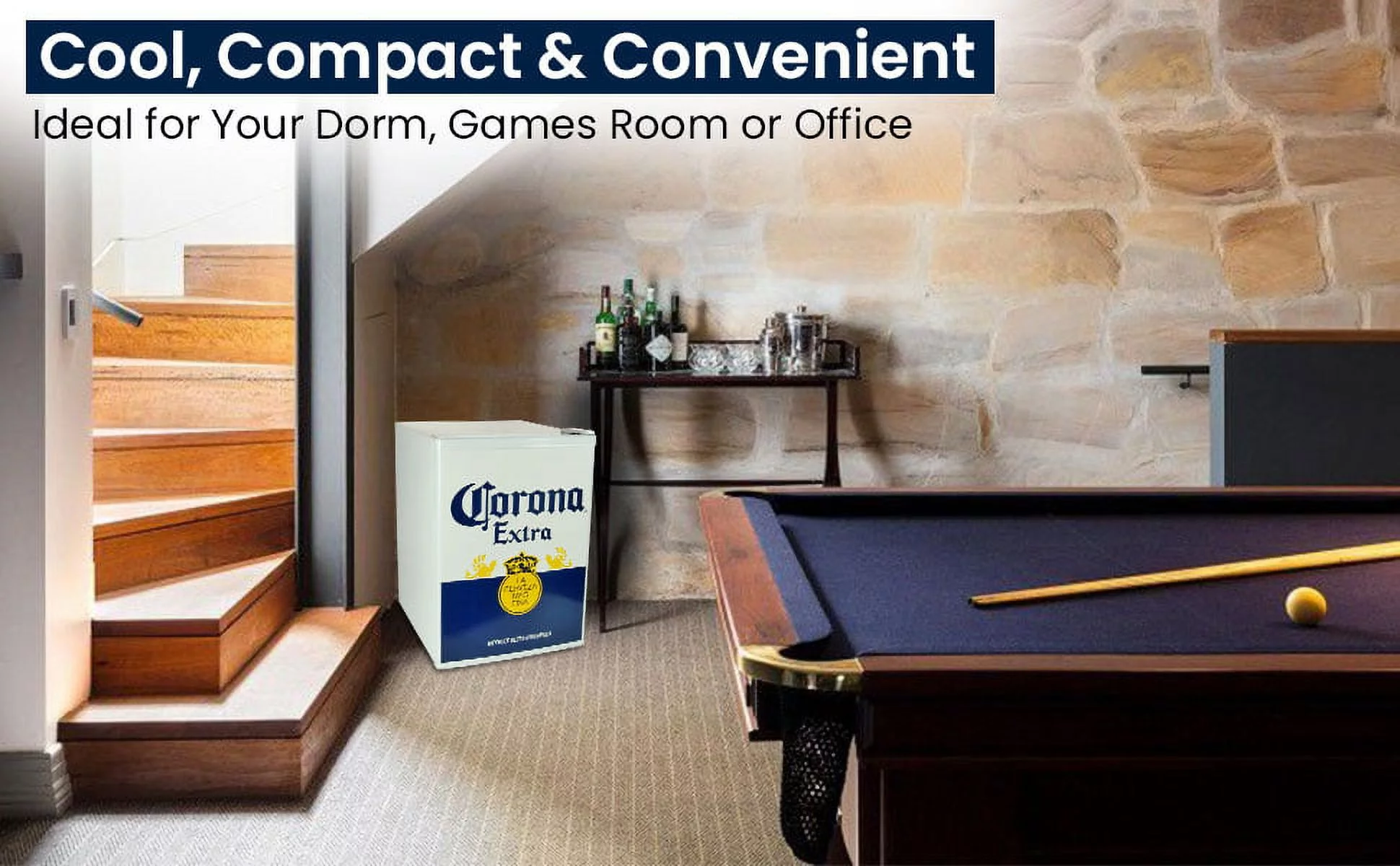 Corona Mini Beer Fridge with Freezer, 2.4 Cu. ft, 70 L for Frozen Meals, Beverages, White Blue