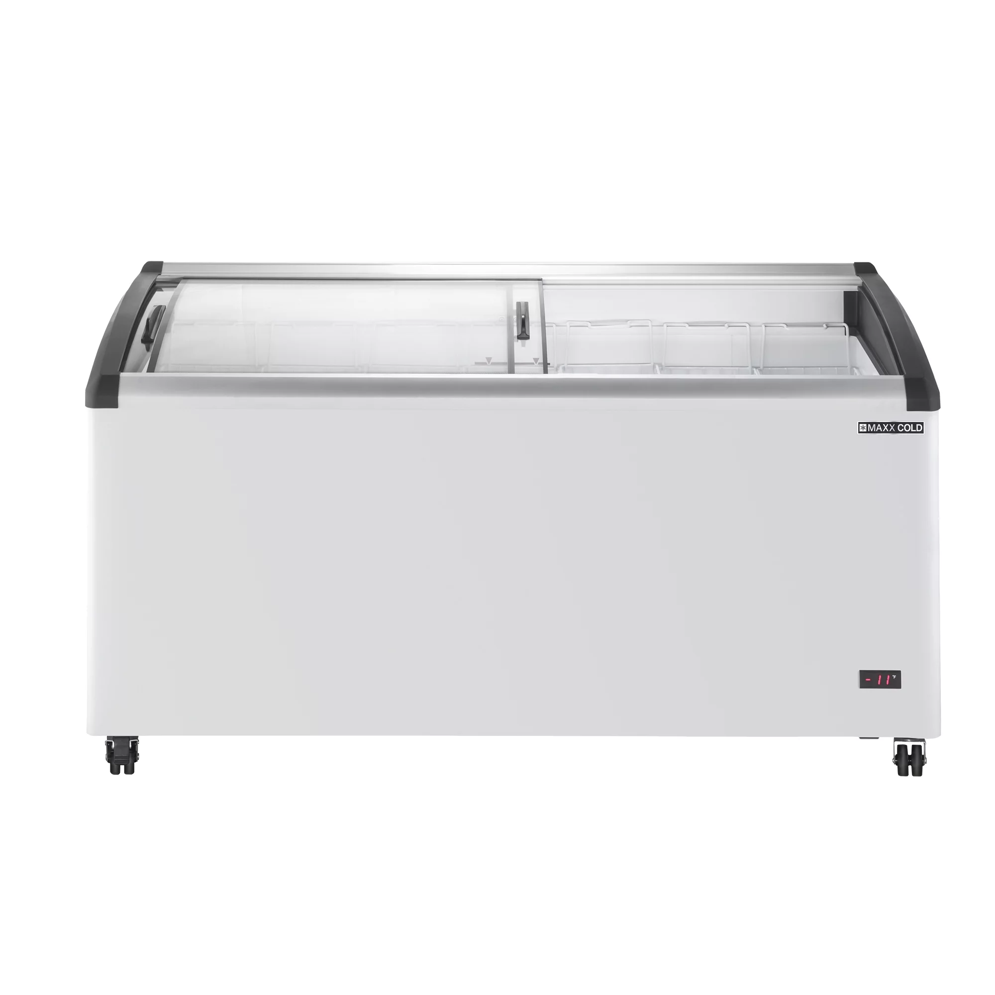 Maxx Cold Curved Glass Top Chest Freezer Display, 63.4"W, 12.36 cu. ft. Storage Capacity, Equipped with (7) Wire Baskets, in White (MXF64CHC-7)