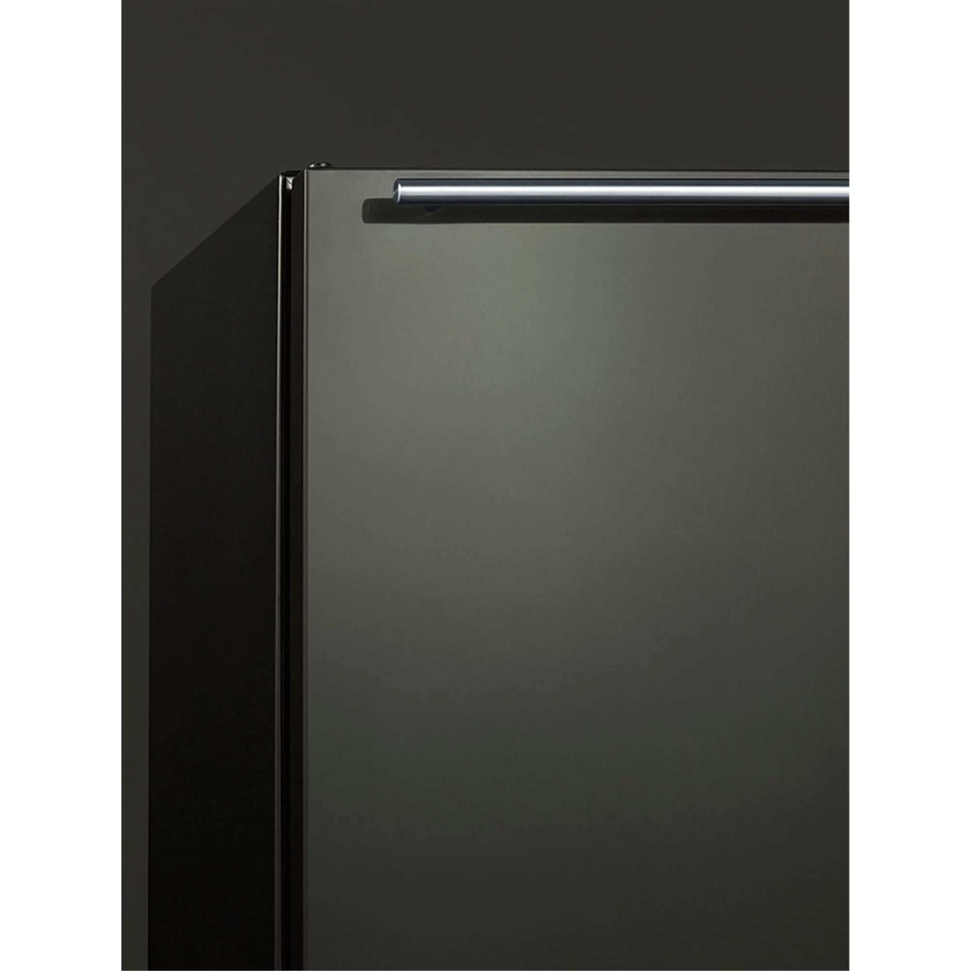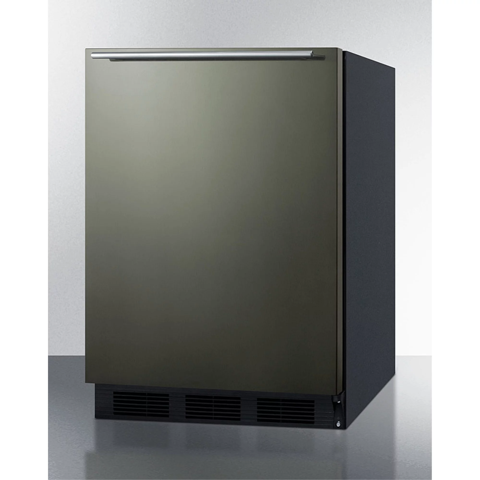 Built-in undercounter refrigerator-freezer for residential use, cycle defrost with black stainless steel wrapped door, horizontal handle, and black cabinet