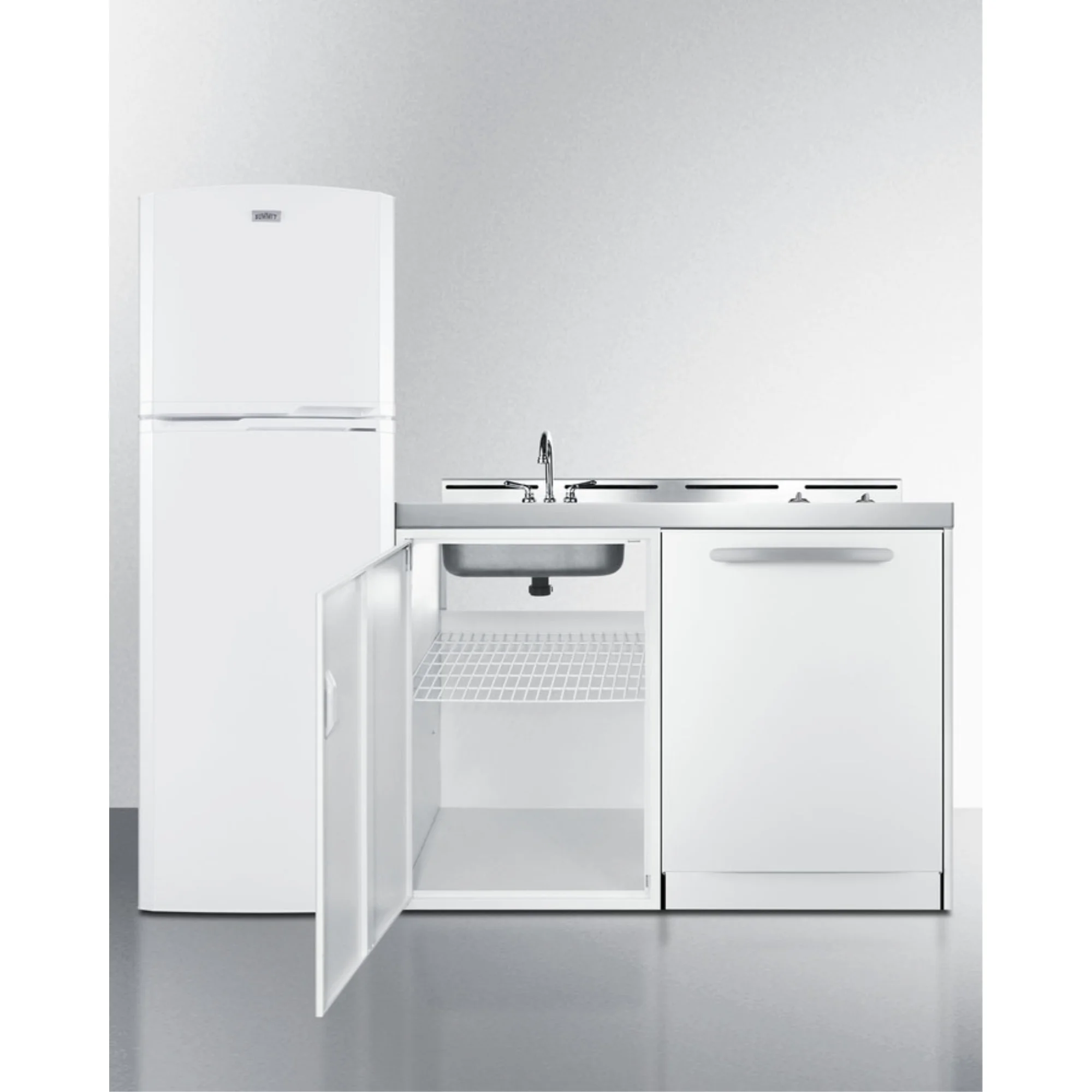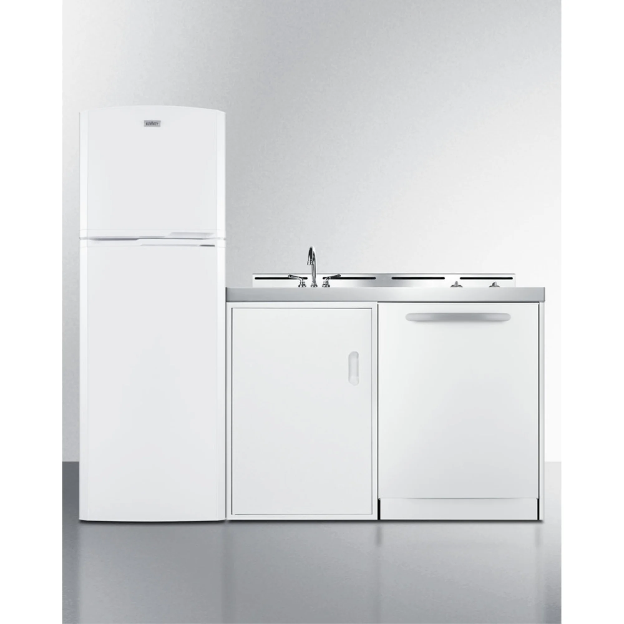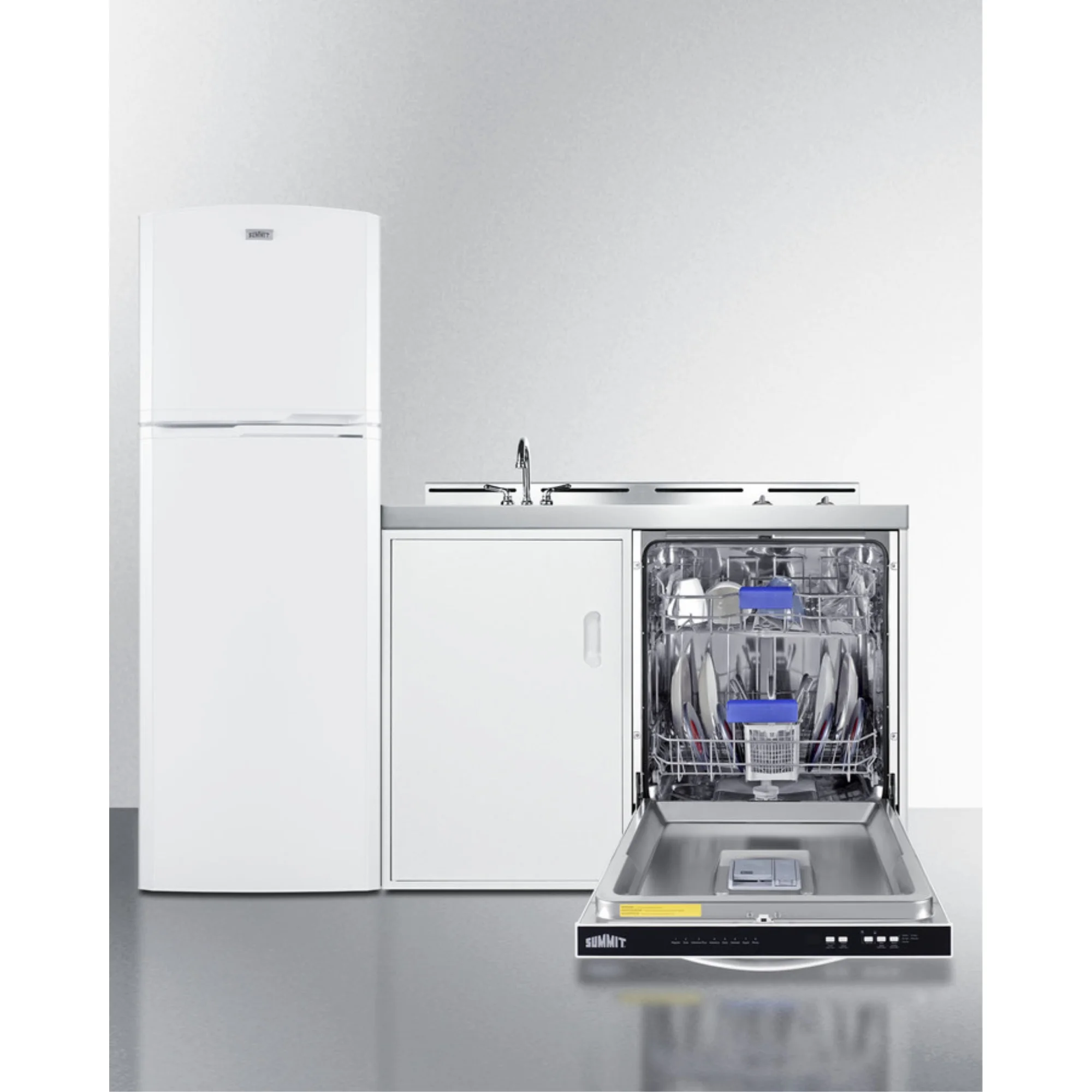 All-in-one combination kitchenette with full-sized refrigerator-freezer, dishwasher, sink, storage cabinet, and 2-burner glass cooktop