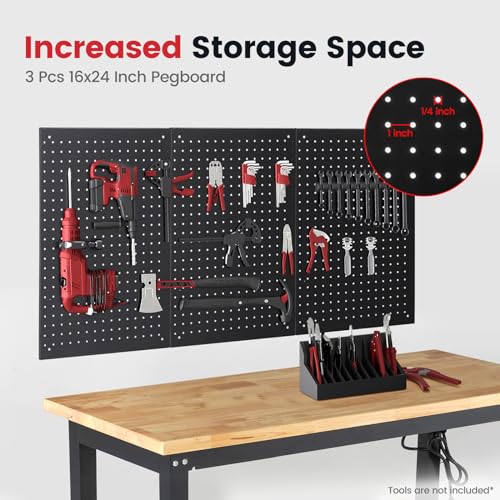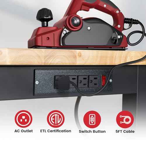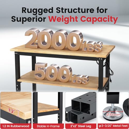48 Inch Work Table for Garage Adjustable Height Rubber Wood Tabletop Workbench with Storage Work Bench Table with Power Outlets Pegboard Pad for Woodworking Shop Home Office