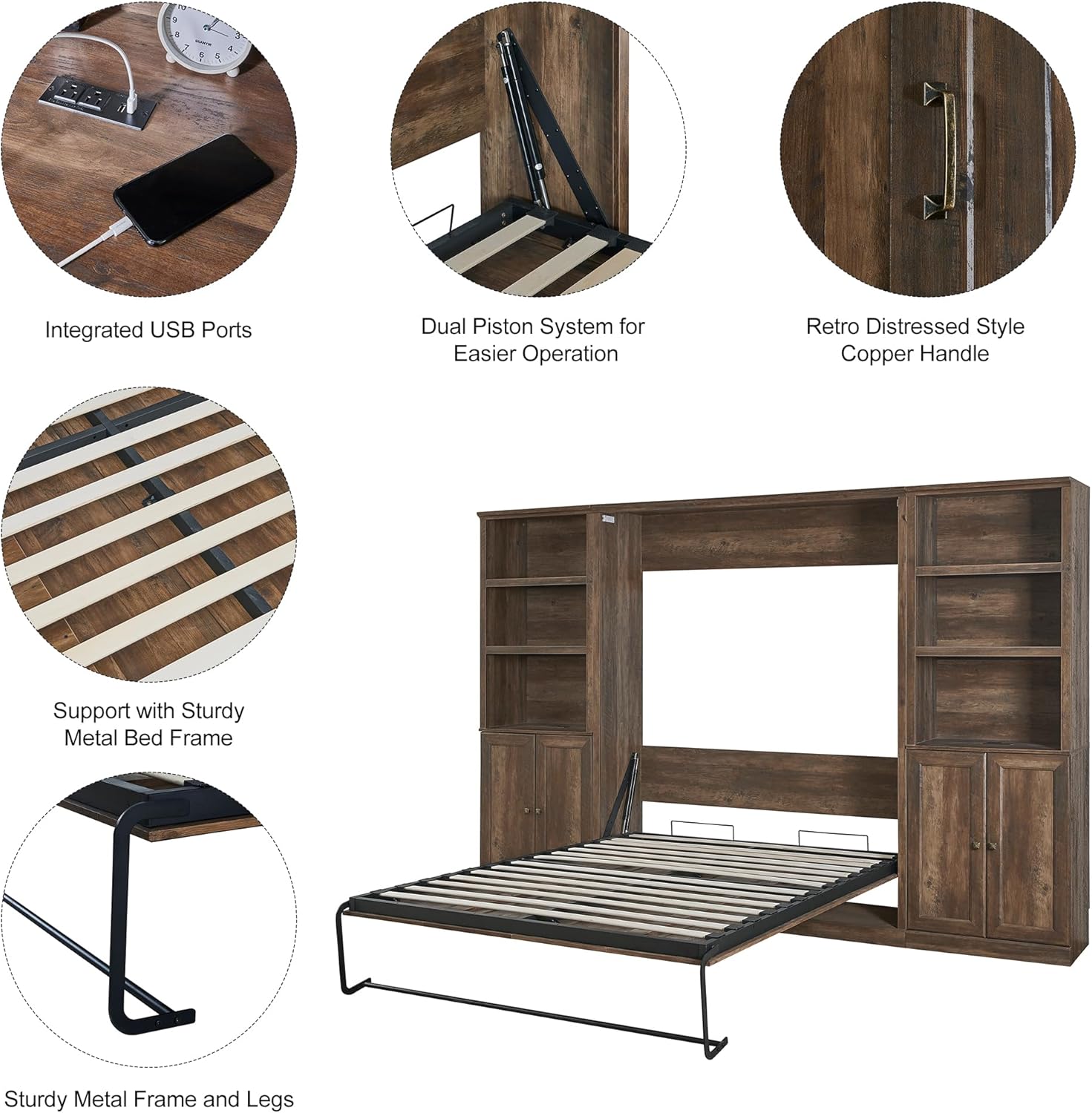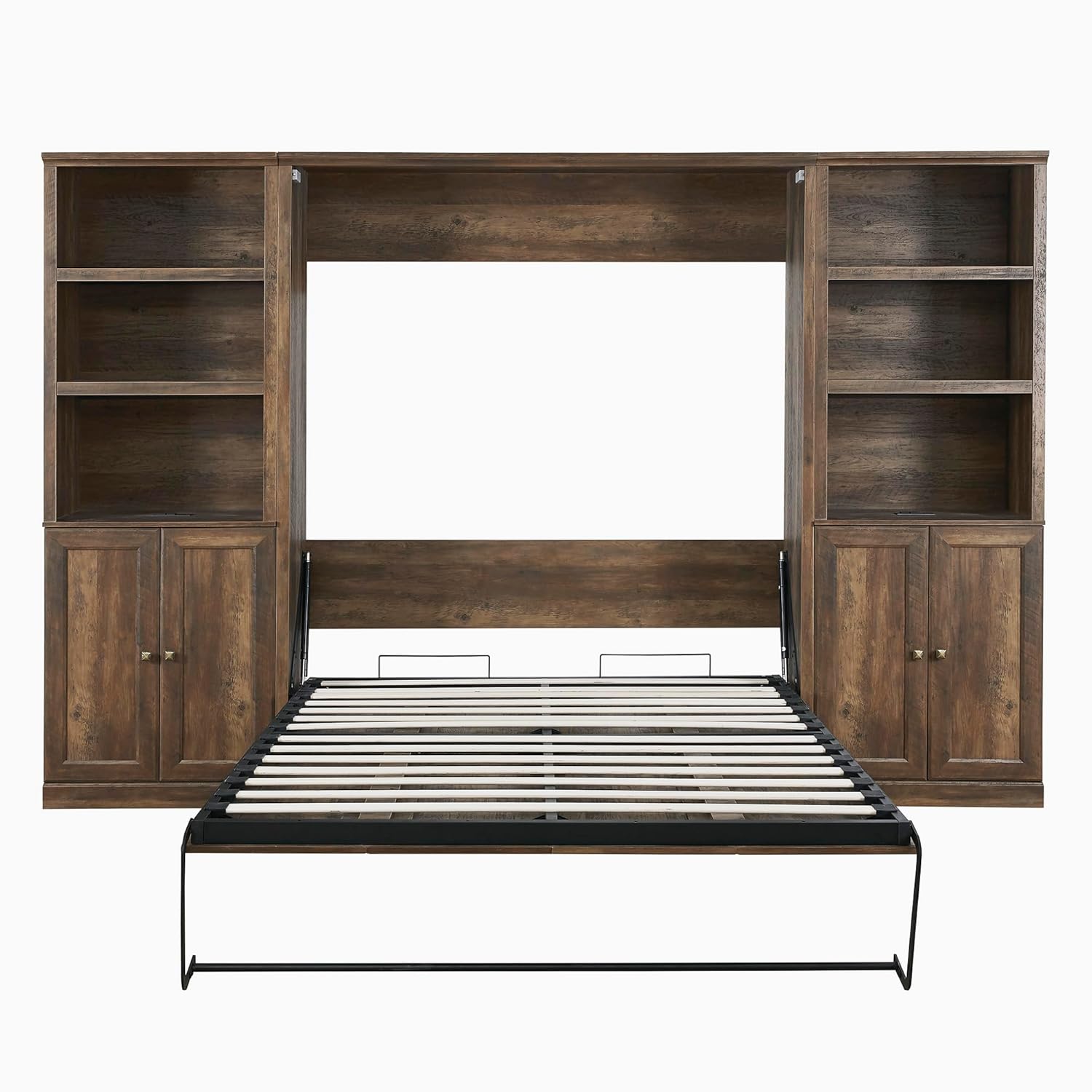Full Size Murphy Bed with 2 Side Cabinet Storage Shelf, Wood Foldable Bedframe Wallbed for Bedroom Living Room, Space-Saving Design, Brown