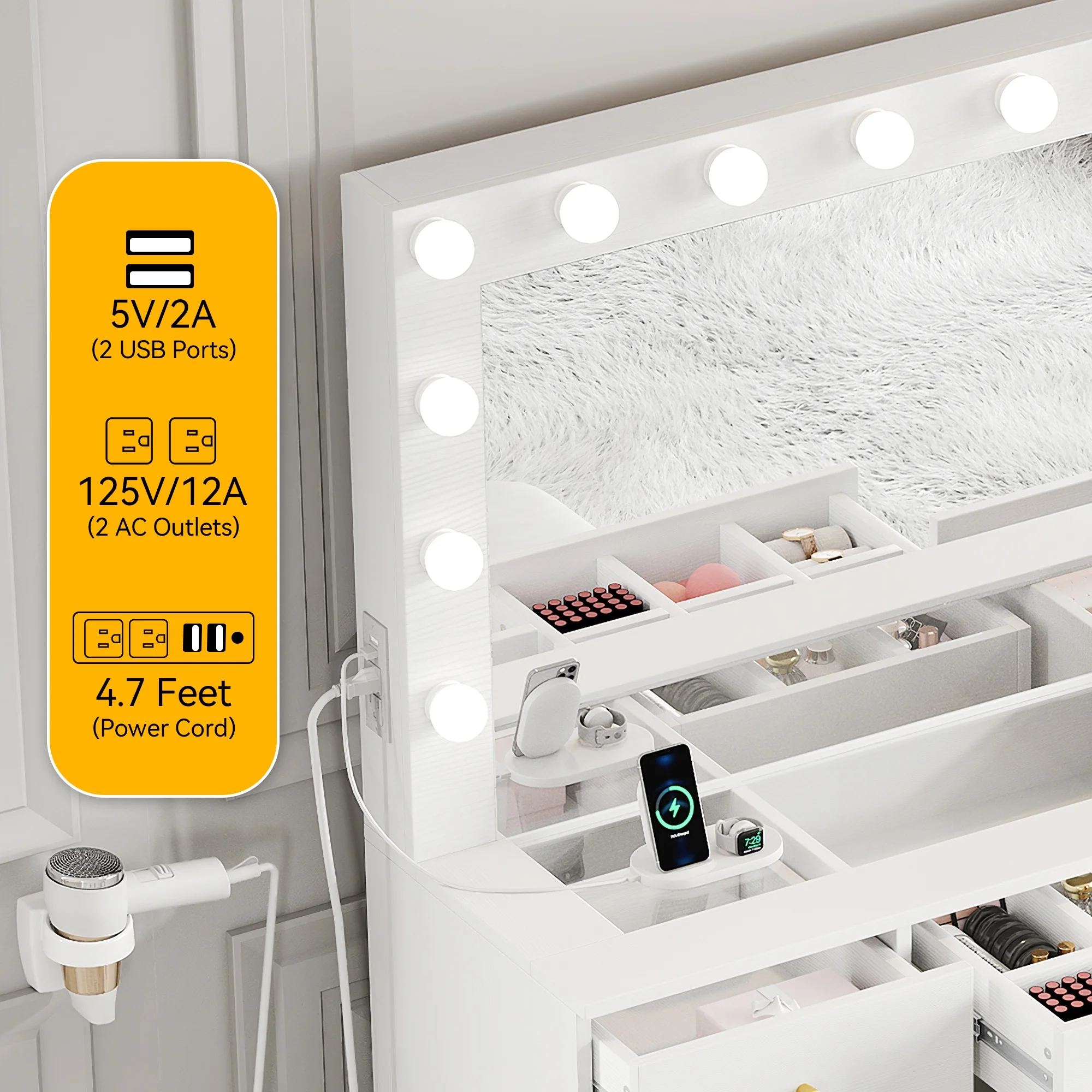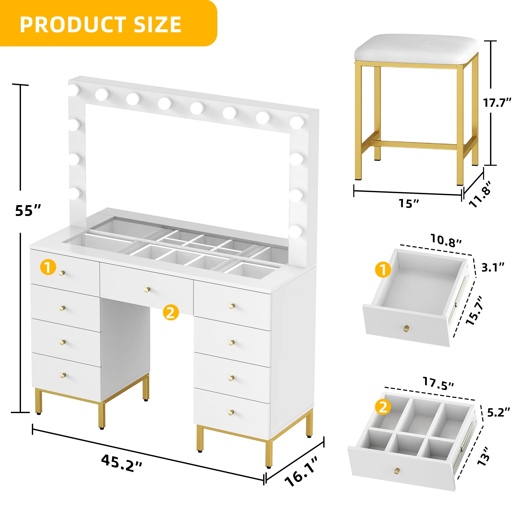 Dextrus Dextrus Vanity Table Set with 3 Color Lighted Mirror & Charging Station & Stool, Modern Makeup Vanity Dressing Table with 9 Drawers for Bedroom, Gold and White Vanity Desk for Women Girls
