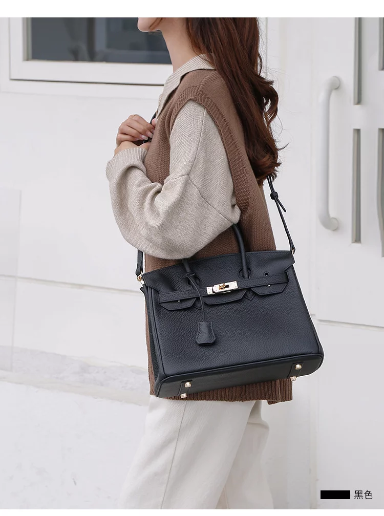 KAMUGO Leather Handbag for Women , Ladies Shoulder Bag Fashion Classic Lychee Pattern First Layer Cowhide Top Handle Satchel - black
