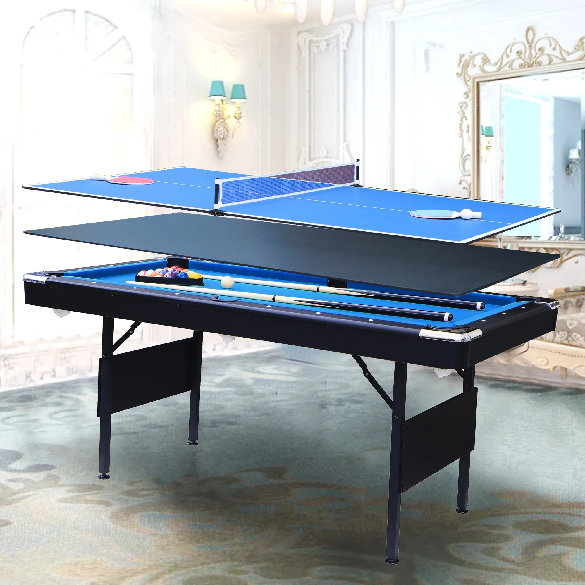 SEGMART 3 in 1 Billiards Table, 5.5 ft Folding Pool Table, Tennis Multigame Table, Multifunctional Snooker Table, All Accessories Included – Black with Blue Felt
