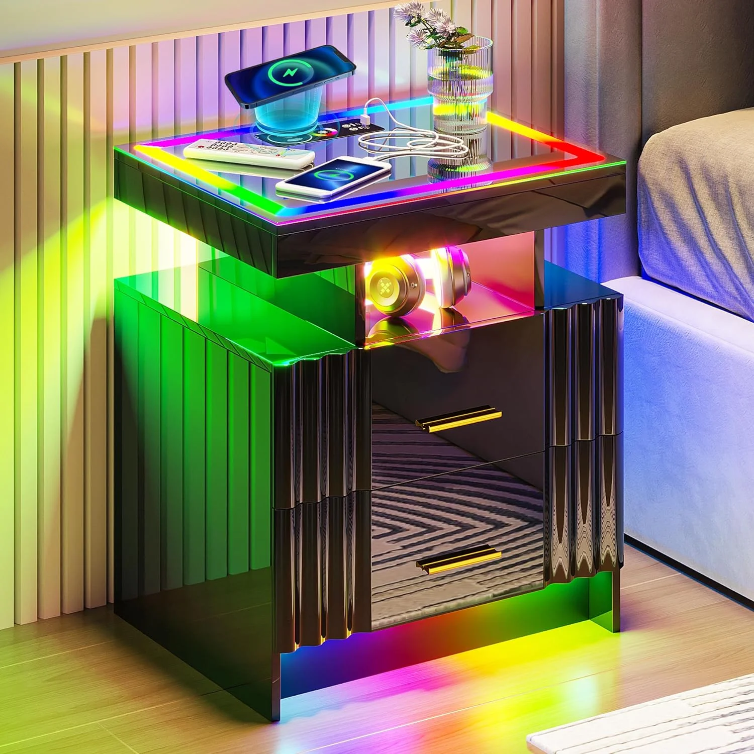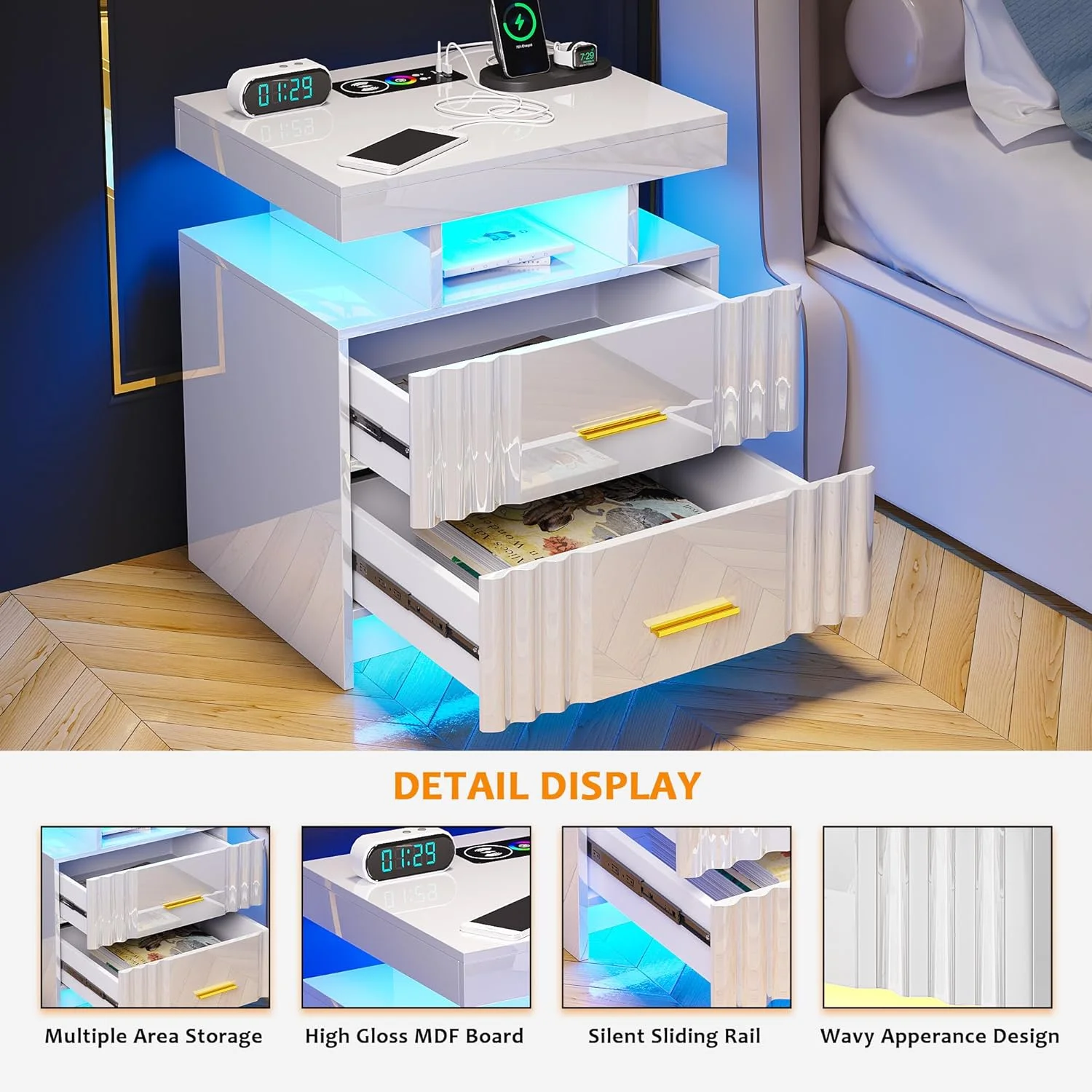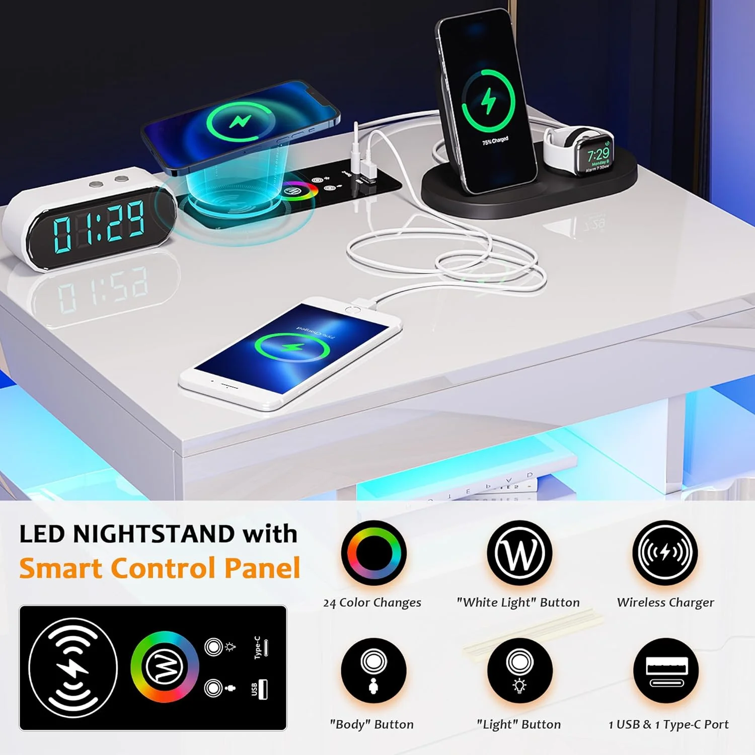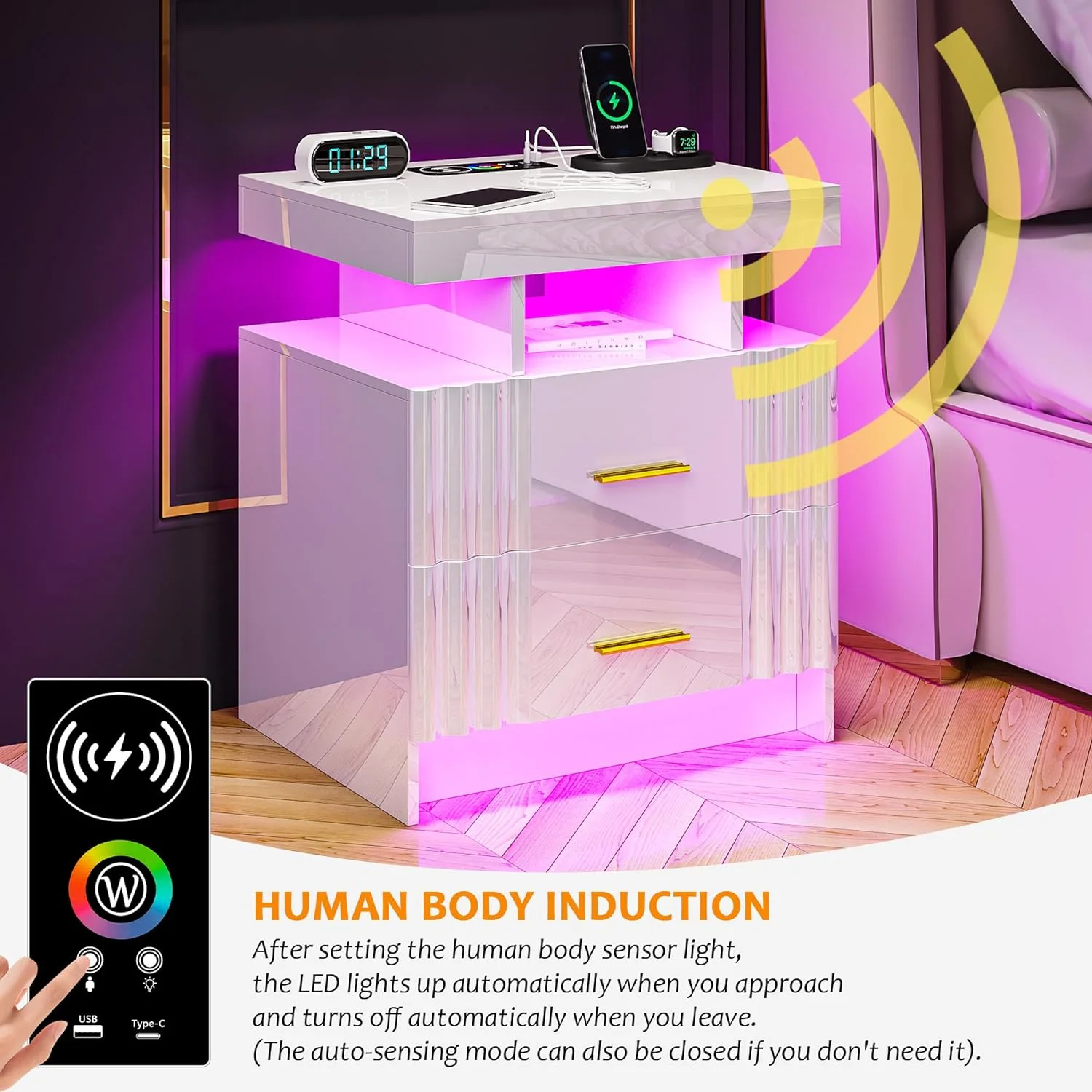 U-ToBe Nightstand with Charging Station, White LED Night Stand with 2 Drawers, High Gloss Bedside Table with Auto Sensor 24-Color Lights/Wireless/Type-C/USB Charging for Bedroom