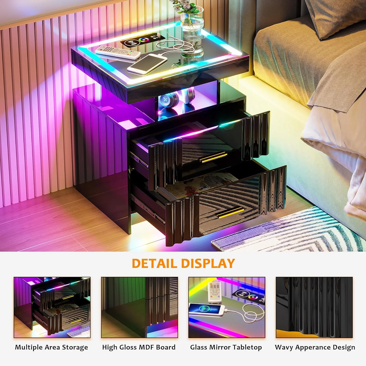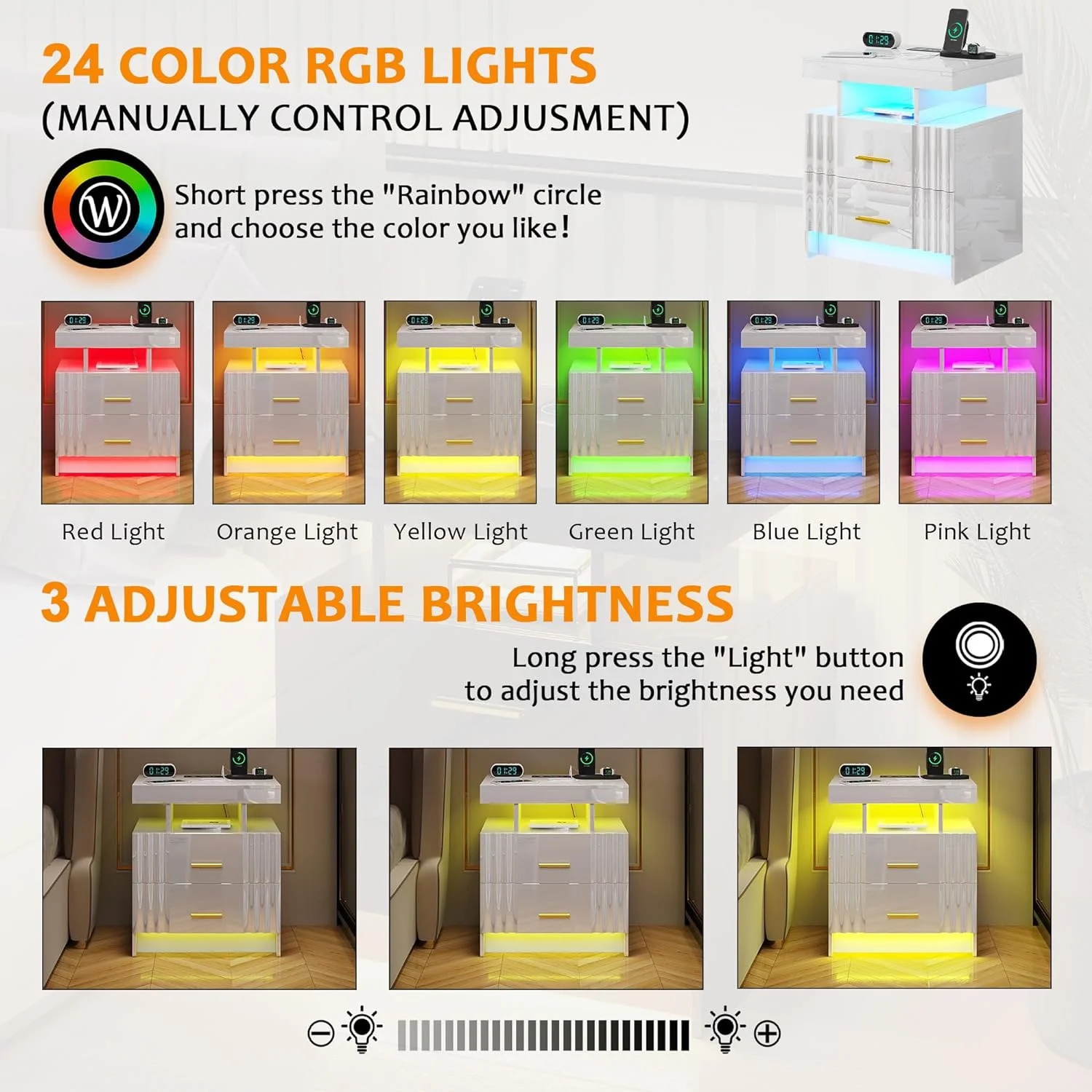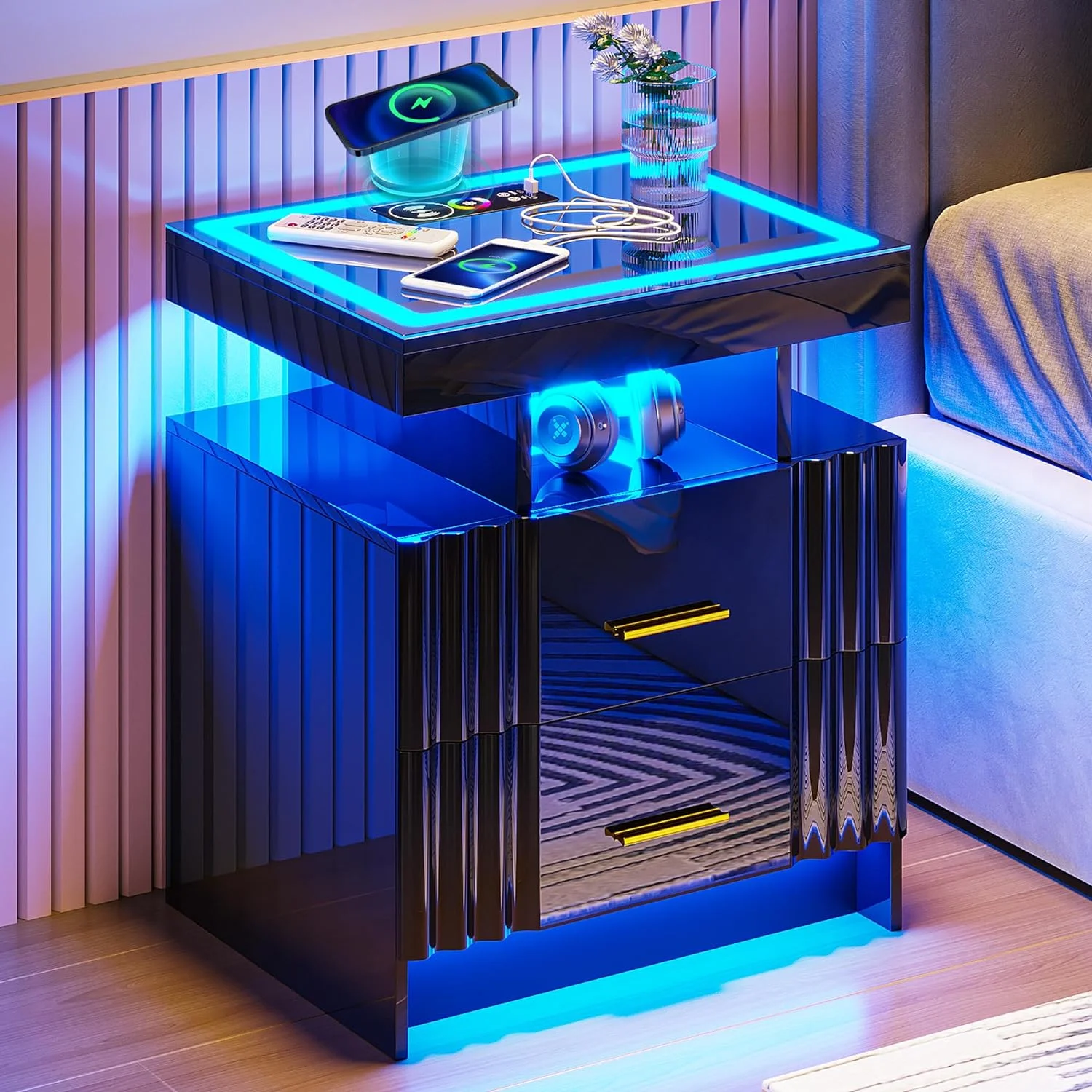 U-ToBe Nightstand with Charging Station, White LED Night Stand with 2 Drawers, High Gloss Bedside Table with Auto Sensor 24-Color Lights/Wireless/Type-C/USB Charging for Bedroom