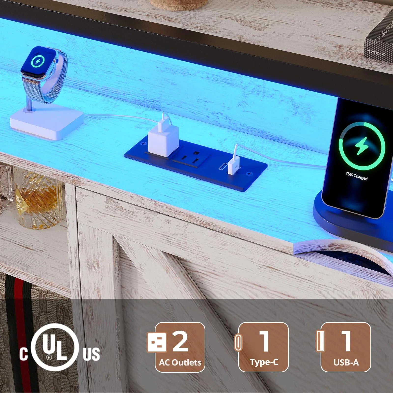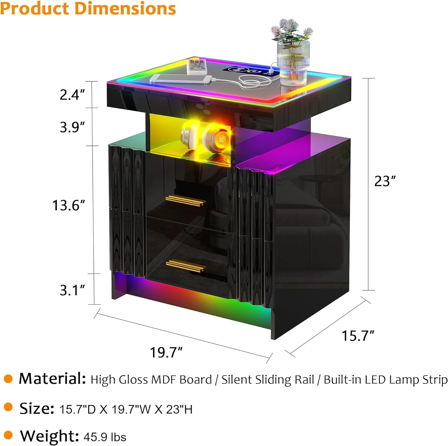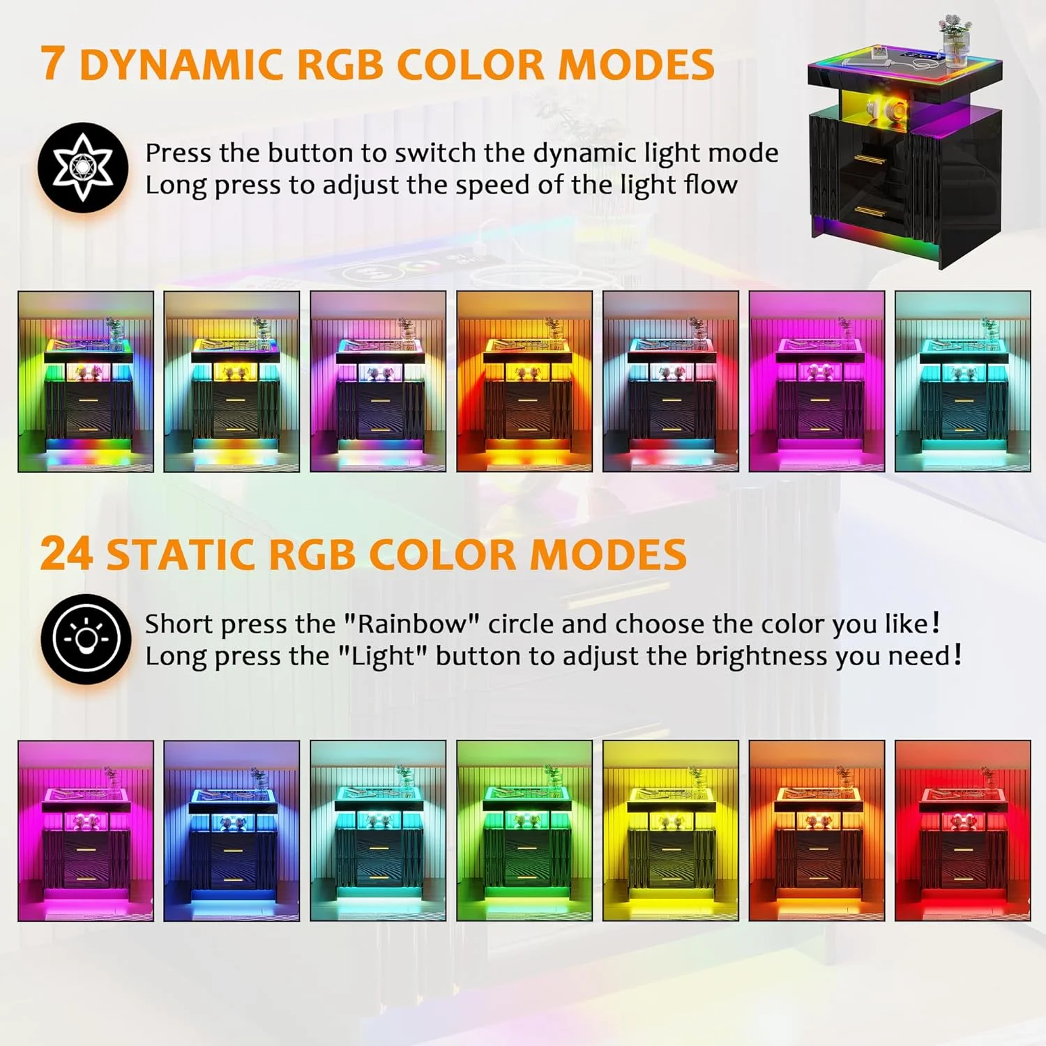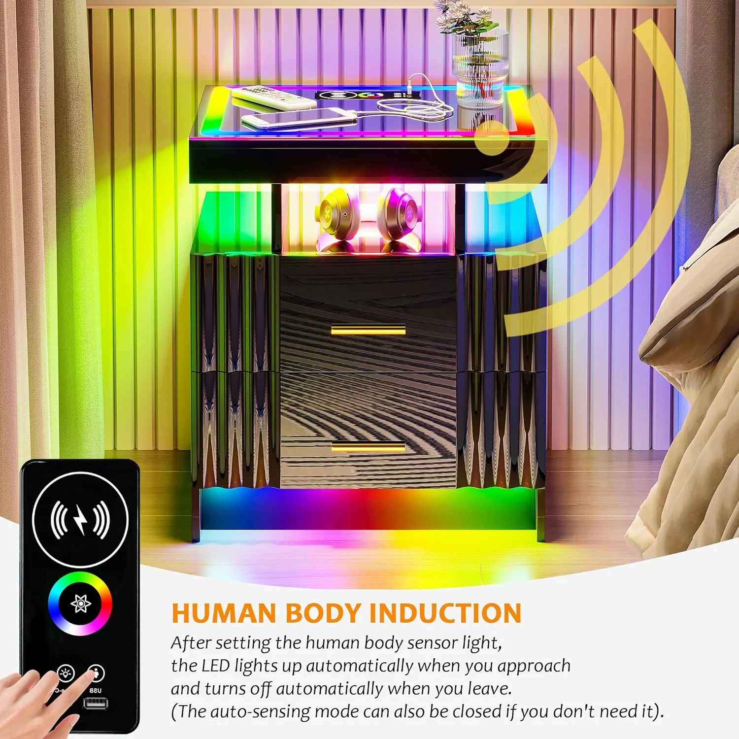 U-ToBe Nightstand with Charging Station, White LED Night Stand with 2 Drawers, High Gloss Bedside Table with Auto Sensor 24-Color Lights/Wireless/Type-C/USB Charging for Bedroom