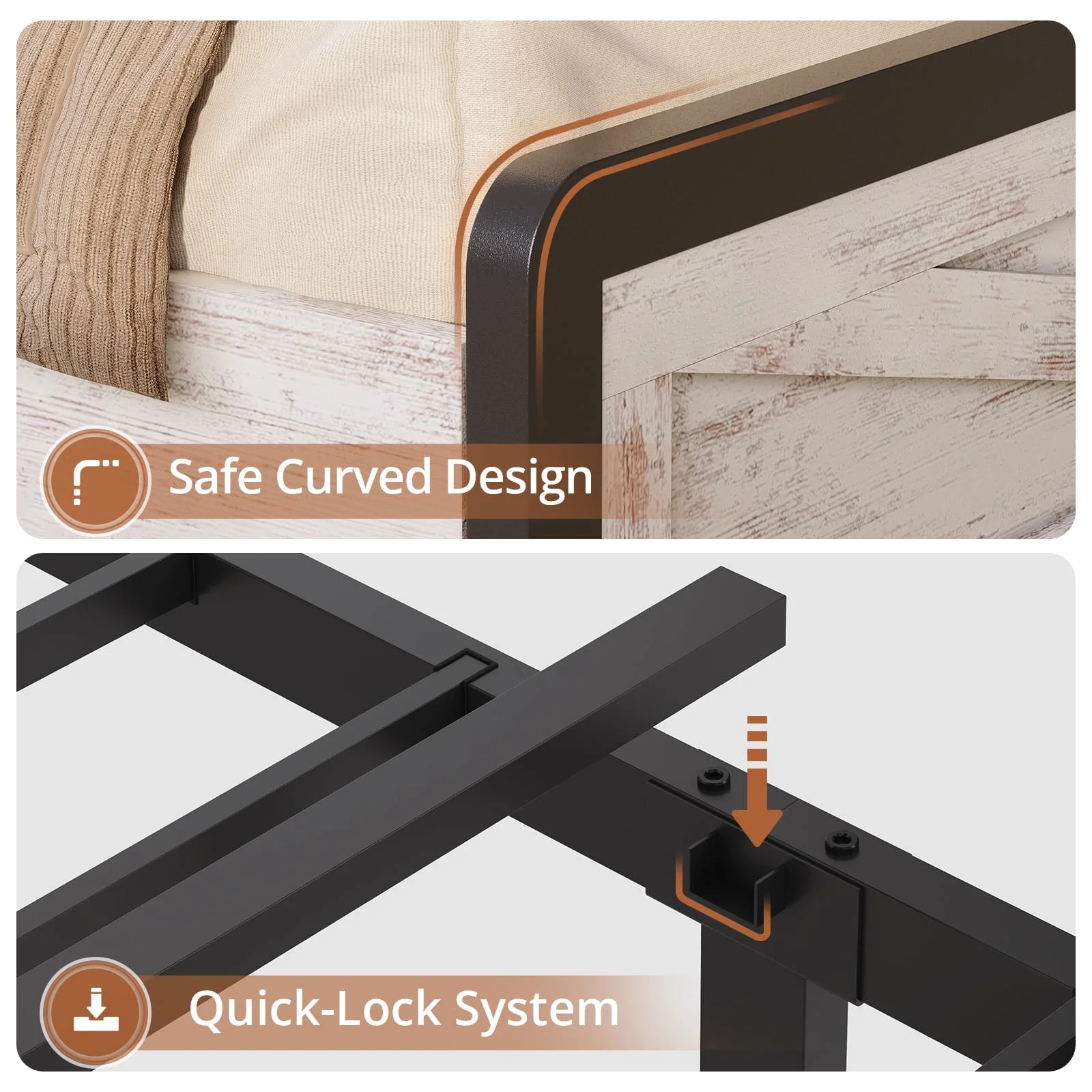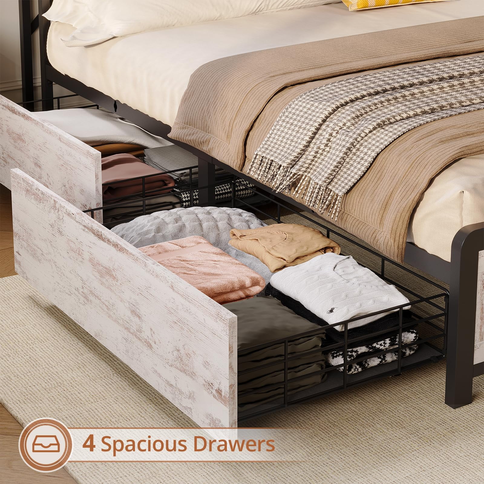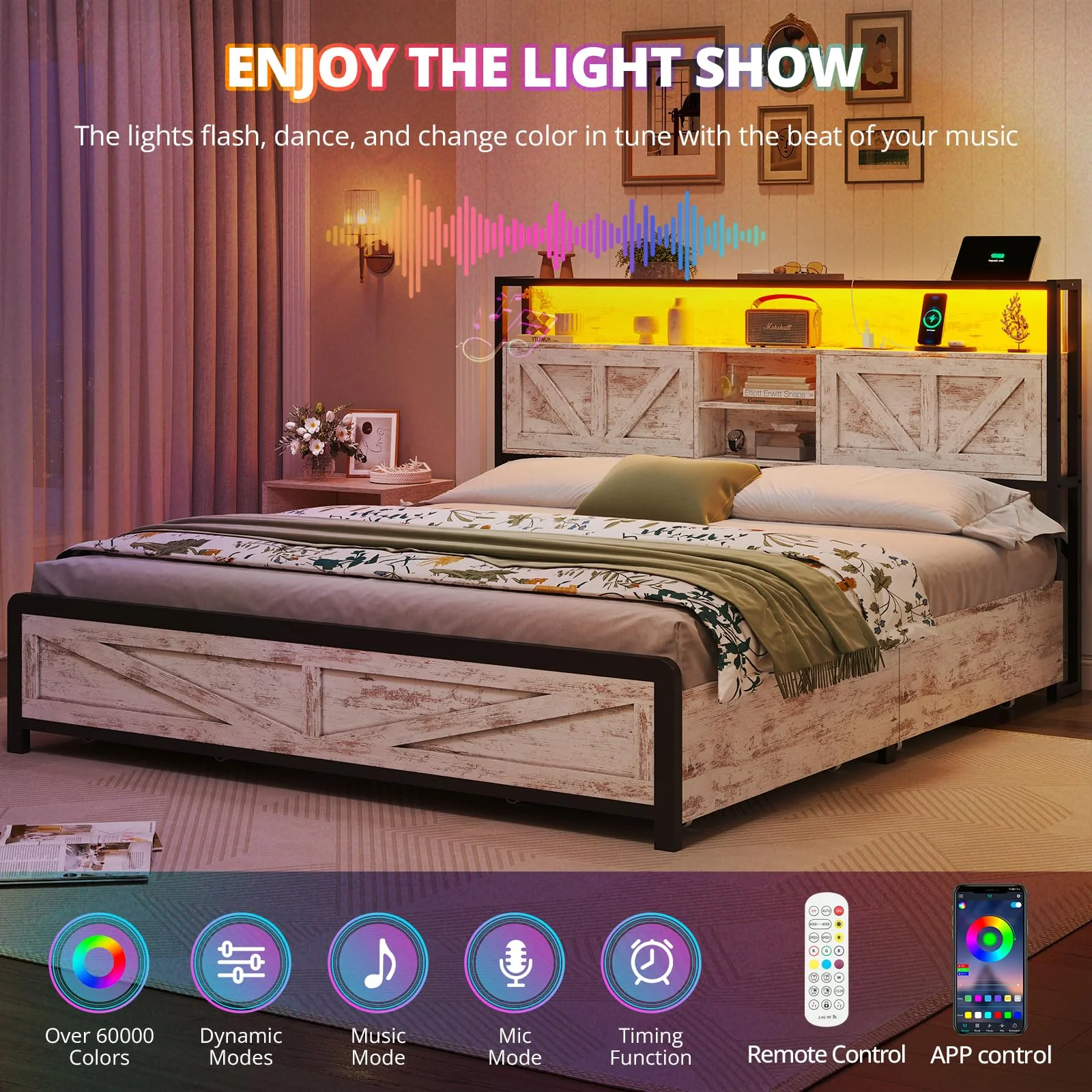 Full Size Bed Frame with Storage Headboard & 4 Drawers, Headboard with Hidden Storage, Farmhouse LED Bed Frame with USB-C/A Charging Station,Washed Oak Grey