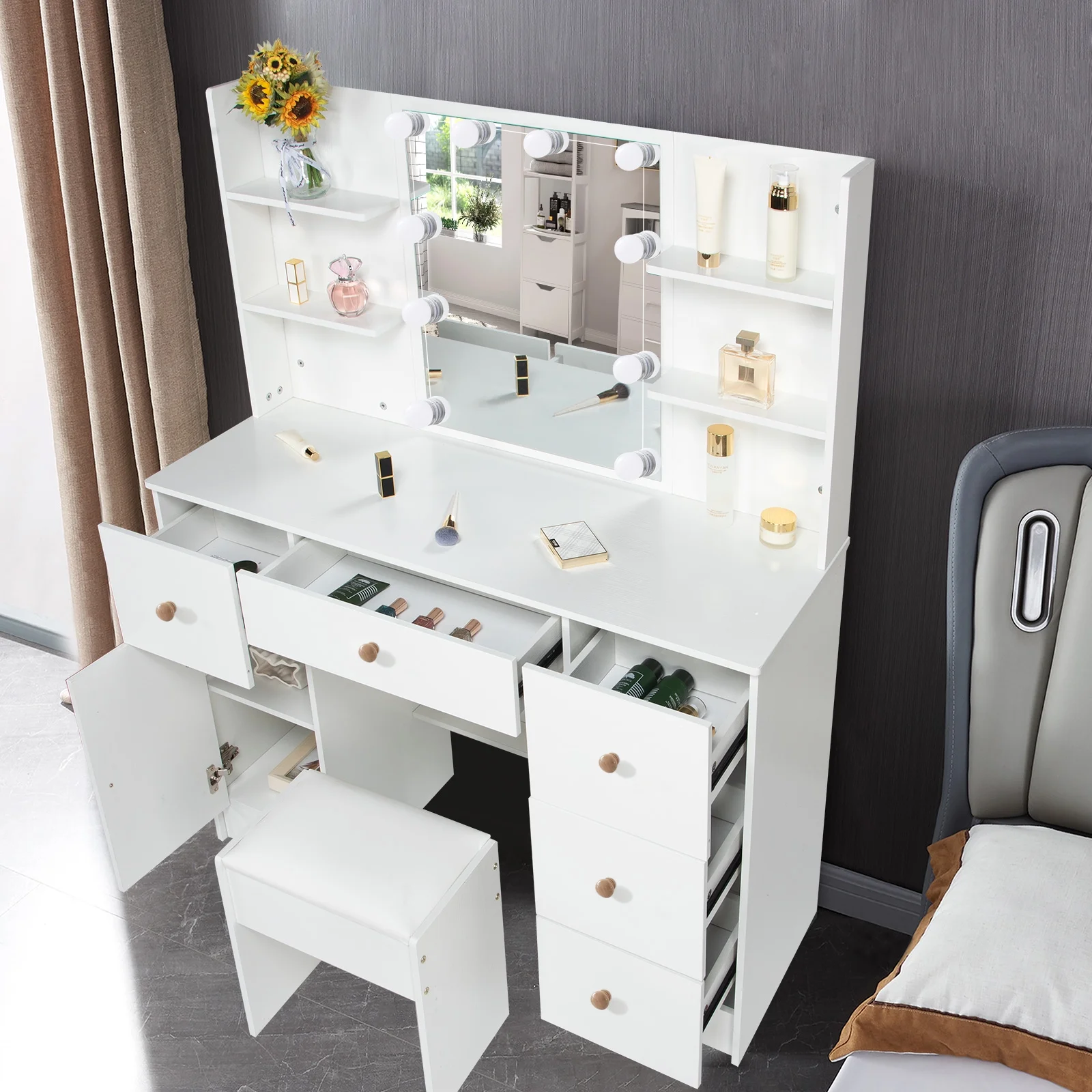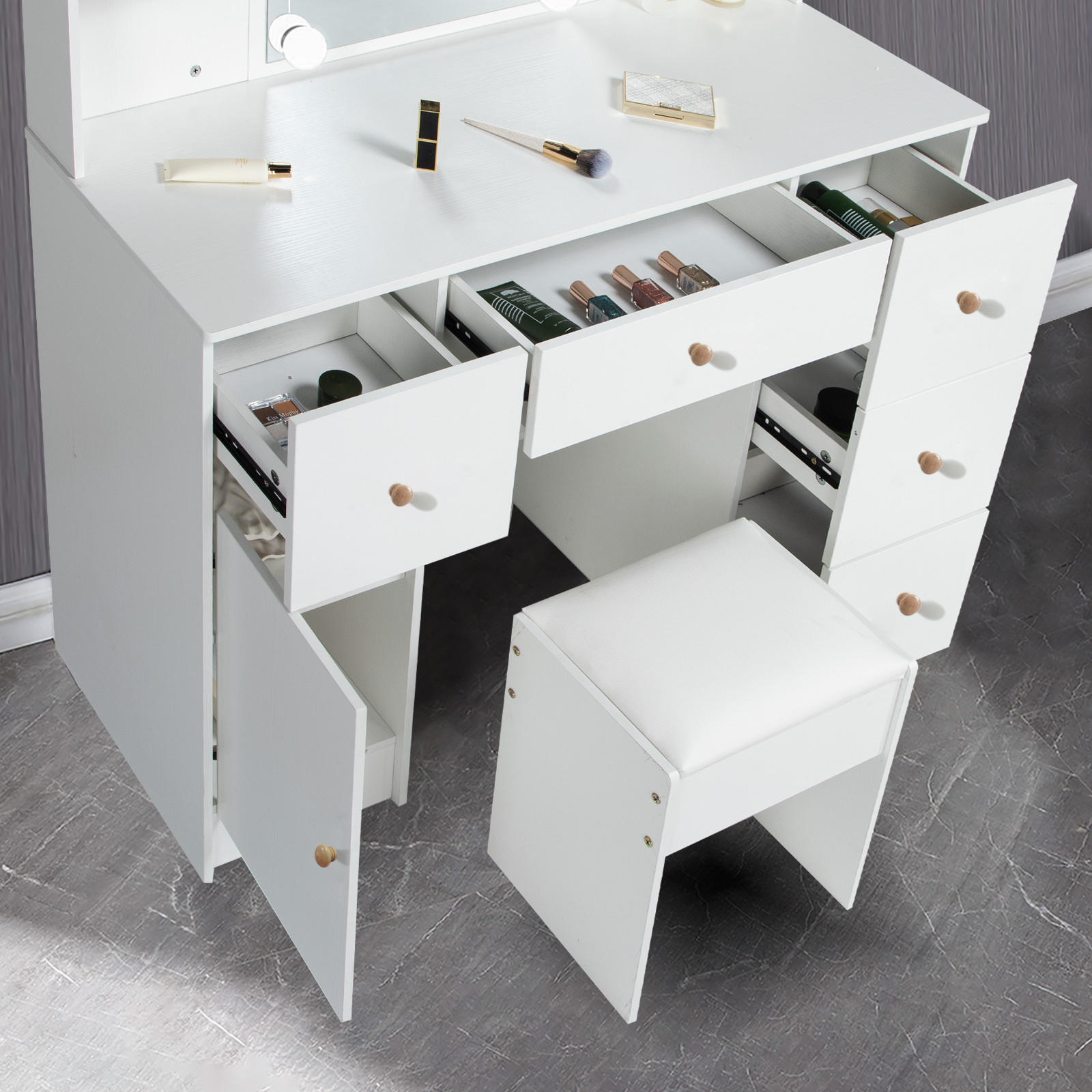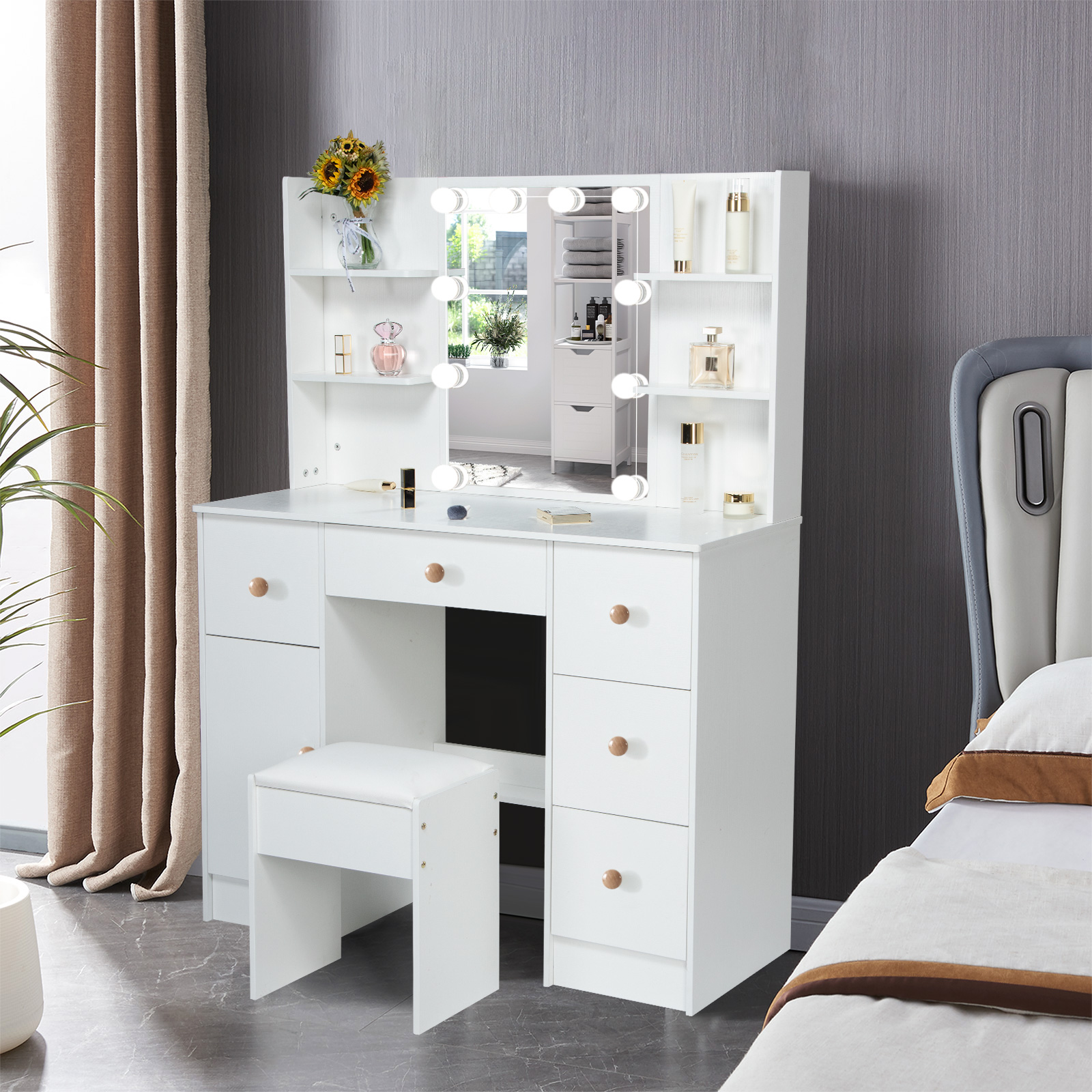 Yamissi Makeup Vanity with Cushioned Stool Vanity Set with Mirror and Lights for Bedroom Small Dresser, White
