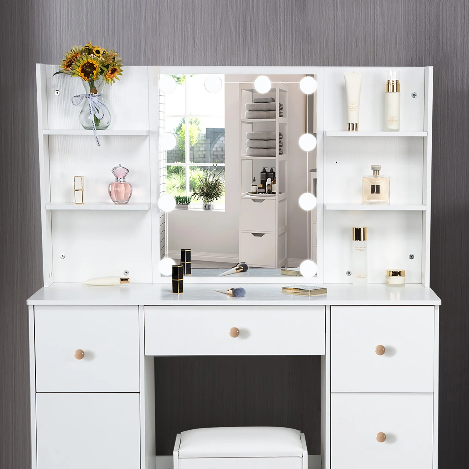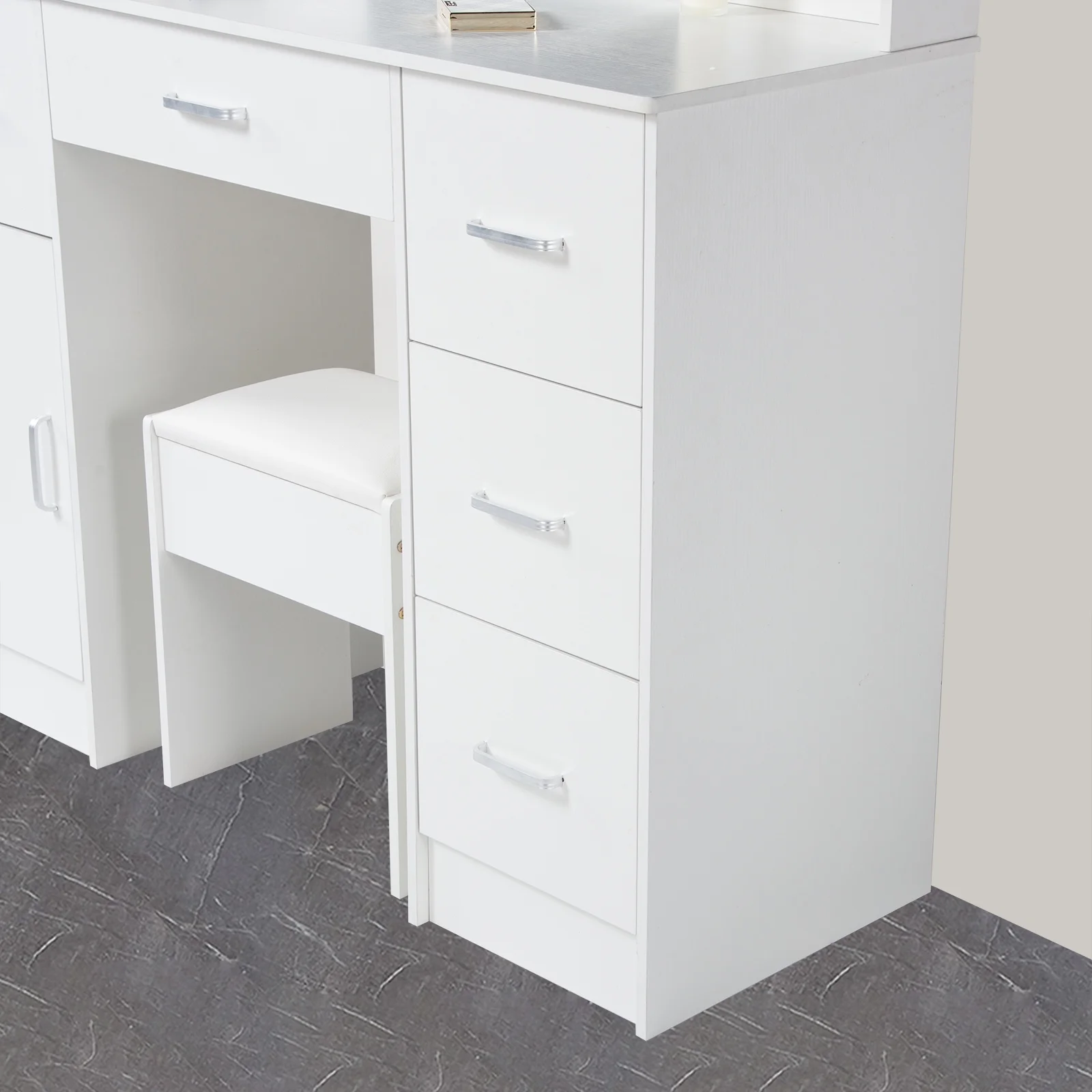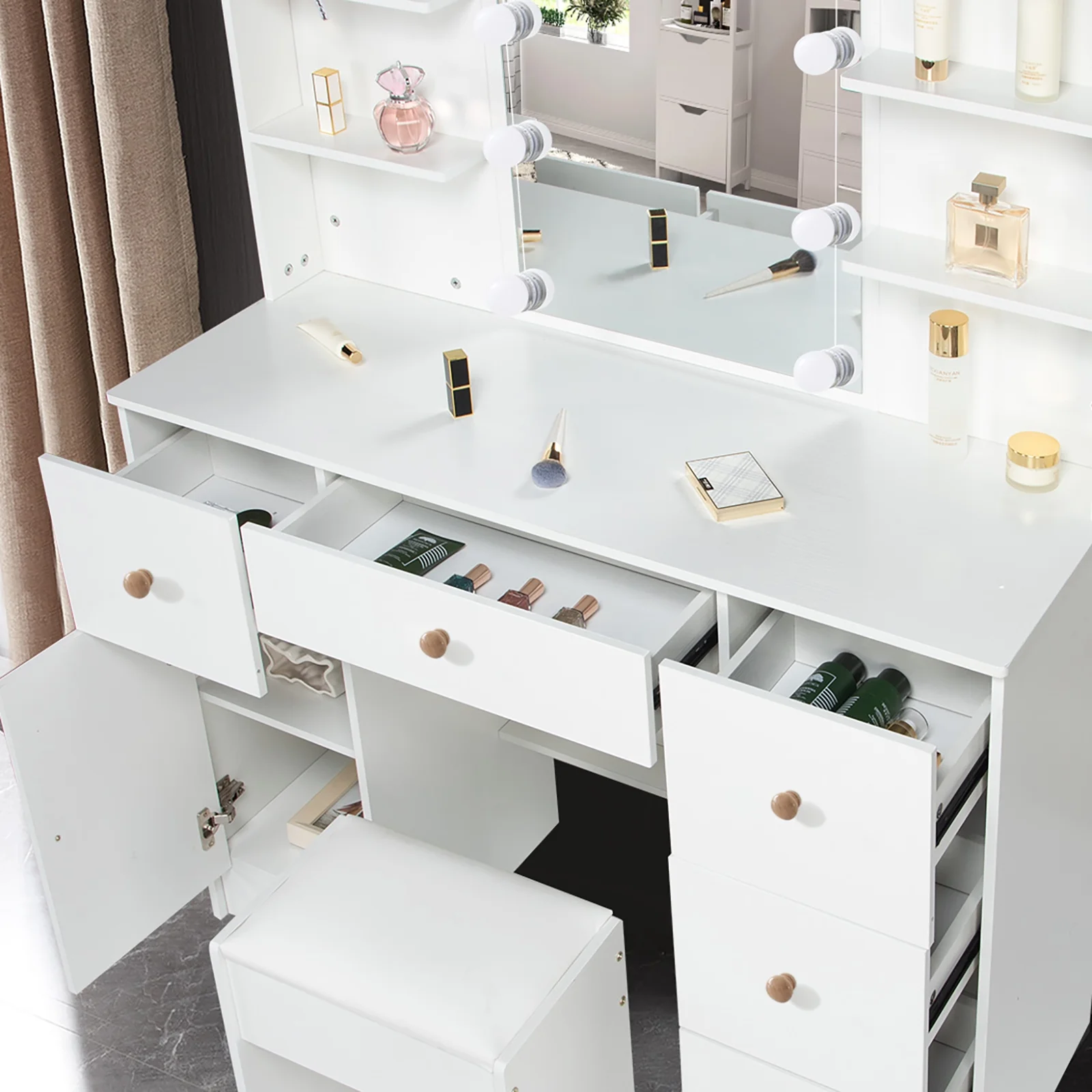 Yamissi Makeup Vanity with Cushioned Stool Vanity Set with Mirror and Lights for Bedroom Small Dresser, White