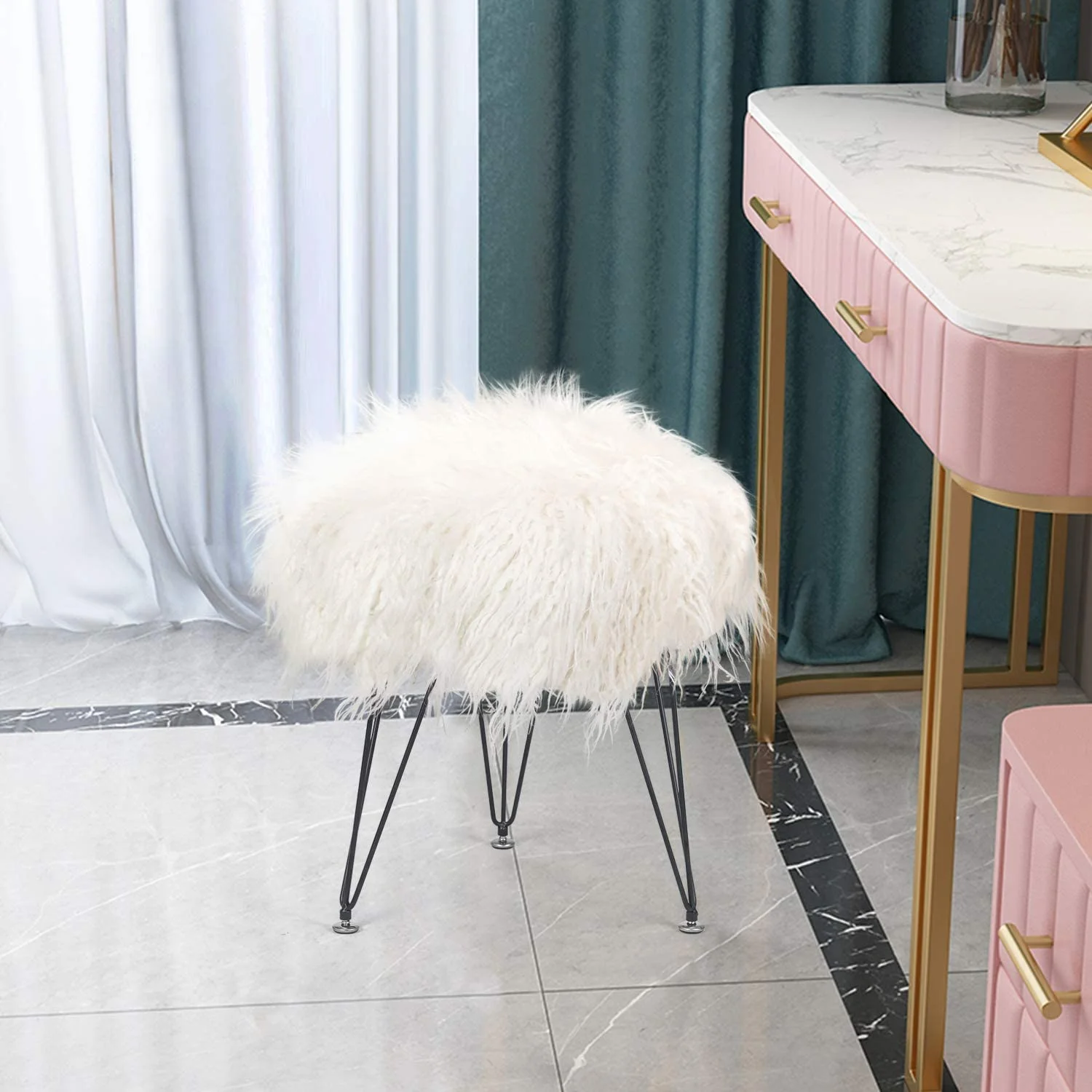 Homebeez Faux Fur Ottoman Footrest Vanity Stool with Metal Legs White