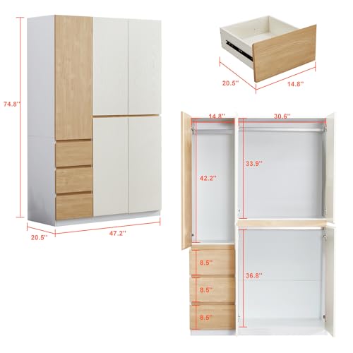 74" H 3 Doors 2 Drawers White Bedroom Wardrobe Armoire Closet Freestanding Clothes Storage Armoire Organizer with Hanging Rod Shelves Clothes Cabinet for Bathrooms Clothes Storage