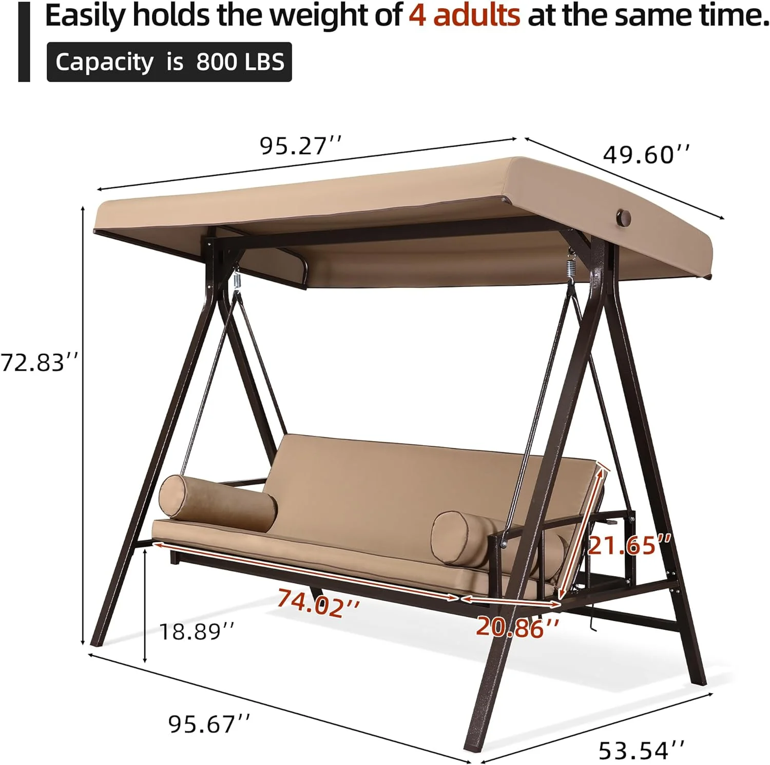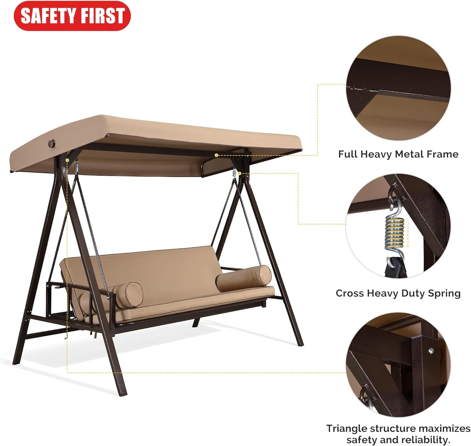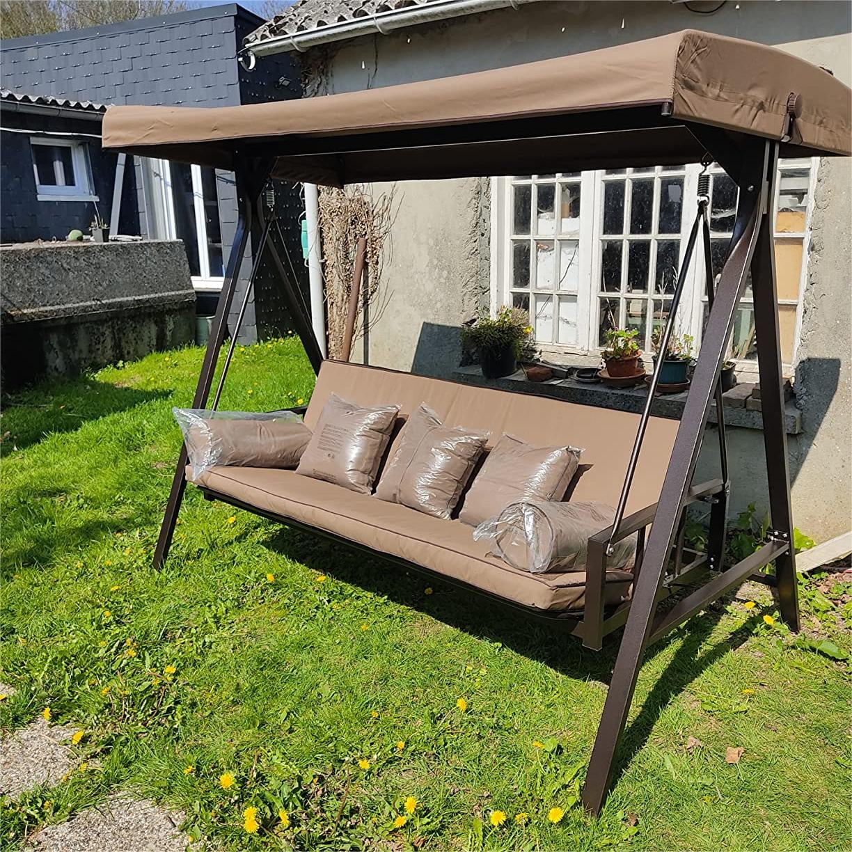 PURPLE LEAF Outdoor Patio Porch Swing Adjustable Backrest, 3-Seat Swing Chair with Weather Resistant Steel Frame for Backyard Front Porch Lawn, Cushion and Pillows Included, Beige