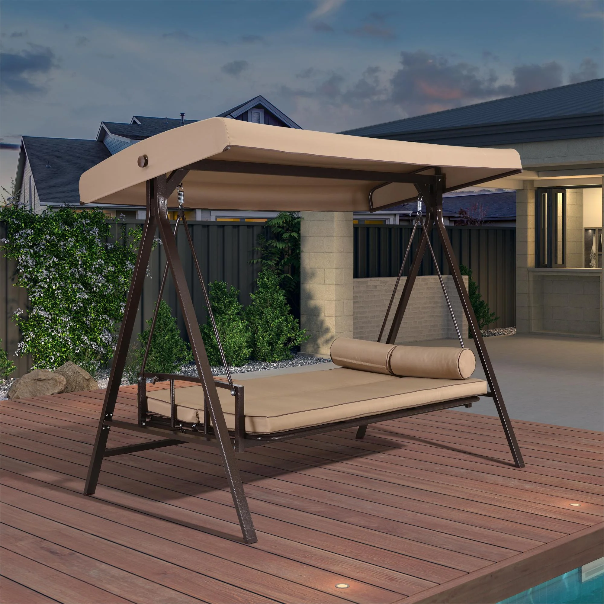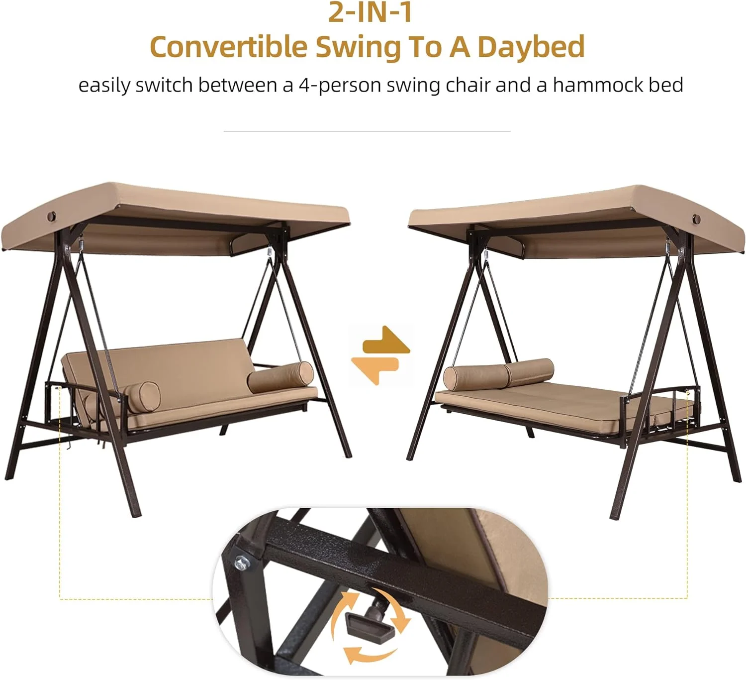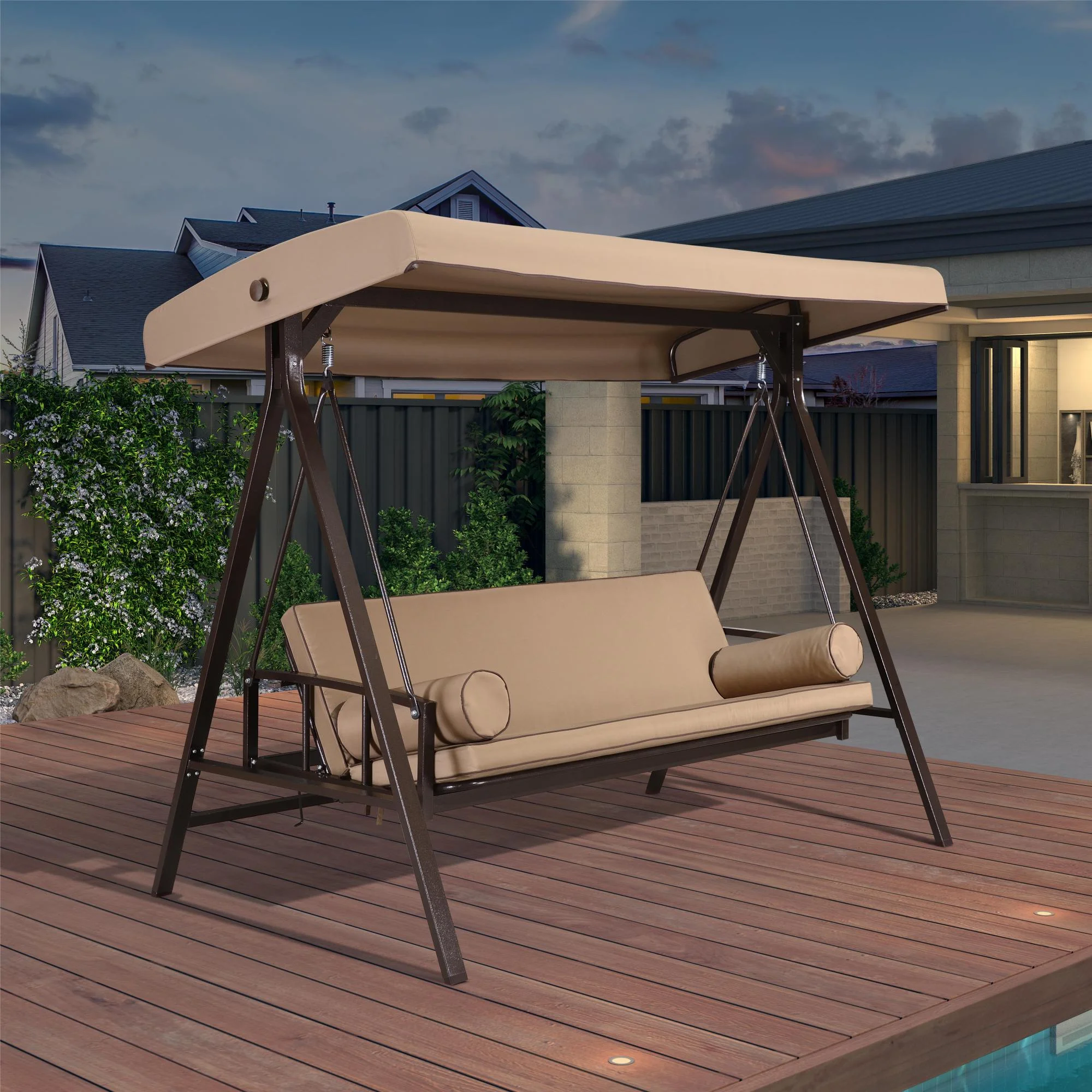 PURPLE LEAF Outdoor Patio Porch Swing Adjustable Backrest, 3-Seat Swing Chair with Weather Resistant Steel Frame for Backyard Front Porch Lawn, Cushion and Pillows Included, Beige