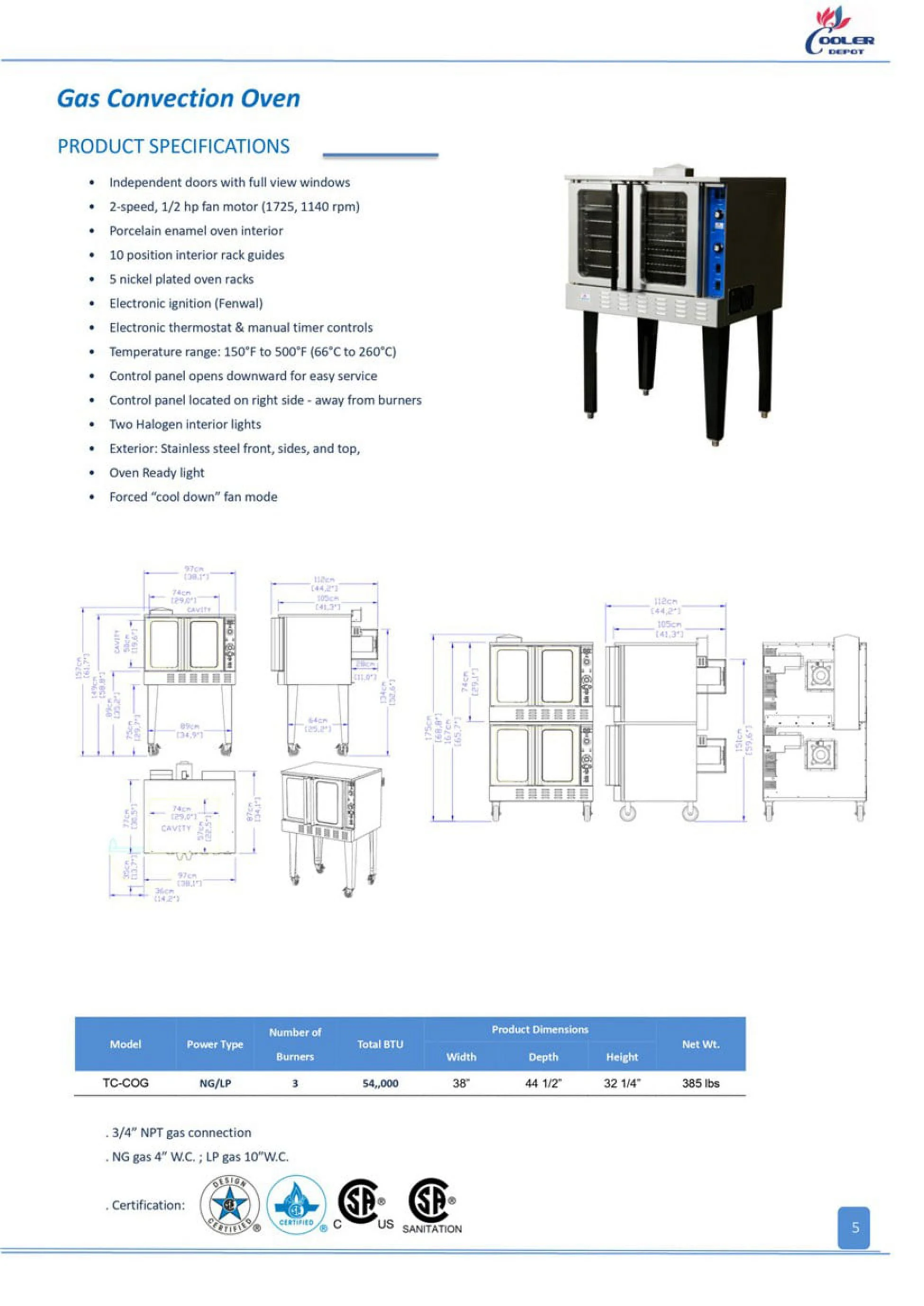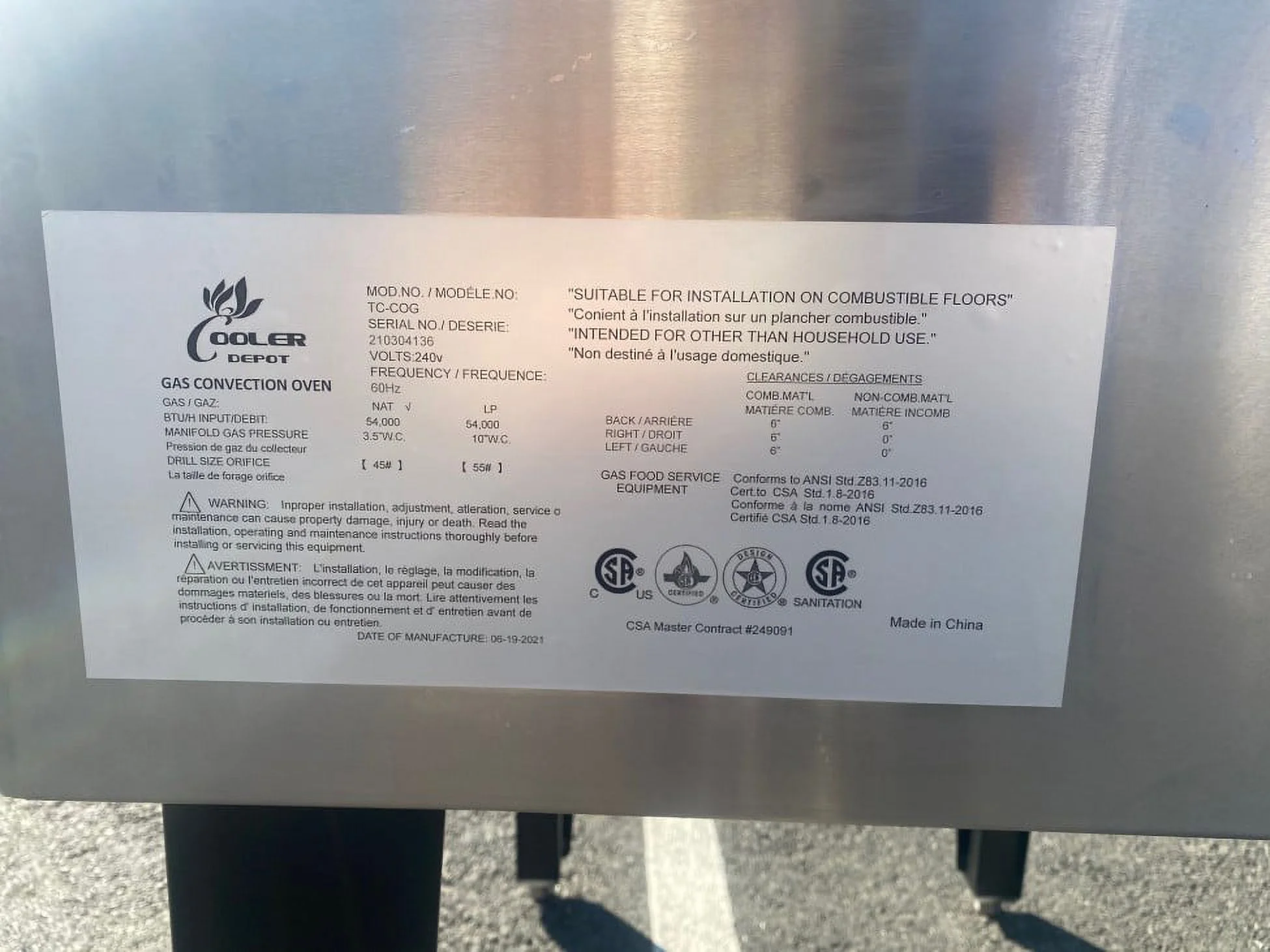 Commercial Convection Oven, Natural Gas or Propane, Single Deck, Four Legs, Restaurant Kitchen Bakery TC-COG-1