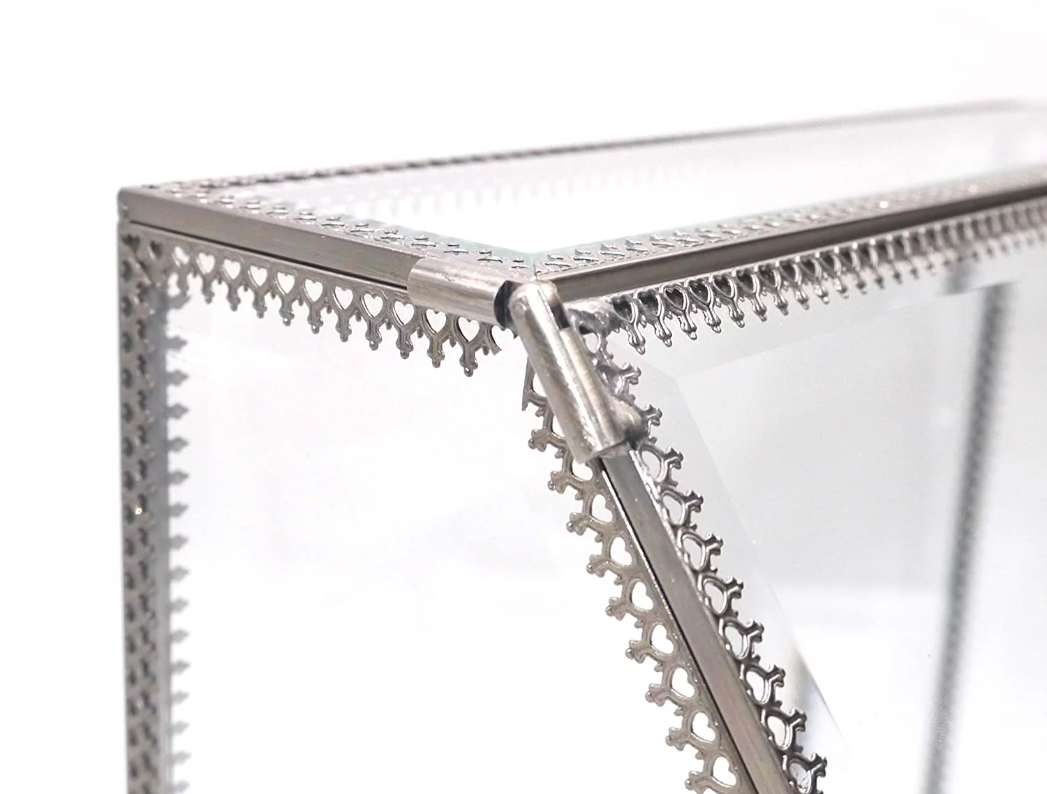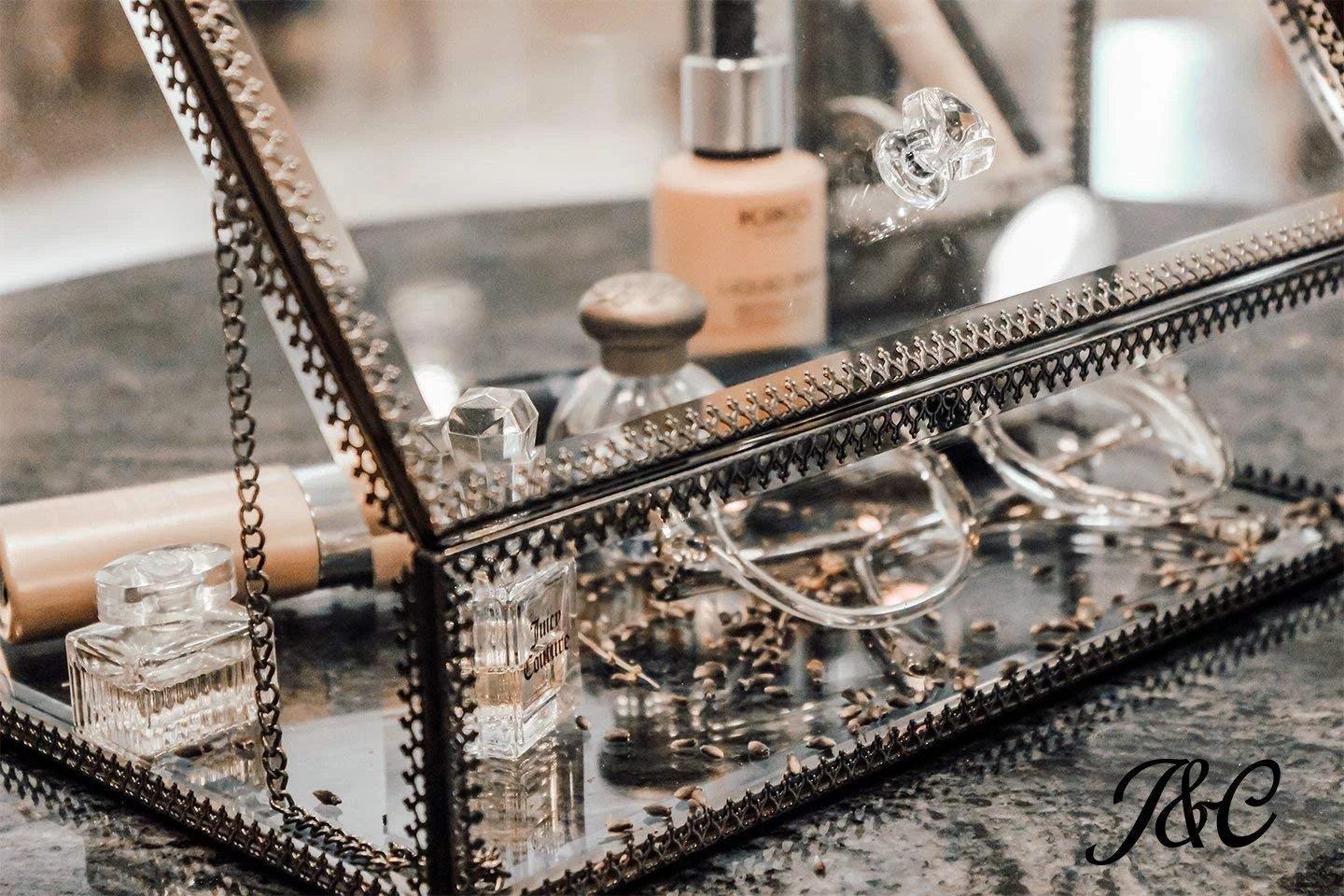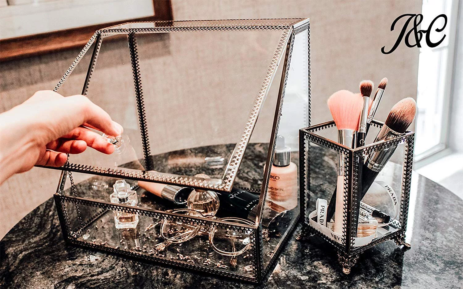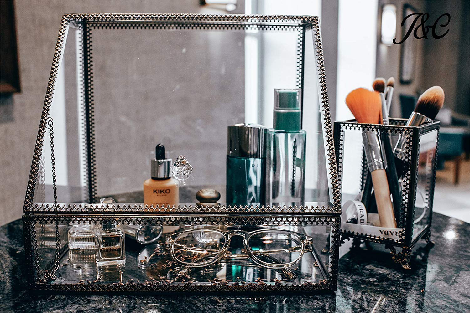 JC MAN Makeup Organizer Glass Large 4 Tier Brass Metal Cosmetic Storage Cube for Makeup, Brushes, Perfumes, Skincare (Trapezoid)