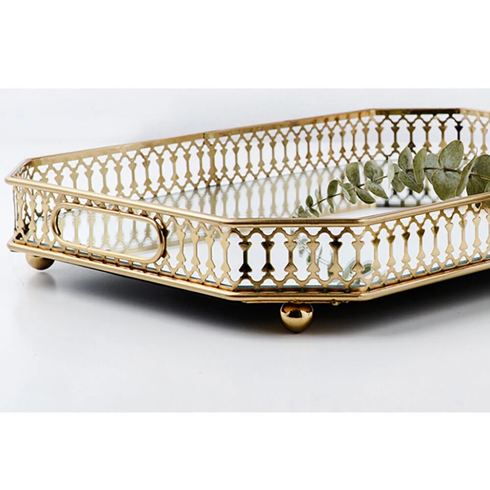13.78" Vintage Glass Metal Trays Mirror Vanity Perfume Organizer Dresser Bathroom Octagon Tray Home