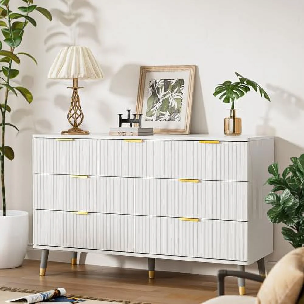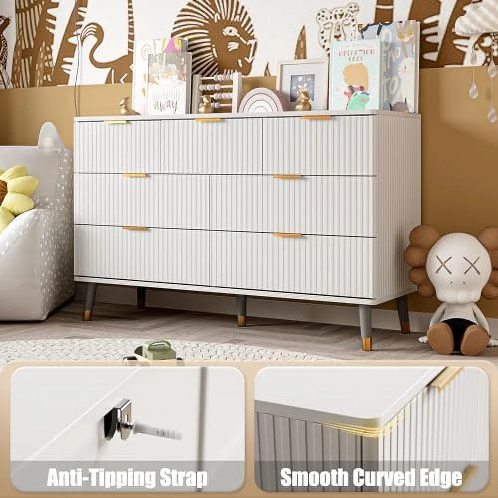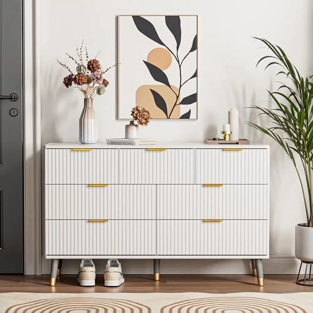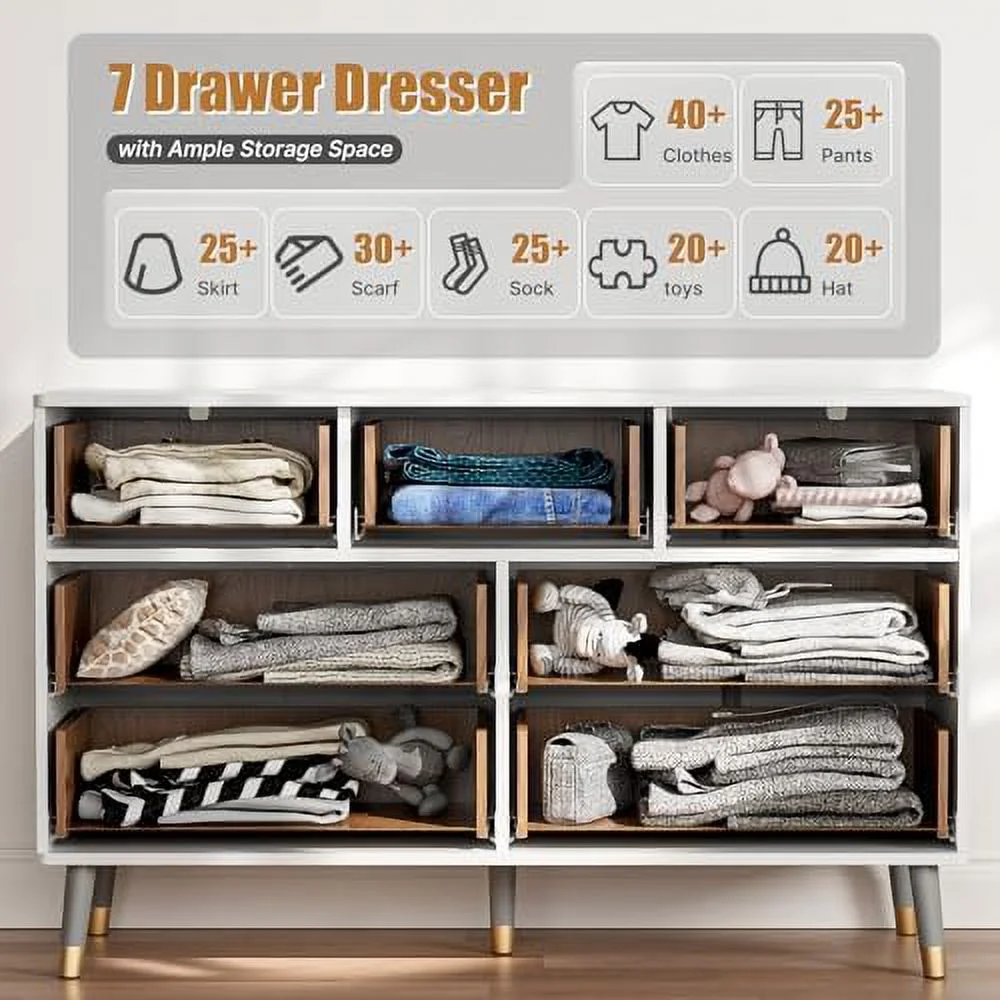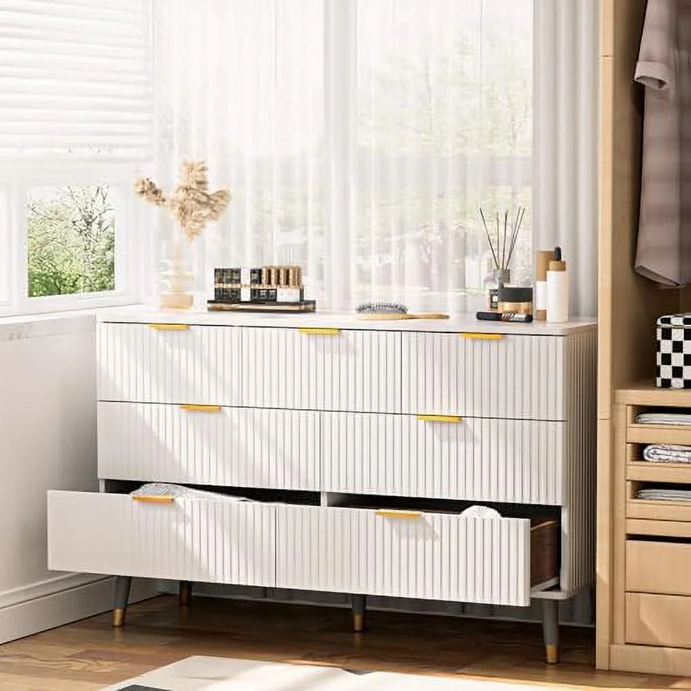 7 Drawer Dresser for Bedroom Fluted White and Gold Dresser with Curved Profile Design Dresser Wood Dressers & Chests of Drawers for Closet Bedroom Hallway