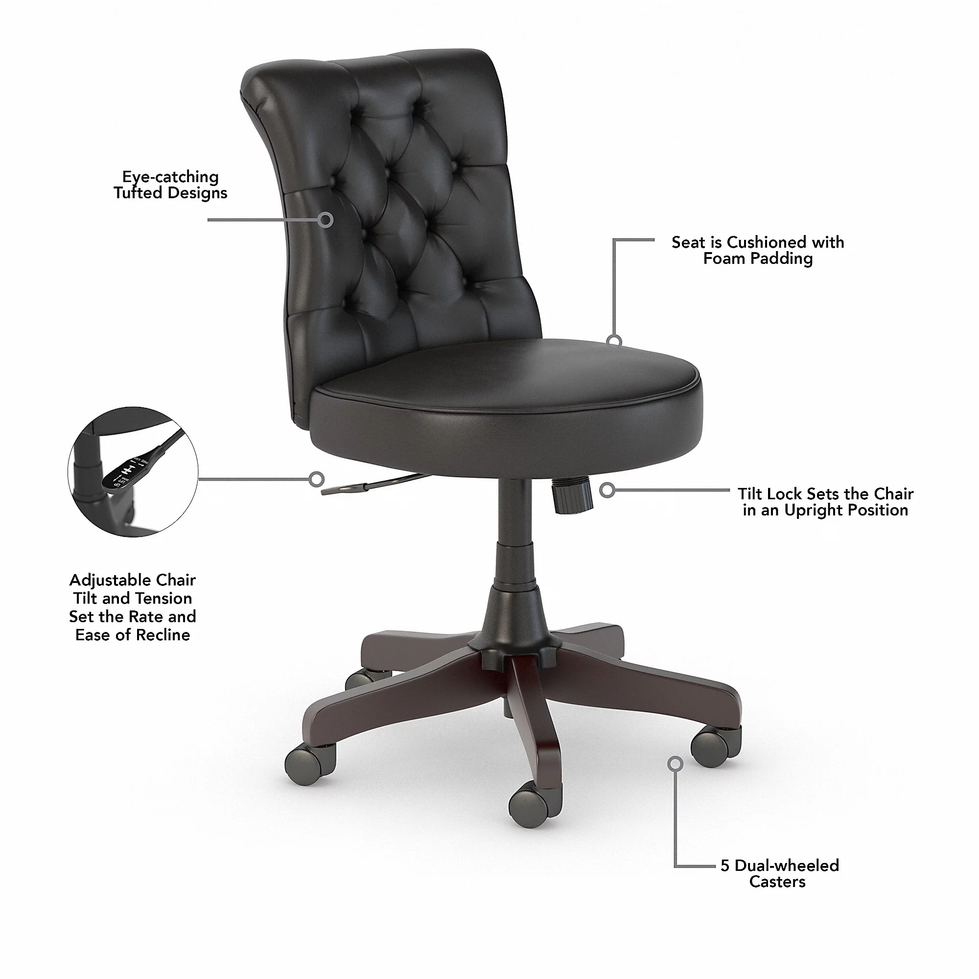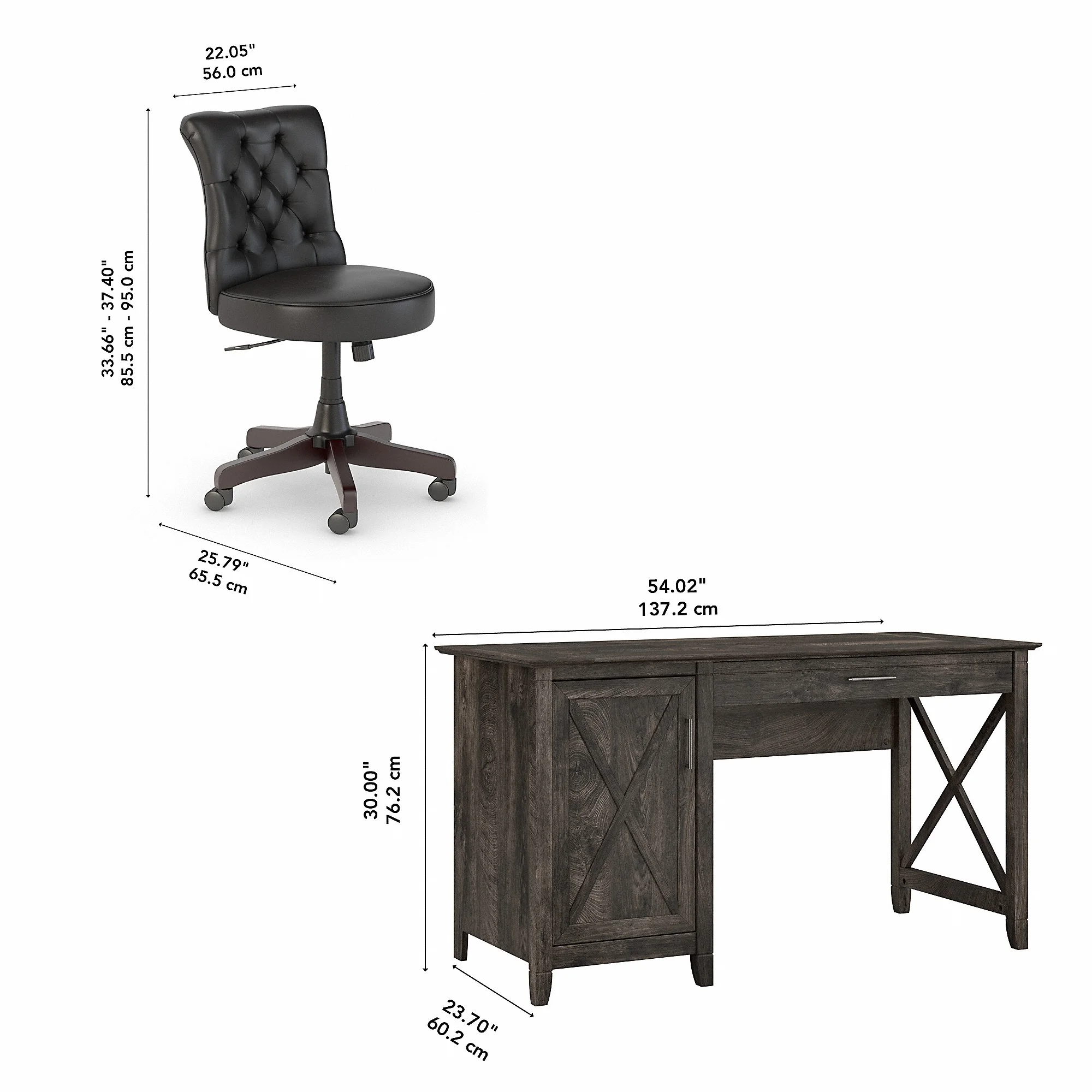 Bush Furniture Key West 54W Computer Desk with Storage and Mid Back Tufted Office Chair in Dark Gray Hickory