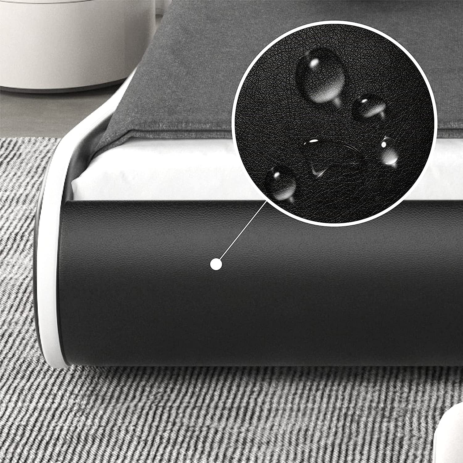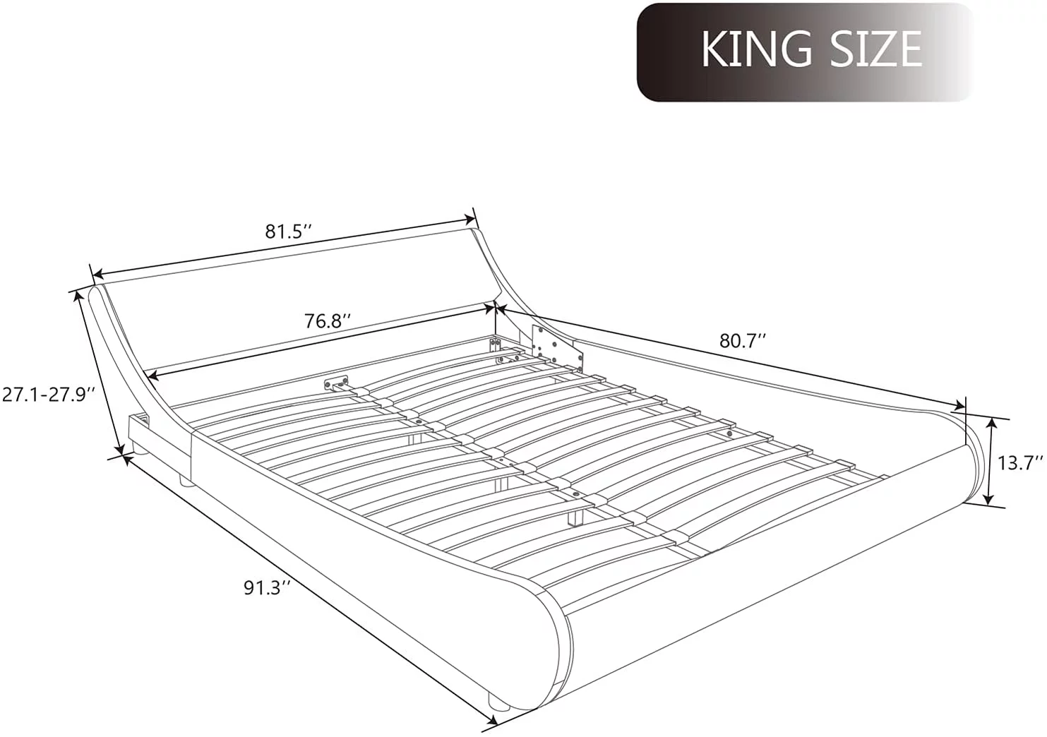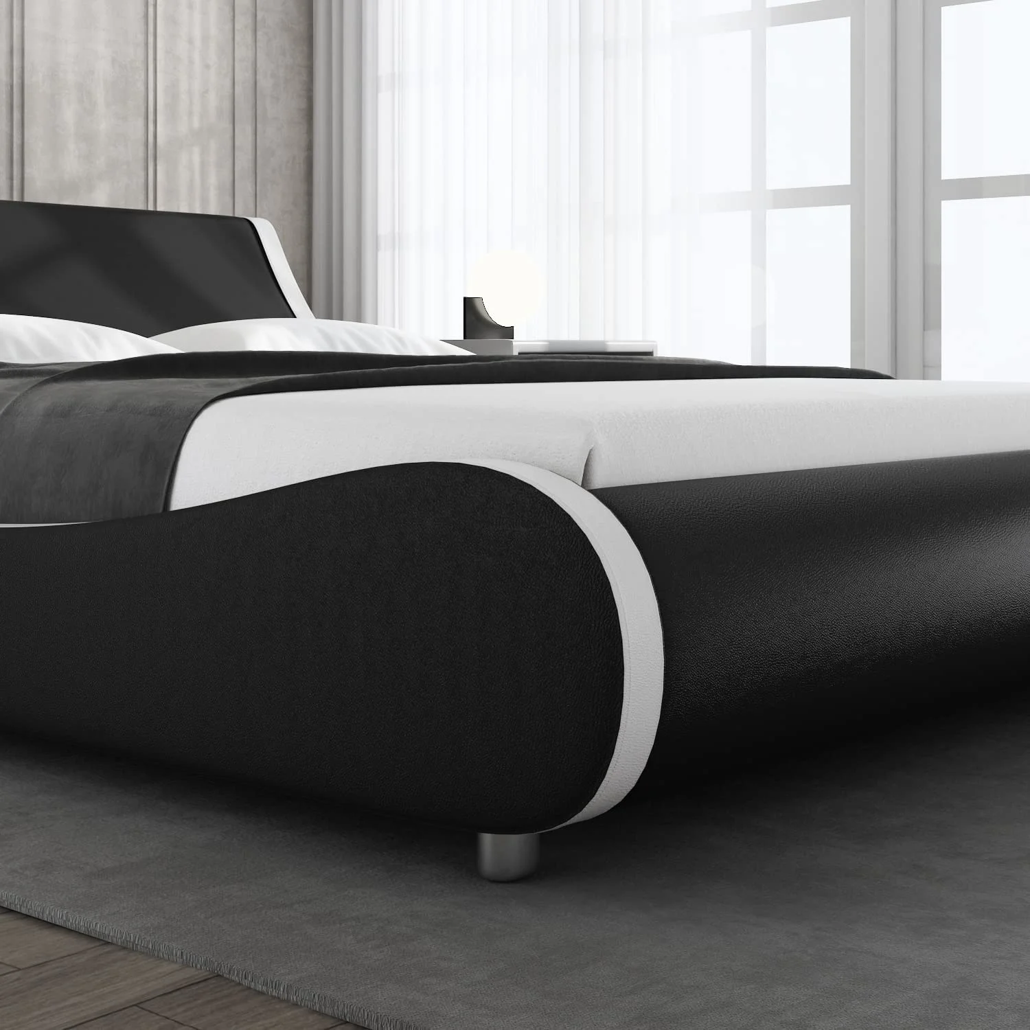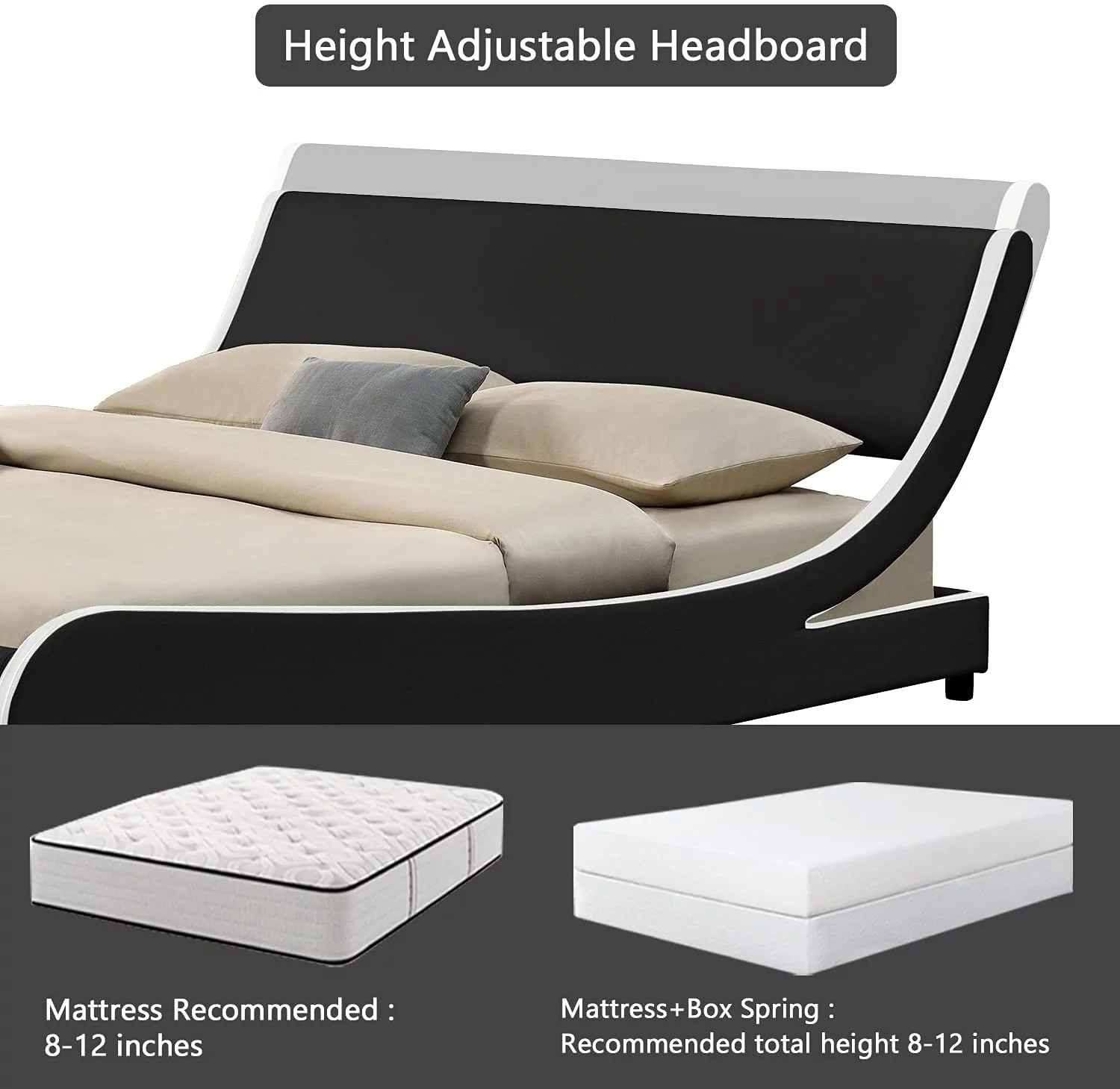 Allewie Modern Low Profile Wave-Like King Size Platform Bed Frame with Leather Curved Adjustable Headboard, Black and White Border