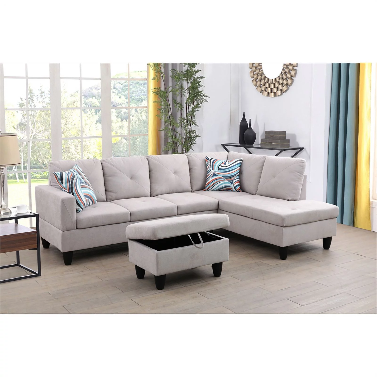 Pemberly Row L Shaped Gray Couch w/ Storage Ottoman(Pillows Included) Microfiber