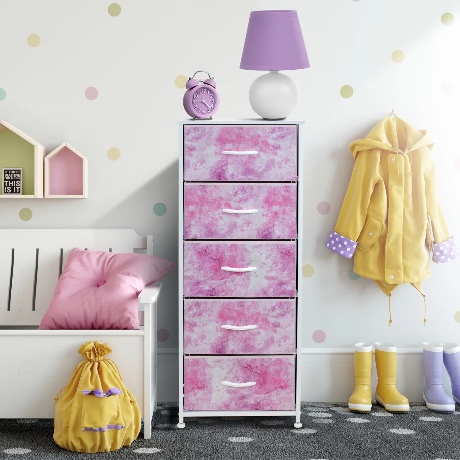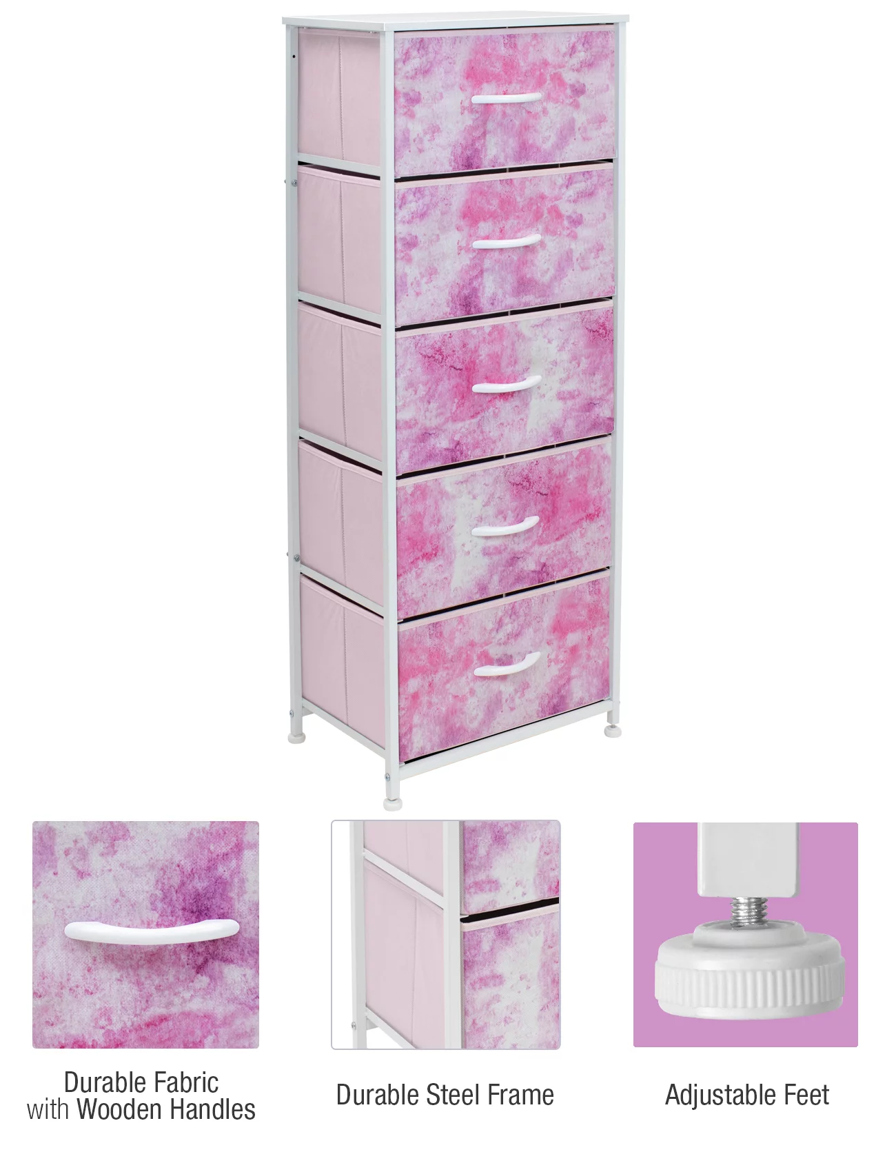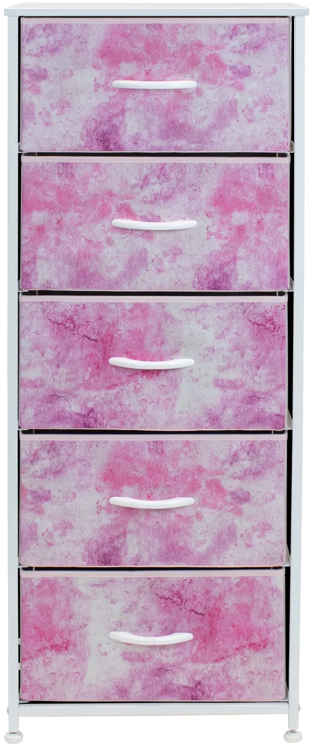Sorbus Fabric Dresser for Kids Bedroom - Chest of 5 Drawers, Tall Storage Tower, Clothing Organizer, for Closet, for Playroom, for Nursery, Steel Frame, Fabric Bins - Wood Handle (Tie-dye Pink)